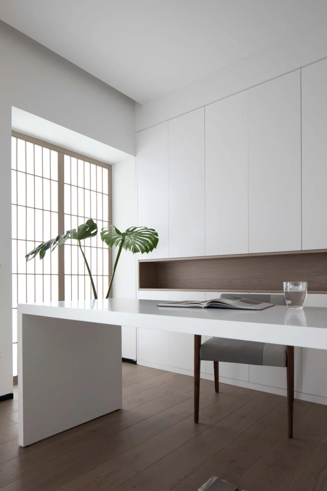 作为书房使用,素净自然的木色与白色更能让人获得深层次沉浸式阅读体验,由小格子分割组成的木格栅淡化了边界感,原木、玻璃、金属在空间内共同演绎素雅拙朴的美感。