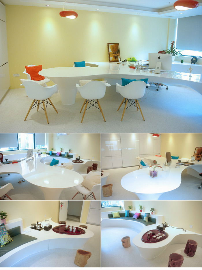 田总办公室里继续呼应着水滴的灵动,让办公室不再是刻板的、压抑的面孔,在这里思维将变得更加轻灵,创新的思想与设计在这里激荡……