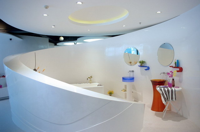 流水线的造型是整个空间的主调,从吧台、展台、各区隔空间到地板、天花处处如行云流水,置身其间彷佛徜徉于海洋世界。