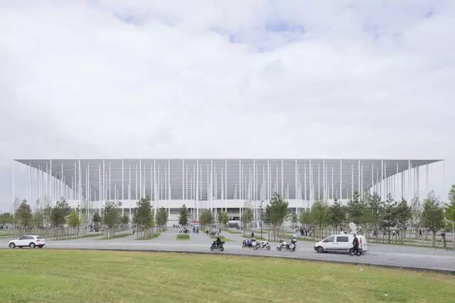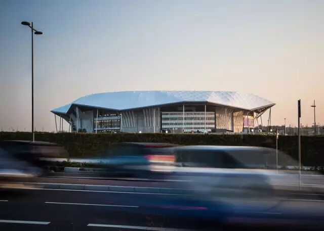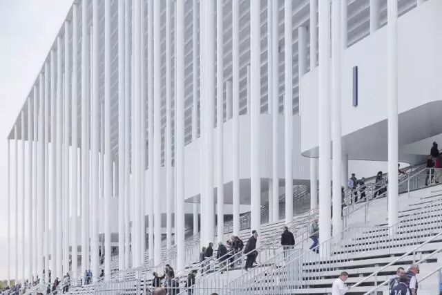同时将观众席从 6 万扩展到 6.7 万个。白色的屋顶沿着已建的座位高低起伏,呈现出波浪的形状。从上往下看能看到像瓦片一样搭建起来的屋顶,有明暗阴影的变化,“就像是一个海边上的贝壳”。