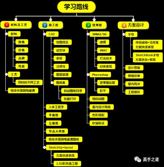 学习室内设计,修炼内功,没有捷径可走!该磕书磕书,该买教程买教程。现在太多的培训机构,为了营销宣传上的方便,只注重「形而下之」的软件技法教学或鼓吹,未深入到室内设计「形而上之」之道的根本。知识零散碎片不成体系,导致很多设计师学后提升很小甚至迷茫和困惑! 其实,设计思维能力培养才应该是学习的重点!只有具备了专业的室内设计思维后,你看待事物的方式才会改变,设计也就有据可循。比如你必须要学会:了解户主的生活,及行为习惯,来为后续设计的取舍留下依据。比如,懂得人体工程学的经验数据的计算方式,来指导你规划功能区间的布置。这是一整套的解决房屋宜居、 舒适的思维逻辑。只要解决了为什么要这么设计的问题,接下来的工作自然水到渠成,难道不是么? 学习室内设计的路线图 首先熟悉装修工艺及材料 室内设计的基装元素是建立在基础材料之上的,若不熟悉材料、工艺,室内设计也无从谈起,所以施工工艺以及材料这部分知识,是必学的第一重要的知识硬货。 搞定了水电气、天花吊顶、电视墙、地板砖等这些基础设施后,对于不同风格的软装搭配的学习更应该长期跟进。 其次才是软件技法 软件技法的修炼(CAD、3DMax或SU),在有了一定材料和施工工艺的知识累积后,可逐项的去丰富你的设计理论、拓展设计周边的文化知识。比如艺术简史 、风土人情、软装搭配等方面的知识,这都是能为你做好室内方案设计开阔思路的点。 简而言之,无论你是买书来自学,或是购买网络教程,您都可以参考下面的自学路线,来系统学习室内设计,自学期间要以效率为王、坚持耐力为本,正所谓耐得住寂寞才能守得住繁华! 最后必须懂得室内方案设计 通过这一模块知识的学习,其首要目的是建立必要的室内设计思维,要掌握:宅数据分析,住宅空间原理、人体工程学原理、科学风水、空间布置划分、不同装修的风格的特征等知识点。