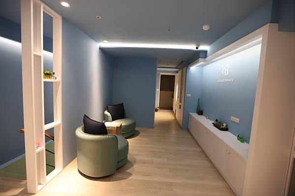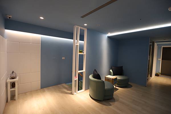 「女子SPA馆」,二楼设计以蓝色作为主轴,运用自然光影缔造时尚低调的现代风格,呈现纯净舒适感,让顾客倍感尊荣,体验宾至如归的待遇,颜色与灯光做出层次变化,规划舒适的使用情境,让每位消费者皆可在此卸下压力,尽情享受身心灵飨宴
