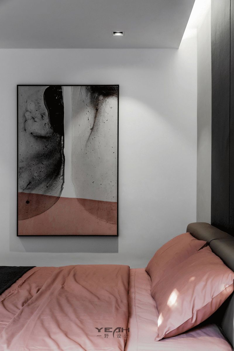 主卧灰红床品和画的穿插,打破色彩元素的单一性,带来一抹清新感。