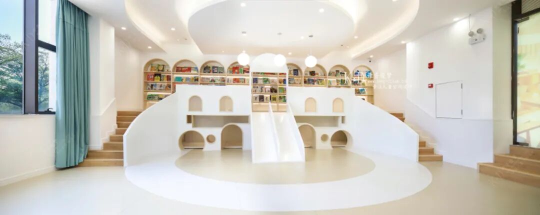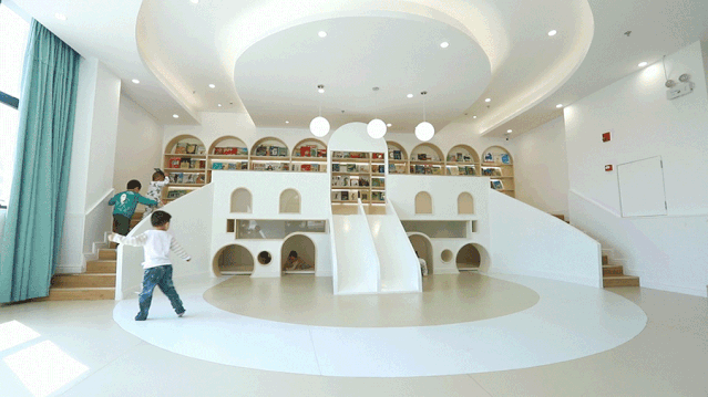 ▲绘本室孩子喜欢的滑滑梯和通透明亮的书架,你都不用刻意去教孩子,他们会通过尝试和摸索,潜移默化的获得知识。