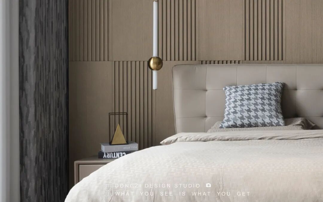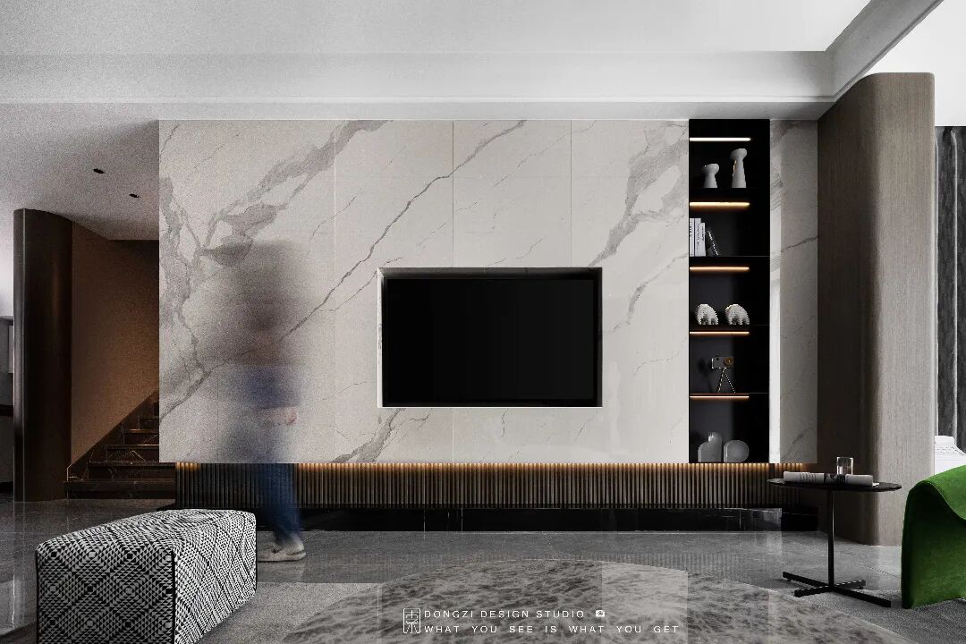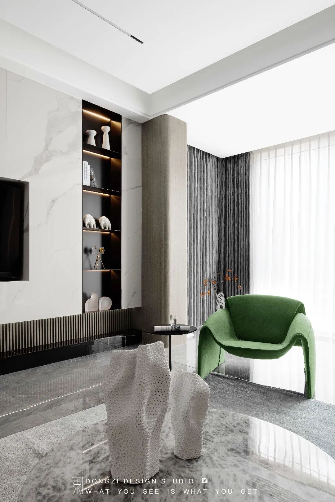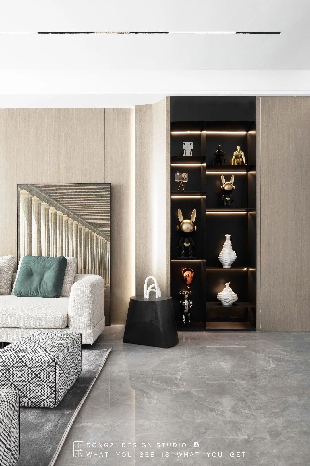 那么,设计师所创造的仪式感是什么?是如《栖》的意境,是勇于触摸生活本质,并永葆敬畏与热爱,更是内心与世界之间的一座桥,让你更专注日常的美好。 视线缓缓挪入客厅,整个空间没有任何隔断,大敞开面的格局为设计铺垫了绝美的底色,成为最有力的背景。房主为一对年轻的夫妇,他们对于整体的设计有着极为明确的要求:极简与艺术共存的高级感,个性与品质并行的舒适感。 于是,我们看到了《栖》,看到了如水磨石纹理的地砖,看到了经过反复多次修改的木作装饰,看到了任何细微之处都被精心对待,或许我们可以说这是出于一个设计师的职业修养,但更重要的是,设计师看到了一个家的需求,从设计、从家具、从配饰,为这个家的不断生长储备着充足的养分。 一个优秀设计作品的背后,透露出设计师与业主之间的默契与信任。因为对生活的敬畏与热爱,一切都焕发出新的意义,大到空间结构、风格元素、稀有材质,小到地毯、花瓶,是设计,但更是骨子里的坚持,坚持对美的不懈追求,坚持对每一个“家”负责到底!