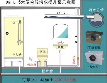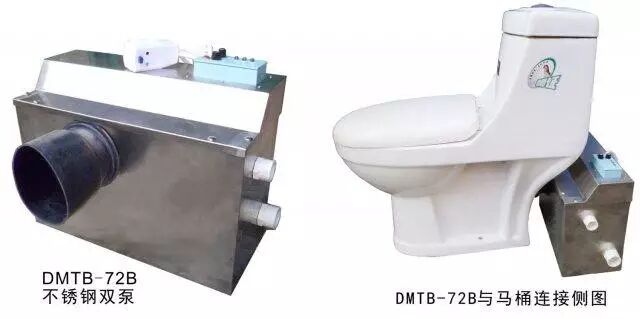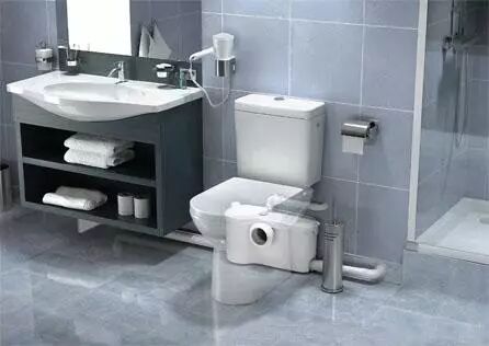 五、电动粉碎提升排污泵 主要适合地下室卫生间、老房或远距离改造卫生间位置的情况下,能有效的起到粪便输送作用,解决远离污水处理管道问题。泵机装有电动离心粉碎泵,其在高速运转时产生的负压,将已磨碎成液态状粪便、手纸和水吸入负压室通过连接的排污管道排出。