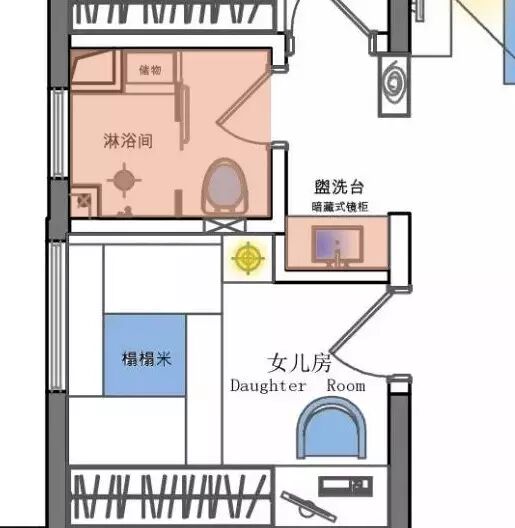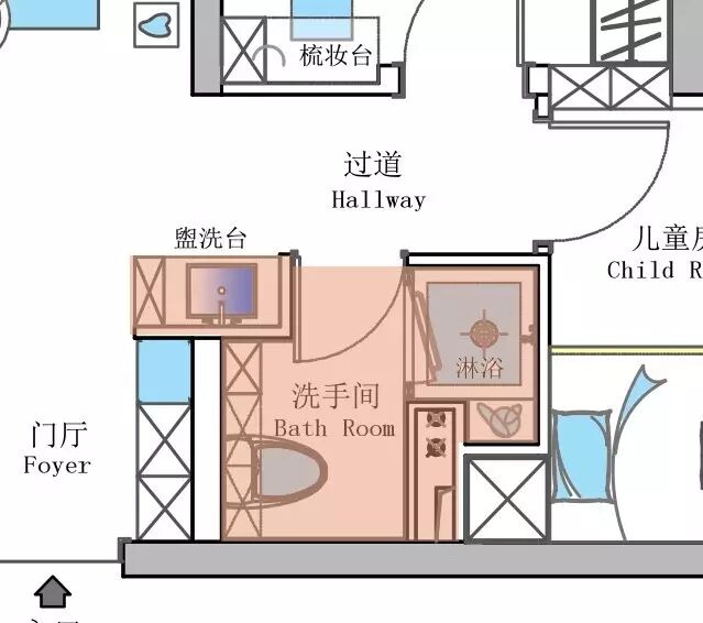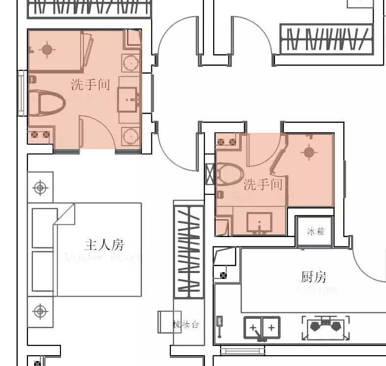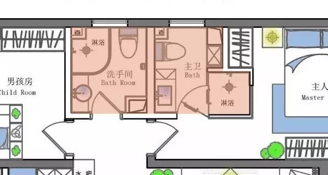 客位入口正对过道,风水不好,主卧入口就是马桶,而且不能设计独立淋浴房。