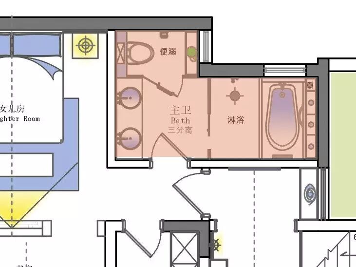 改变马桶位置和门的位置,提高空间利用率,卫生间实现三分离。