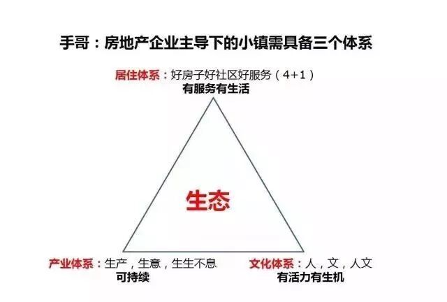 特色小镇是透过挖掘产业特色、历史人文和自然资源,创新打造出新产业、新商业、新品牌、以及新的居住与生活方式,形成产、城、人、文、景五位一体有机结合的功能平台,成为打造城市新经济的新途径。特色小镇是不走寻常路,到达新地方。 历史人文类有北京地道战红色文化小镇,自然资源有丽江束河旅游小镇,产业特色有玉皇山基金小镇,更为知名的新产业如乌镇的互联网大会,以及陈向宏操盘的古北水镇也成为新品牌。 1、特色小镇应该建立哪三个体系? 房地产企业主导下的特色小镇开发,应该包括三个体系,即:居住体系、文化体系、产业体系。 所谓居住体系,即传统房地产开发所包含的所有元素,比如社区及配套,物业及服务,房子以及周边相关的居住及生活单元。万科提出的三好(好房子好社区好服务)即是此中之意。当代置业提出的MOMA家园4+1也是一类。居住体系最终实现有服务有生活。 所谓文化体系,是小镇特有的内容,在房子之外,在社区之上,具有独特、专属的社区氛围,能够产生软性价值的内容。文化体系要满足:有人,有文,有人文,最终实现有生机有活力。 所谓产业体系,是小镇能够自循环的体系,有产业,才有活力,才能独立并持续运转。产业体系与前两者共同形成一个产业链,是一个生态体。产业体系最终实现可持续发展,自循环运营。手哥认为产业体系是要:生产、生意、生生不息。
