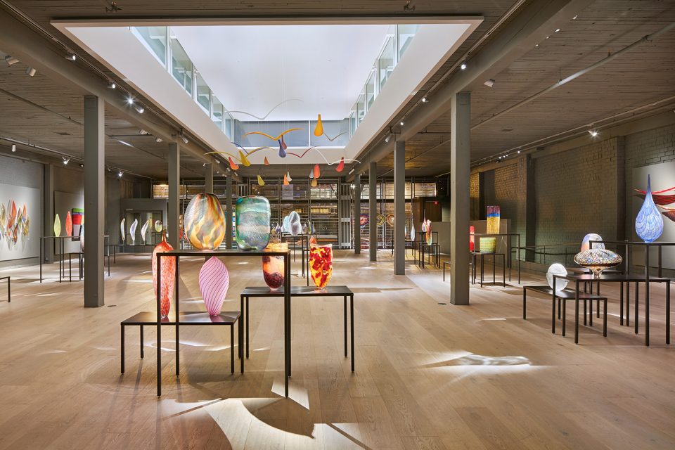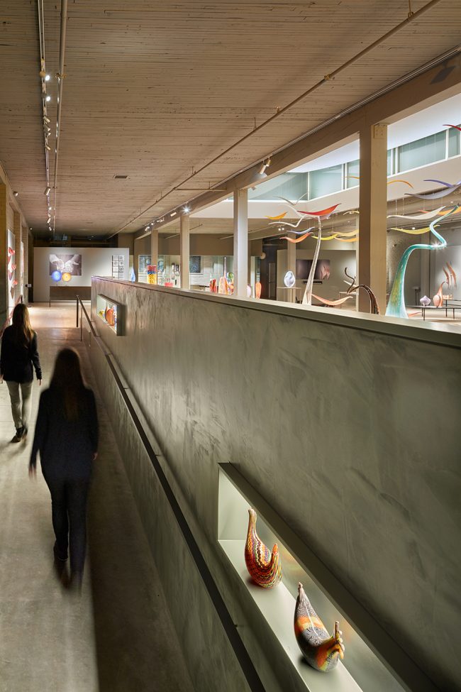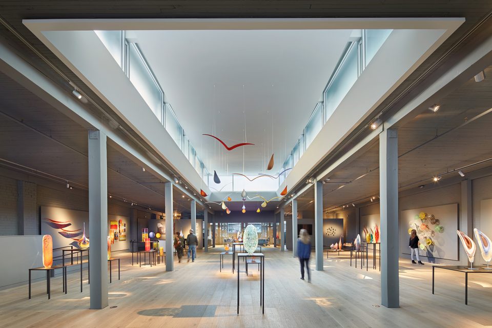 室内的砖墙被涂成暗灰色,地面则铺设以精致的白橡木。天花板上悬浮着16英尺宽、45英尺长的光屏。半透明的天窗将日光引入空间。光屏的下腹被塑造为弧形,能够使光线变得更加柔和。光屏下方是明亮的方形空间,可用于悬挂大型的玻璃作品。装置在光屏内的漫射光源还能够在夜间带来迷人灯光效果。
