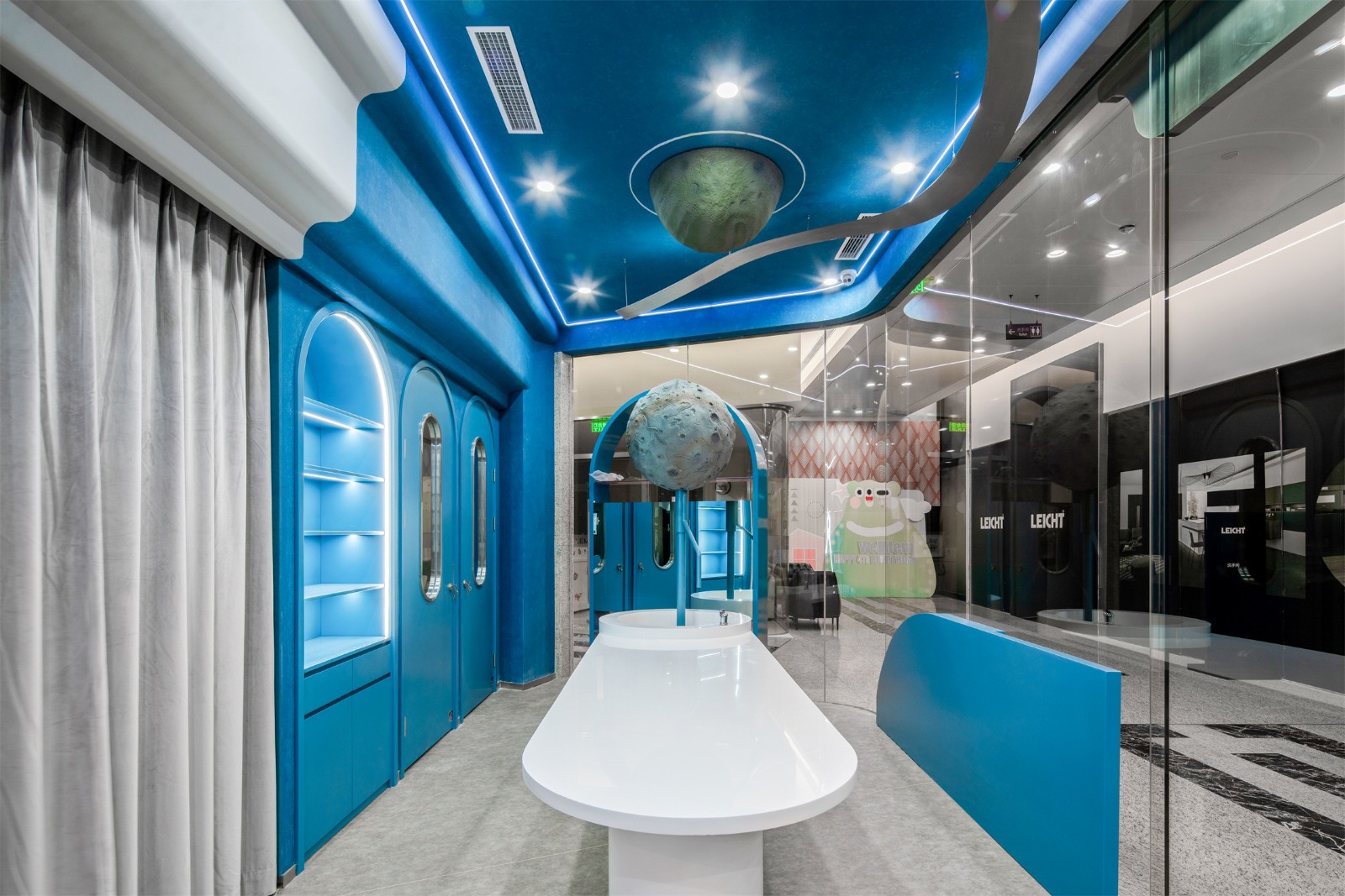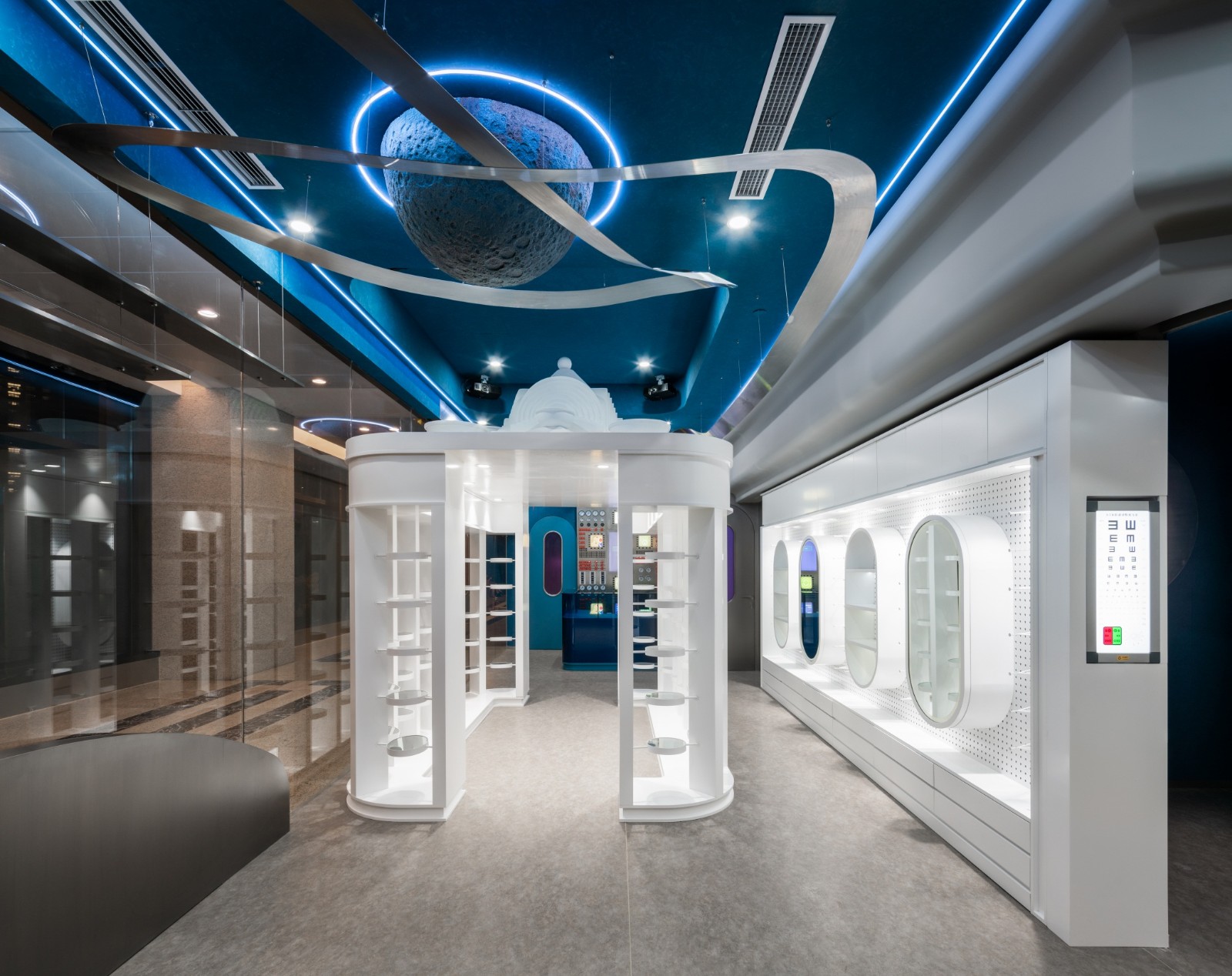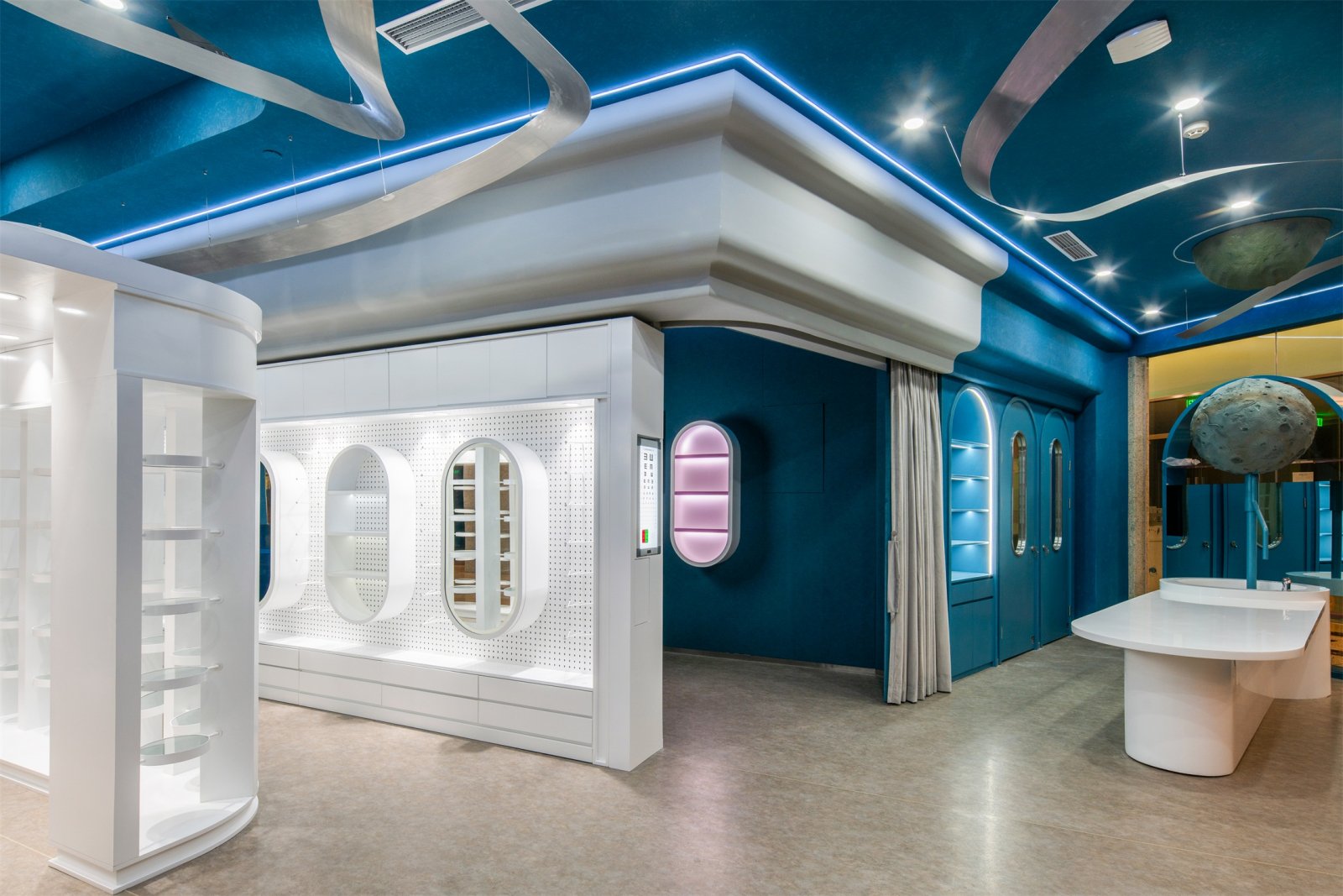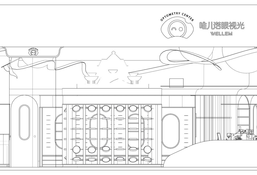 这是新天地唯儿诺眼视光星球,充满了梦幻奇遇,让每个孩子探索发现宇宙空间奥秘。在上海,迎来了宇宙里的神秘星球入驻,这颗星球上生活着一群善良可爱的生物, 并且这颗星球在整个银河系里拥有最先进的医疗设备。星球上的康康博士和团队发现越来越多的人类孩子眼睛生病了,随着病重还戴上丑丑的眼镜。看着这种病毒在地球如此猖狂的欺负小朋友。太让康康博士生气了!因为这种病毒是可以预防和治愈的。但地球人似乎对此毫无察觉。着急的康康博士召开了星球会议,探讨这个严重问题。会议一致同意紧急对地球开放自己的星球,治愈来到唯儿诺星球的人们。 现在就跟着唯儿诺星球设计师一起探索唯儿诺这颗星球秘境吧。耳边响起唯儿诺星人热情的声音:欢迎登陆闪闪放光的“唯儿诺眼视光星球”。星球设计师专为宝宝们设计的少年近视防空路线,将更深入了解作为整个星系医疗最发达的星球,探索埋藏在每个角落的彩蛋和故事。 为打造让儿童放松,愉快的就医检查过程,设计师将新天地唯儿诺眼视科设定为唯儿诺星球首次开启的空间站,并在门诊内建立了康康博士驾驶飞船在茫茫宇宙中航行探索新空间站位置的故事线。同时设计了不同的儿童互动装置在其中,形象的丰富了故事线,让儿童在就医过程中减少烦躁,不安,紧张的情绪。 与其说新天地唯儿诺是一个儿童眼科医院,不如说是一个儿童宇宙体验中心。设计师将不同的星球及宇宙元素融入不同的区域,有趣而又真实的飞船装置让小朋友更加能享受检查又或是就医的过程。 主入口为白色空间站(框架镜陈列区/试戴区),此处为房中房的贴心设计,设计师认为大人有大房子,小孩子应该有小房子。房子里的架子和镜子设计把底端与最高部分的层板做了360度可翻转镜面,很神奇的可以让我们不同年龄身高的小朋友查看。 门头以曲线的形式去呈现,在直角处做了圆角处理,增强流线感与视觉的柔动性。在空间站的顶部结合多媒体,呈现最短焦距的无缝拼接投影技术,使四台投影仪播放的内容可以无缝连接成为整体,素材可根据不同节日的主题来切换。 顶部空间通过大小不同的星球来体现深蓝色的宇宙海洋,而飞船航线则由拉丝不锈钢材质所制作的光圈来呈现,环绕在星球的周围。 前台使用机舱控制室的元素,增强视觉感与趣味性,以夸张的手法去呈现,更加体现了童趣。走到飞船驾驶操作舱登记资料;满满的科技感让宝宝们好奇心爆棚,瞬间放松了心情。随着飞船航线看到星球上空深蓝色的宇宙星海,如梦如幻,宝宝们不时发出惊叹。 诊室内的空间设计也一改之前的固有形象成为了康康博士的工作室,为了使小朋友能够更好地放松,每个小诊室里都迎合了大环境的元素,增强空间体验感。 试戴休息室使用VIP舱位的元素,因功能需求是较暗的,在墙面上使用了深蓝色的皮革软包,使空间更神秘与柔软,减少孩子的抵触心理,使其能放松下来,去体验 ▲平面图 ▲立面图 ▲剖面图