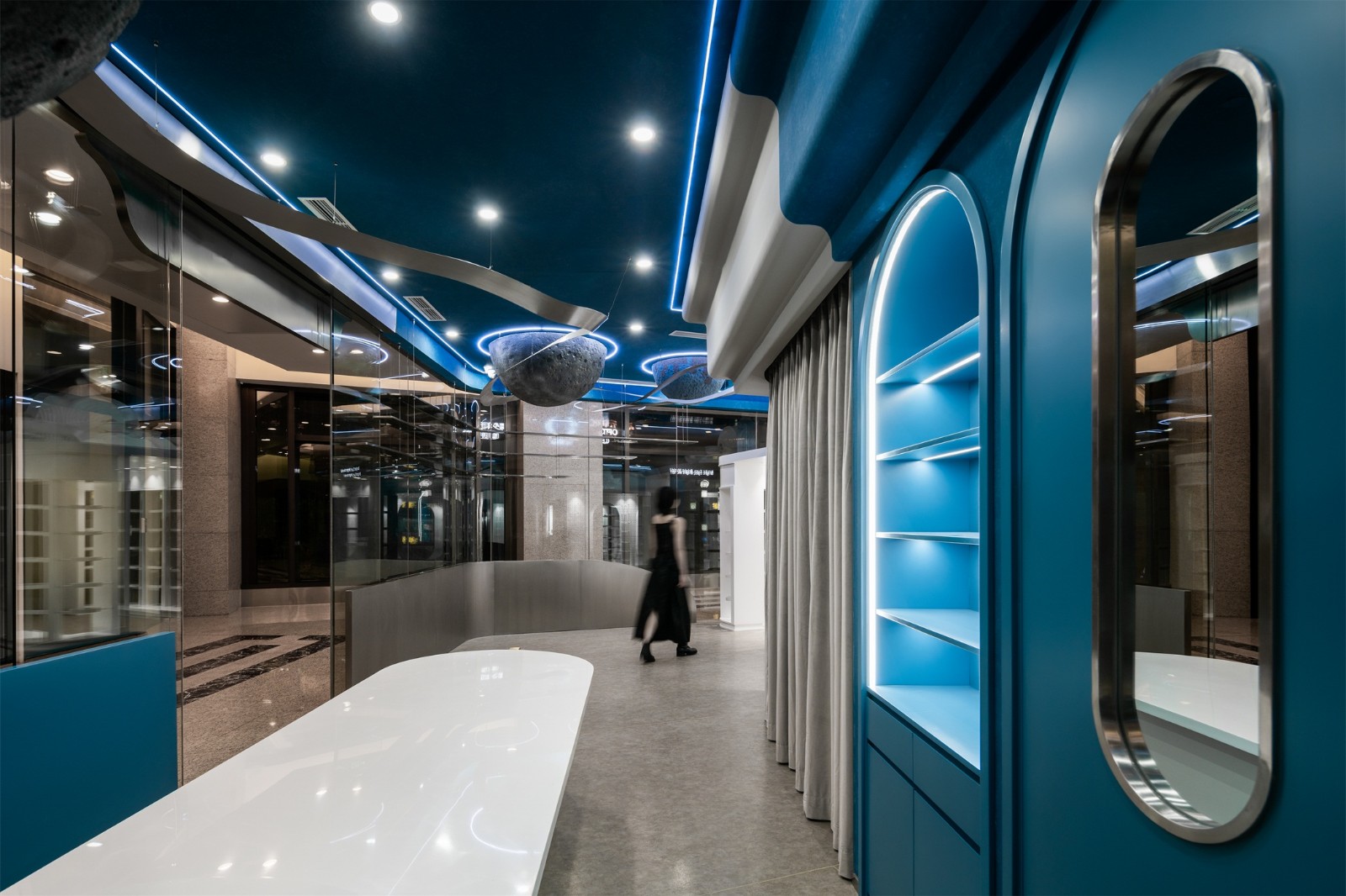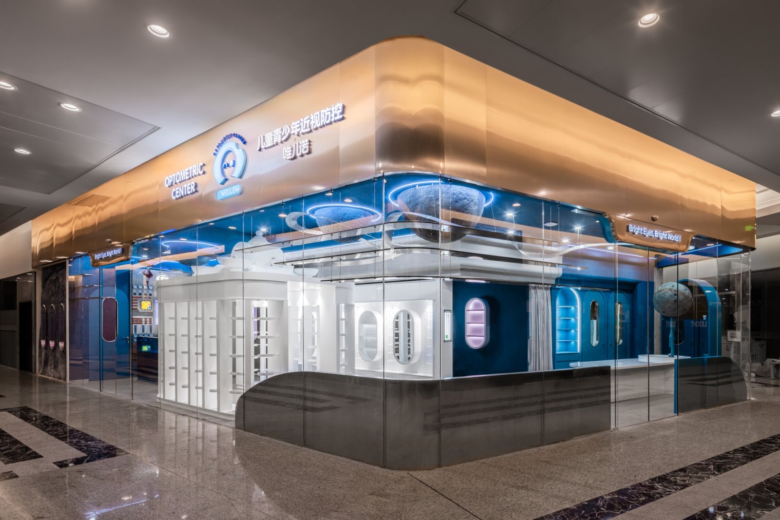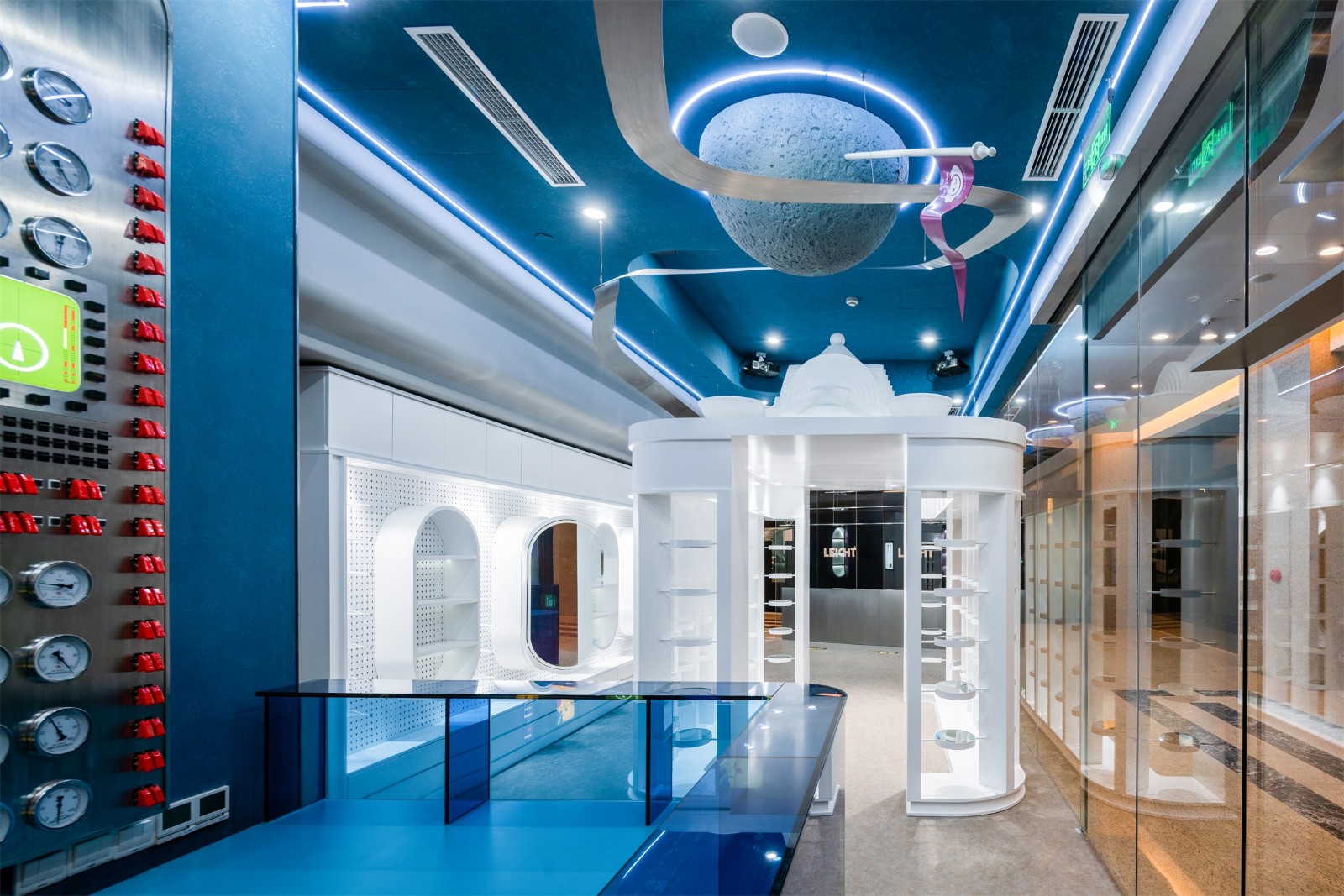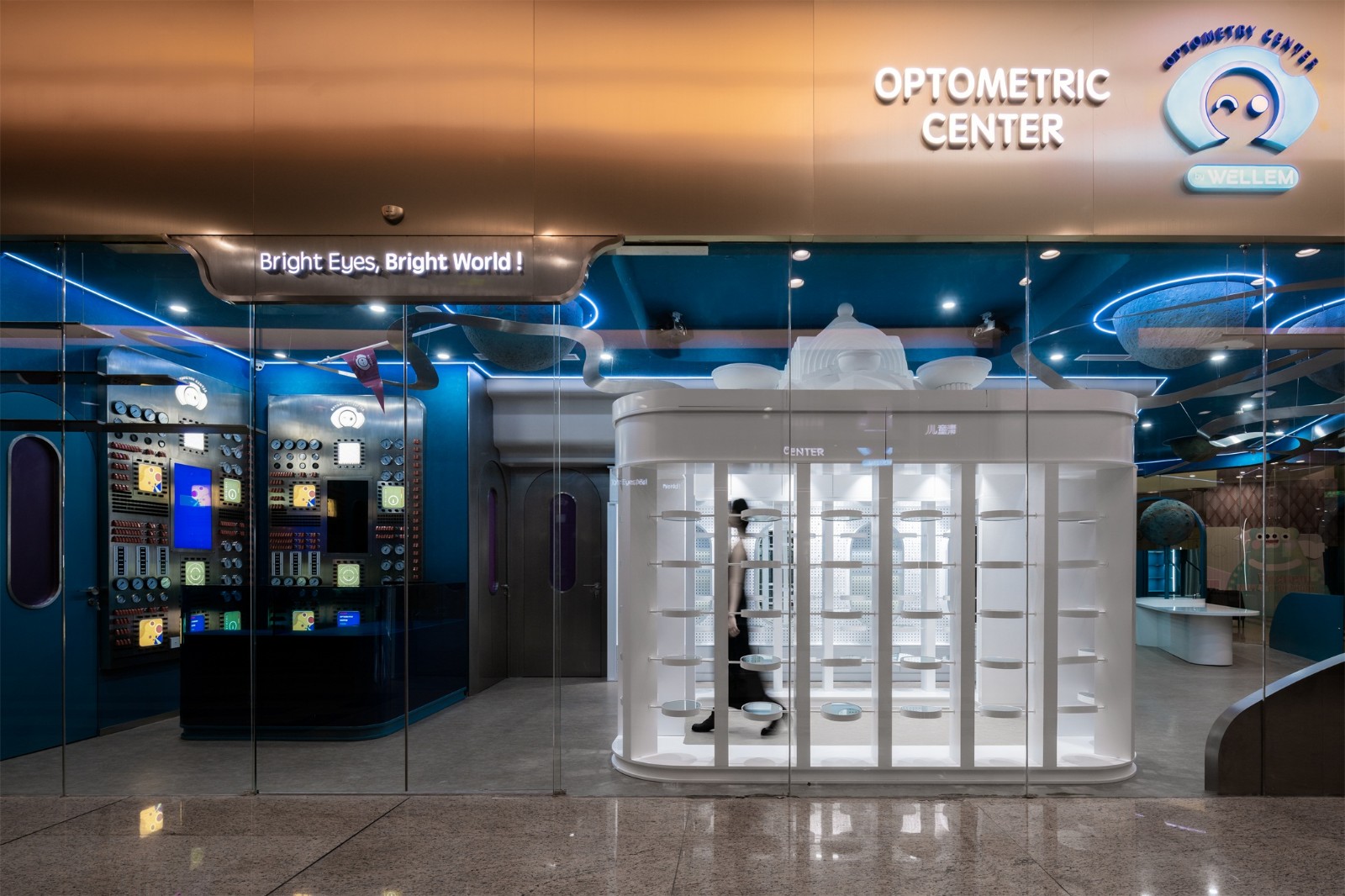 这是新天地唯儿诺眼视光星球,充满了梦幻奇遇,让每个孩子探索发现宇宙空间奥秘。在上海,迎来了宇宙里的神秘星球入驻,这颗星球上生活着一群善良可爱的生物, 并且这颗星球在整个银河系里拥有最先进的医疗设备。星球上的康康博士和团队发现越来越多的人类孩子眼睛生病了,随着病重还戴上丑丑的眼镜。看着这种病毒在地球如此猖狂的欺负小朋友。太让康康博士生气了!因为这种病毒是可以预防和治愈的。但地球人似乎对此毫无察觉。着急的康康博士召开了星球会议,探讨这个严重问题。会议一致同意紧急对地球开放自己的星球,治愈来到唯儿诺星球的人们。 现在就跟着唯儿诺星球设计师一起探索唯儿诺这颗星球秘境吧。耳边响起唯儿诺星人热情的声音:欢迎登陆闪闪放光的“唯儿诺眼视光星球”。星球设计师专为宝宝们设计的少年近视防空路线,将更深入了解作为整个星系医疗最发达的星球,探索埋藏在每个角落的彩蛋和故事。 为打造让儿童放松,愉快的就医检查过程,设计师将新天地唯儿诺眼视科设定为唯儿诺星球首次开启的空间站,并在门诊内建立了康康博士驾驶飞船在茫茫宇宙中航行探索新空间站位置的故事线。同时设计了不同的儿童互动装置在其中,形象的丰富了故事线,让儿童在就医过程中减少烦躁,不安,紧张的情绪。 与其说新天地唯儿诺是一个儿童眼科医院,不如说是一个儿童宇宙体验中心。设计师将不同的星球及宇宙元素融入不同的区域,有趣而又真实的飞船装置让小朋友更加能享受检查又或是就医的过程。 主入口为白色空间站(框架镜陈列区/试戴区),此处为房中房的贴心设计,设计师认为大人有大房子,小孩子应该有小房子。房子里的架子和镜子设计把底端与最高部分的层板做了360度可翻转镜面,很神奇的可以让我们不同年龄身高的小朋友查看。 门头以曲线的形式去呈现,在直角处做了圆角处理,增强流线感与视觉的柔动性。在空间站的顶部结合多媒体,呈现最短焦距的无缝拼接投影技术,使四台投影仪播放的内容可以无缝连接成为整体,素材可根据不同节日的主题来切换。 顶部空间通过大小不同的星球来体现深蓝色的宇宙海洋,而飞船航线则由拉丝不锈钢材质所制作的光圈来呈现,环绕在星球的周围。 前台使用机舱控制室的元素,增强视觉感与趣味性,以夸张的手法去呈现,更加体现了童趣。走到飞船驾驶操作舱登记资料;满满的科技感让宝宝们好奇心爆棚,瞬间放松了心情。随着飞船航线看到星球上空深蓝色的宇宙星海,如梦如幻,宝宝们不时发出惊叹。 诊室内的空间设计也一改之前的固有形象成为了康康博士的工作室,为了使小朋友能够更好地放松,每个小诊室里都迎合了大环境的元素,增强空间体验感。 试戴休息室使用VIP舱位的元素,因功能需求是较暗的,在墙面上使用了深蓝色的皮革软包,使空间更神秘与柔软,减少孩子的抵触心理,使其能放松下来,去体验 ▲平面图 ▲立面图 ▲剖面图