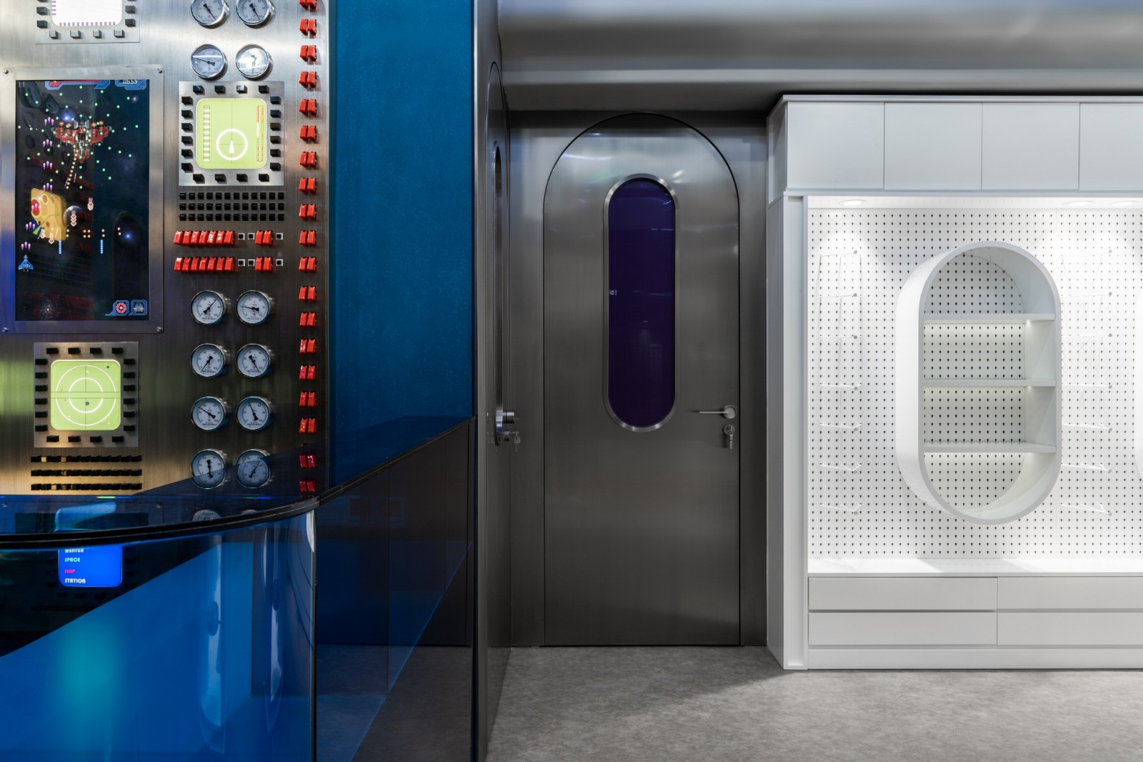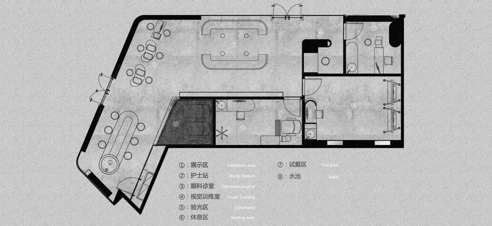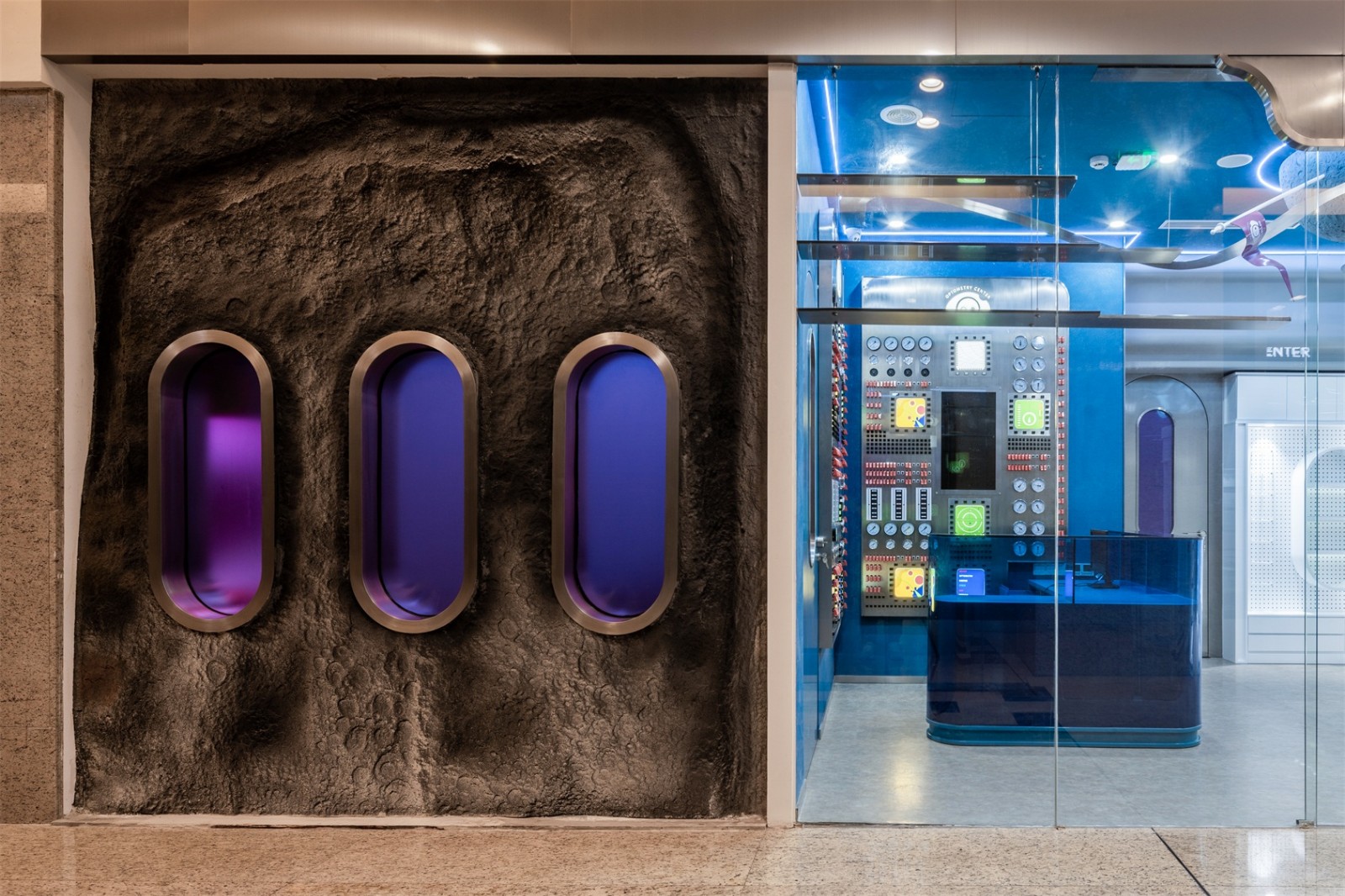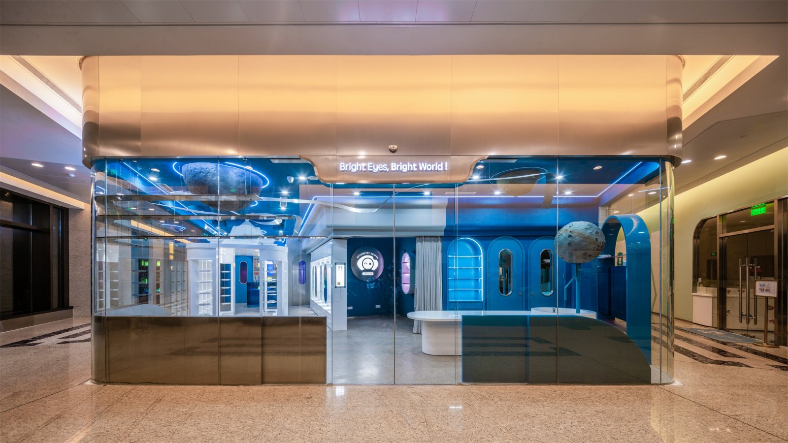 这是新天地唯儿诺眼视光星球,充满了梦幻奇遇,让每个孩子探索发现宇宙空间奥秘。在上海,迎来了宇宙里的神秘星球入驻,这颗星球上生活着一群善良可爱的生物, 并且这颗星球在整个银河系里拥有最先进的医疗设备。星球上的康康博士和团队发现越来越多的人类孩子眼睛生病了,随着病重还戴上丑丑的眼镜。看着这种病毒在地球如此猖狂的欺负小朋友。太让康康博士生气了!因为这种病毒是可以预防和治愈的。但地球人似乎对此毫无察觉。着急的康康博士召开了星球会议,探讨这个严重问题。会议一致同意紧急对地球开放自己的星球,治愈来到唯儿诺星球的人们。 现在就跟着唯儿诺星球设计师一起探索唯儿诺这颗星球秘境吧。耳边响起唯儿诺星人热情的声音:欢迎登陆闪闪放光的“唯儿诺眼视光星球”。星球设计师专为宝宝们设计的少年近视防空路线,将更深入了解作为整个星系医疗最发达的星球,探索埋藏在每个角落的彩蛋和故事。 为打造让儿童放松,愉快的就医检查过程,设计师将新天地唯儿诺眼视科设定为唯儿诺星球首次开启的空间站,并在门诊内建立了康康博士驾驶飞船在茫茫宇宙中航行探索新空间站位置的故事线。同时设计了不同的儿童互动装置在其中,形象的丰富了故事线,让儿童在就医过程中减少烦躁,不安,紧张的情绪。 与其说新天地唯儿诺是一个儿童眼科医院,不如说是一个儿童宇宙体验中心。设计师将不同的星球及宇宙元素融入不同的区域,有趣而又真实的飞船装置让小朋友更加能享受检查又或是就医的过程。 主入口为白色空间站(框架镜陈列区/试戴区),此处为房中房的贴心设计,设计师认为大人有大房子,小孩子应该有小房子。房子里的架子和镜子设计把底端与最高部分的层板做了360度可翻转镜面,很神奇的可以让我们不同年龄身高的小朋友查看。 门头以曲线的形式去呈现,在直角处做了圆角处理,增强流线感与视觉的柔动性。在空间站的顶部结合多媒体,呈现最短焦距的无缝拼接投影技术,使四台投影仪播放的内容可以无缝连接成为整体,素材可根据不同节日的主题来切换。 顶部空间通过大小不同的星球来体现深蓝色的宇宙海洋,而飞船航线则由拉丝不锈钢材质所制作的光圈来呈现,环绕在星球的周围。 前台使用机舱控制室的元素,增强视觉感与趣味性,以夸张的手法去呈现,更加体现了童趣。走到飞船驾驶操作舱登记资料;满满的科技感让宝宝们好奇心爆棚,瞬间放松了心情。随着飞船航线看到星球上空深蓝色的宇宙星海,如梦如幻,宝宝们不时发出惊叹。 诊室内的空间设计也一改之前的固有形象成为了康康博士的工作室,为了使小朋友能够更好地放松,每个小诊室里都迎合了大环境的元素,增强空间体验感。 试戴休息室使用VIP舱位的元素,因功能需求是较暗的,在墙面上使用了深蓝色的皮革软包,使空间更神秘与柔软,减少孩子的抵触心理,使其能放松下来,去体验 ▲平面图 ▲立面图 ▲剖面图