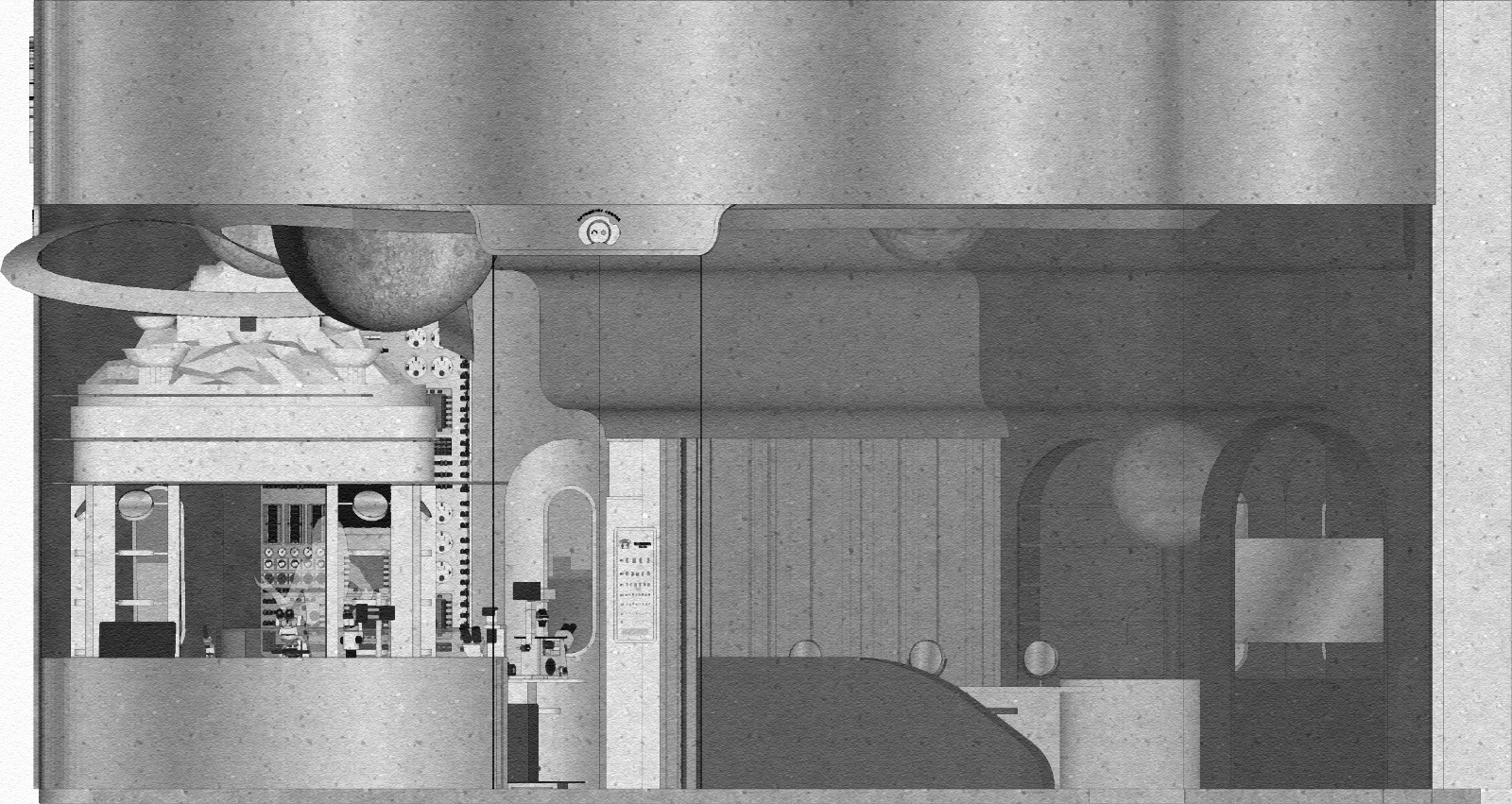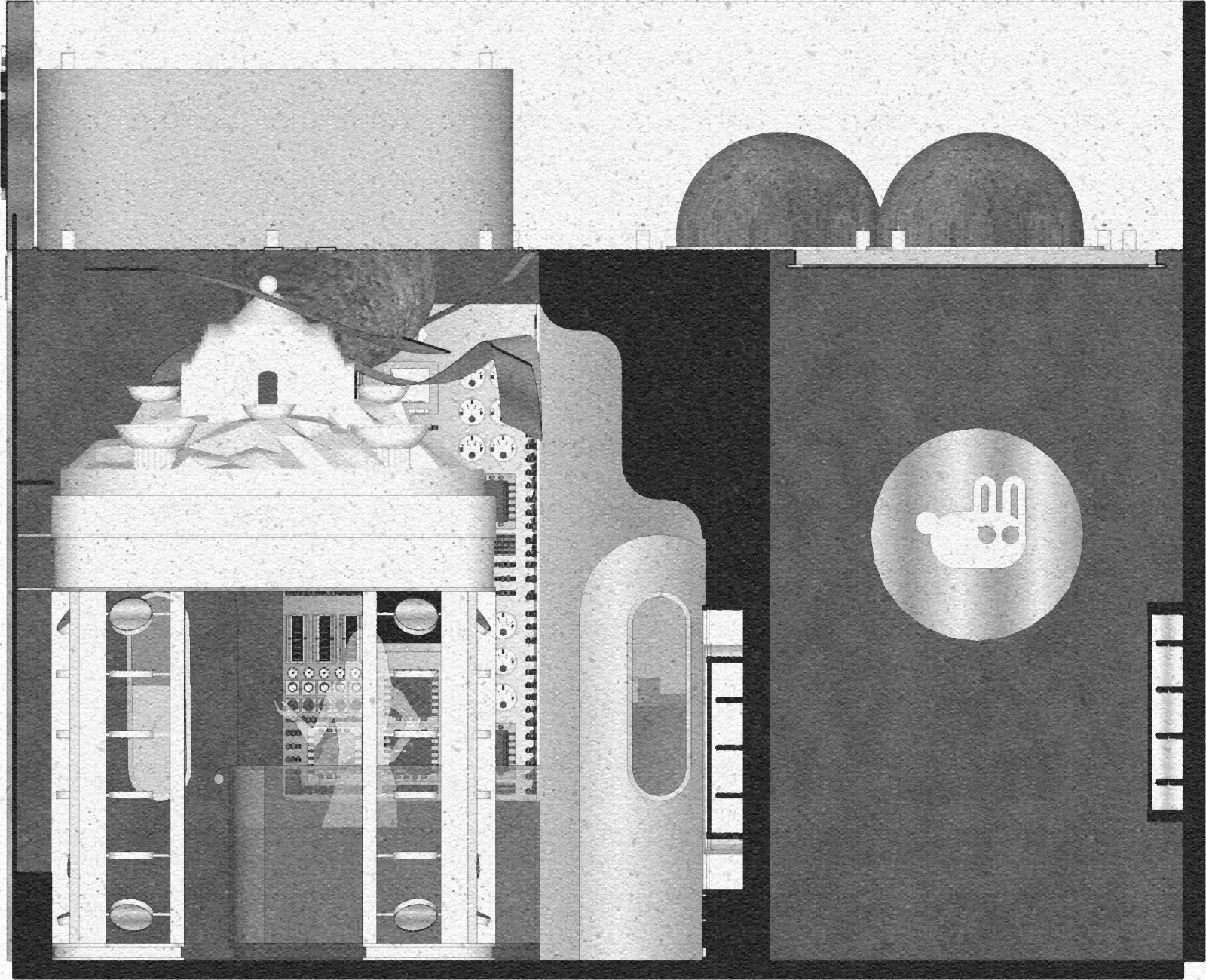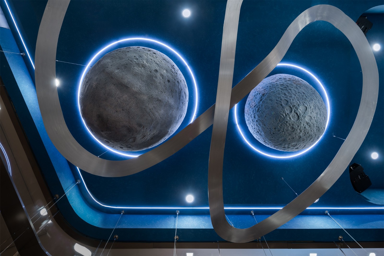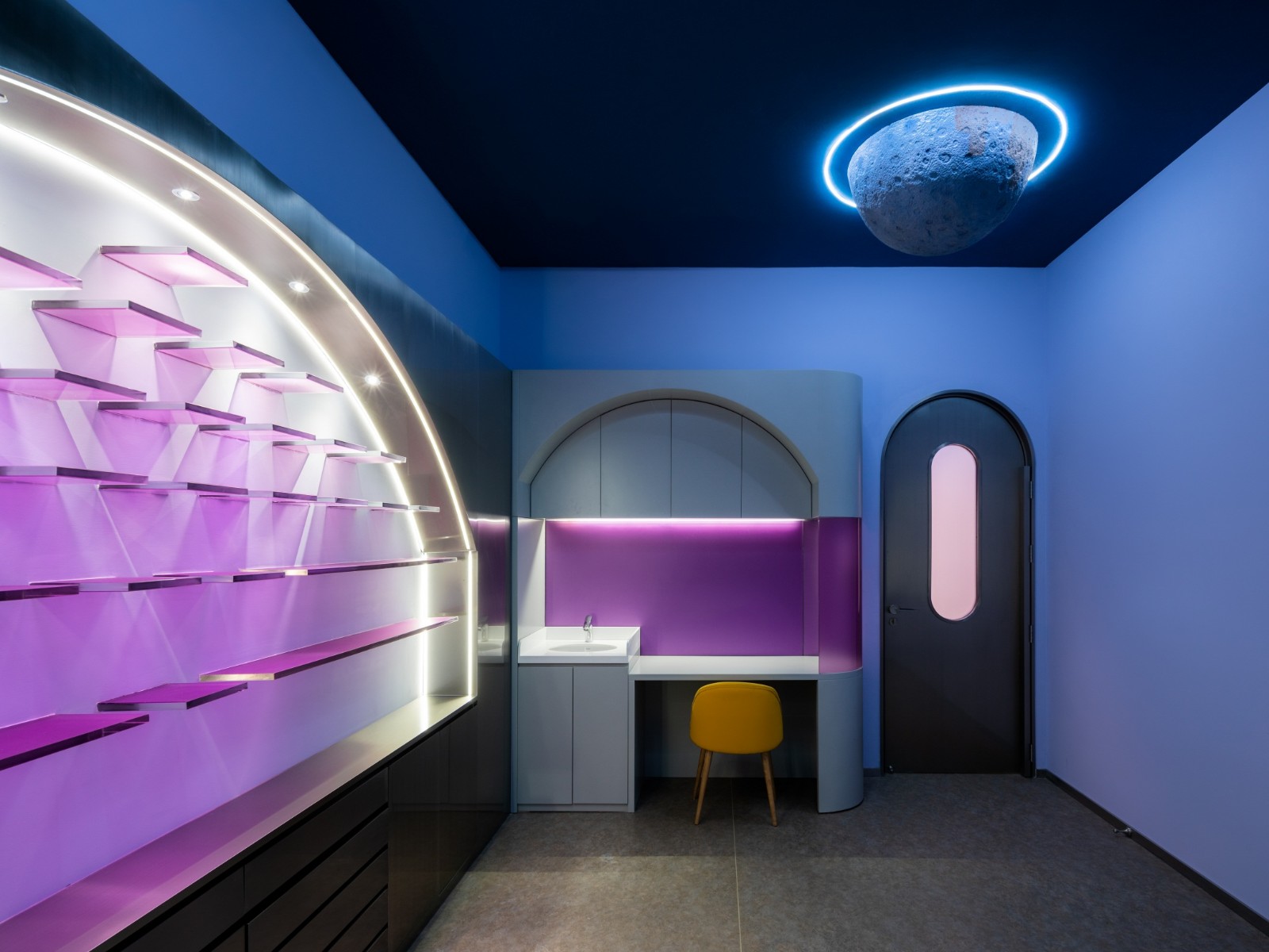 这是新天地唯儿诺眼视光星球,充满了梦幻奇遇,让每个孩子探索发现宇宙空间奥秘。在上海,迎来了宇宙里的神秘星球入驻,这颗星球上生活着一群善良可爱的生物, 并且这颗星球在整个银河系里拥有最先进的医疗设备。星球上的康康博士和团队发现越来越多的人类孩子眼睛生病了,随着病重还戴上丑丑的眼镜。看着这种病毒在地球如此猖狂的欺负小朋友。太让康康博士生气了!因为这种病毒是可以预防和治愈的。但地球人似乎对此毫无察觉。着急的康康博士召开了星球会议,探讨这个严重问题。会议一致同意紧急对地球开放自己的星球,治愈来到唯儿诺星球的人们。 现在就跟着唯儿诺星球设计师一起探索唯儿诺这颗星球秘境吧。耳边响起唯儿诺星人热情的声音:欢迎登陆闪闪放光的“唯儿诺眼视光星球”。星球设计师专为宝宝们设计的少年近视防空路线,将更深入了解作为整个星系医疗最发达的星球,探索埋藏在每个角落的彩蛋和故事。 为打造让儿童放松,愉快的就医检查过程,设计师将新天地唯儿诺眼视科设定为唯儿诺星球首次开启的空间站,并在门诊内建立了康康博士驾驶飞船在茫茫宇宙中航行探索新空间站位置的故事线。同时设计了不同的儿童互动装置在其中,形象的丰富了故事线,让儿童在就医过程中减少烦躁,不安,紧张的情绪。 与其说新天地唯儿诺是一个儿童眼科医院,不如说是一个儿童宇宙体验中心。设计师将不同的星球及宇宙元素融入不同的区域,有趣而又真实的飞船装置让小朋友更加能享受检查又或是就医的过程。 主入口为白色空间站(框架镜陈列区/试戴区),此处为房中房的贴心设计,设计师认为大人有大房子,小孩子应该有小房子。房子里的架子和镜子设计把底端与最高部分的层板做了360度可翻转镜面,很神奇的可以让我们不同年龄身高的小朋友查看。 门头以曲线的形式去呈现,在直角处做了圆角处理,增强流线感与视觉的柔动性。在空间站的顶部结合多媒体,呈现最短焦距的无缝拼接投影技术,使四台投影仪播放的内容可以无缝连接成为整体,素材可根据不同节日的主题来切换。 顶部空间通过大小不同的星球来体现深蓝色的宇宙海洋,而飞船航线则由拉丝不锈钢材质所制作的光圈来呈现,环绕在星球的周围。 前台使用机舱控制室的元素,增强视觉感与趣味性,以夸张的手法去呈现,更加体现了童趣。走到飞船驾驶操作舱登记资料;满满的科技感让宝宝们好奇心爆棚,瞬间放松了心情。随着飞船航线看到星球上空深蓝色的宇宙星海,如梦如幻,宝宝们不时发出惊叹。 诊室内的空间设计也一改之前的固有形象成为了康康博士的工作室,为了使小朋友能够更好地放松,每个小诊室里都迎合了大环境的元素,增强空间体验感。 试戴休息室使用VIP舱位的元素,因功能需求是较暗的,在墙面上使用了深蓝色的皮革软包,使空间更神秘与柔软,减少孩子的抵触心理,使其能放松下来,去体验 ▲平面图 ▲立面图 ▲剖面图