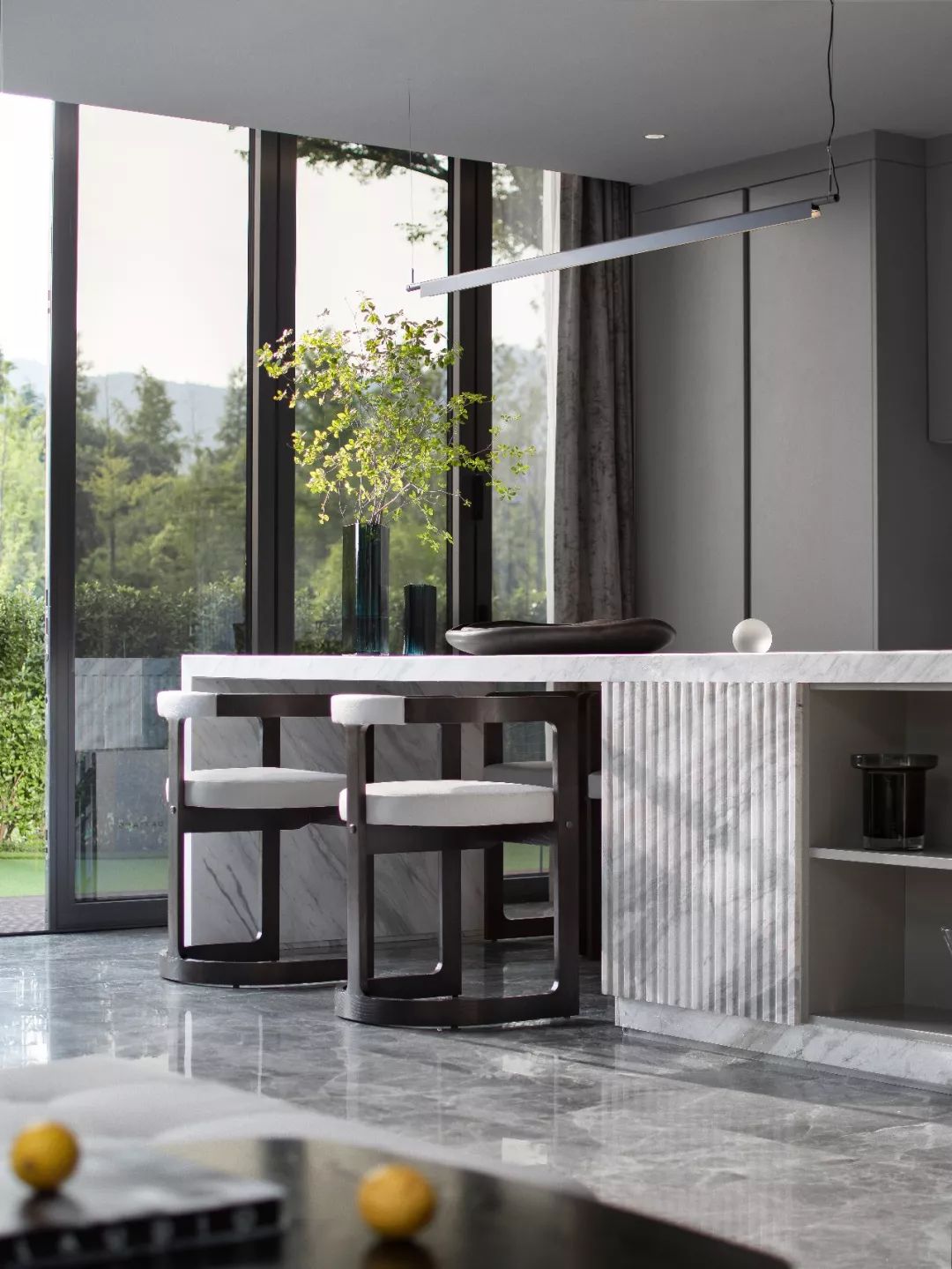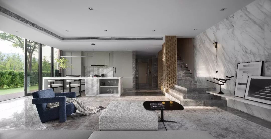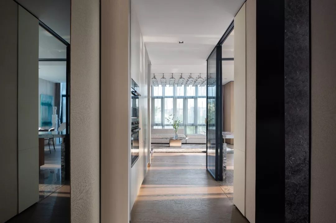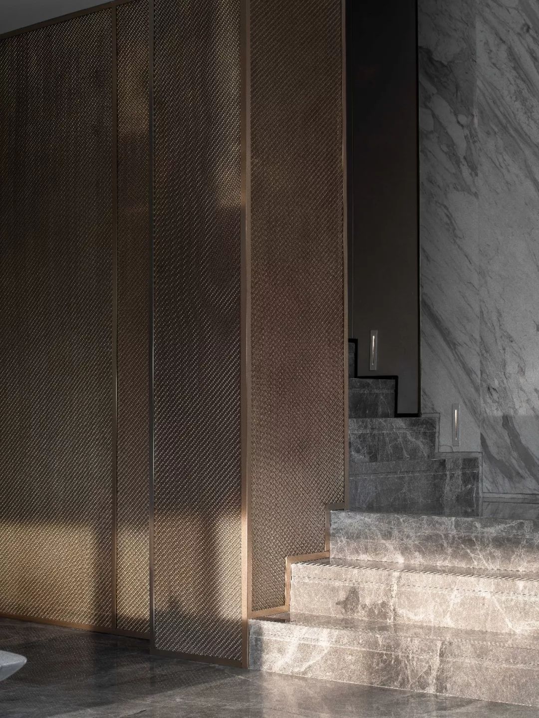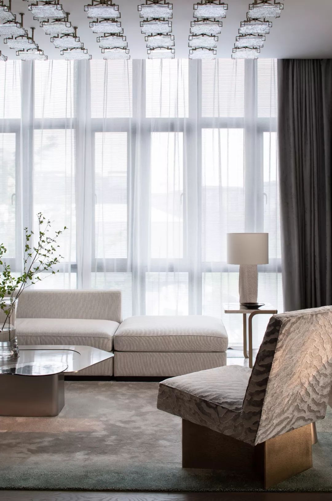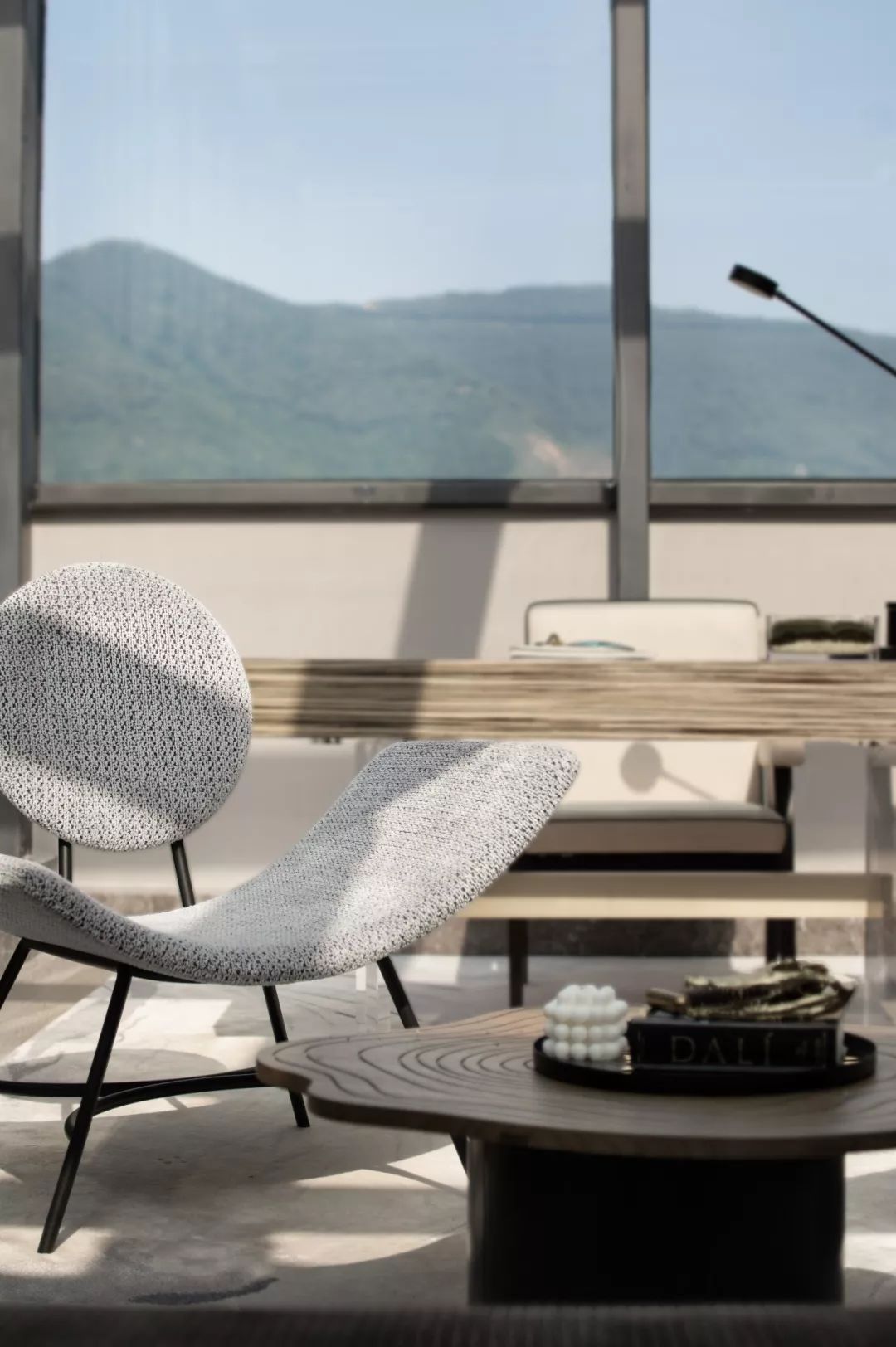 大象山舍·上叠&下叠 项目地址| 苏州 项目名称 | 万科·大象山舍 室内设计 | LSD interior design 空间摄影 | 聿摄影 在这个项目中,由于“叠拼”的建筑特性,当“实验”完成后,美成为了一种拥有具体形态的两类气质,作用于空间之内。上叠柔和浪漫,下叠硬朗理性,和而不同,却都是“美”的延伸与外化。 苏州大象山舍上叠 上叠空间包含三至五层,每层依据不同的功能划分呈现出了层层递进的空间逻辑。三层主要设置为客餐厅、厨房及长辈房等区域。 餐厅一侧,我们通过加扩原空间阳台的位置,最大限度地纳入室外的自然之景,与客厅区一并形成了双面采光观景的空间效果。 三层的长辈房,同样在一侧加入了整面的自然采光玻璃墙。自然哑光与手工质感的黑灰色系床品,与温润的木饰面搭配。 四层的主卧及儿童房区域延续了空间对于光的追求,皆以整面墙的落地玻璃设置使每个空间呈现为“对外打开”的状态。 我们以色彩烘托空间氛围,也以色彩构筑空间属性。男孩房以蓝色为空间主色调,我们以蓝色与白色的对比来延续空间的活力。 拾阶而上,进入到顶层空间。这里增设了家政间、亲子阅读空间,及半户外露台等实用功能空间。 傍晚时,由山林之间而来的清风拂面,我们依坐,围靠在此处,静候星辰点亮夜空。 苏州大象山舍下叠 下叠空间包含负一层至二层平面区域。由一面金属网纹的立面墙体自上而下贯穿而成。 两面巨大的落地窗,将室外花园庭院的光色与景致引入内部,俯仰之间,皆是满目的绿意与自然的朗阔之貌。 主卧延续了简约的设计调性,但却不是一览无余的毫无修饰,而是“大处着眼,小处着手”的设计之道。 蓝绿色的点缀,成为了男孩房脱颖而出一个亮点。黑白灰的主色调之中,蓝色画作、绿色靠枕,于沉稳之中凸显年轻一代的俏皮与活力。 餐厅被置于负一层与夹层空间半围合的区域处,透光石与扪布饰面的拼贴,呈现出了一个中式围餐的就餐氛围。 在以“幽暗”见长的地下空间,光的营造变得至关重要。我们将原建筑北面及西北面的两个采光井打通,将自然光引入负一层健身房及夹层茶室等区域,微微一束,却也是生活的诗意。