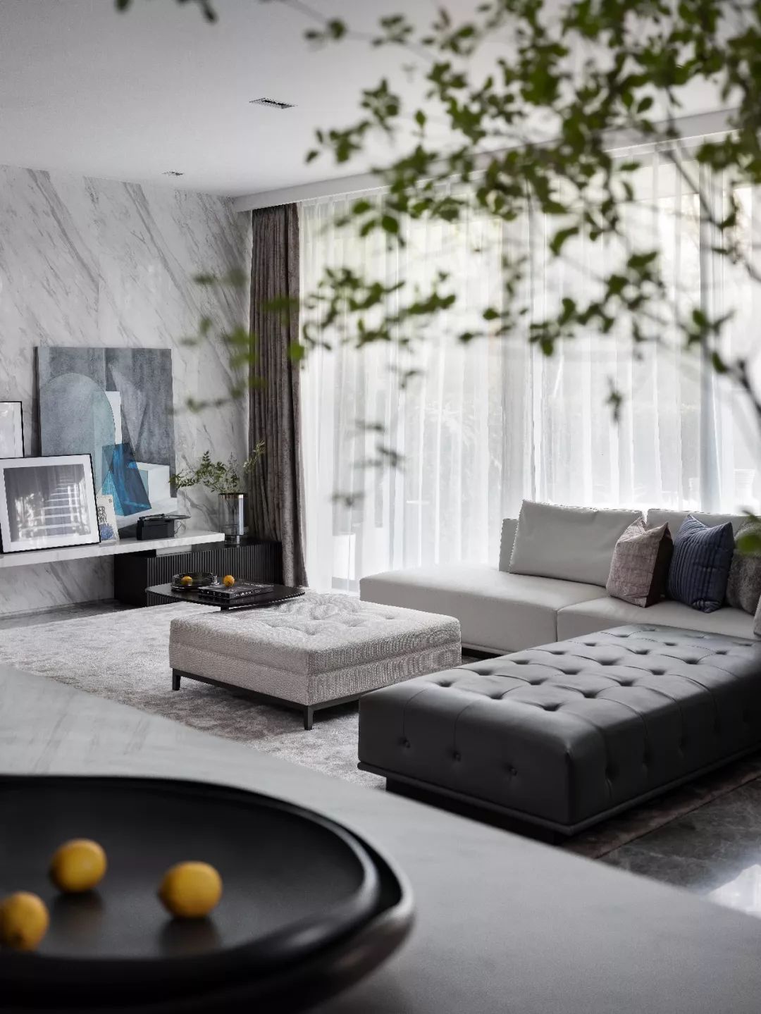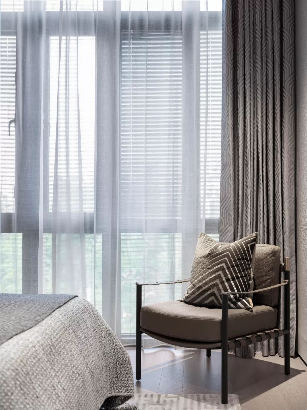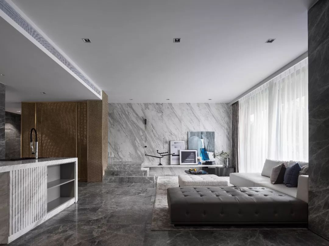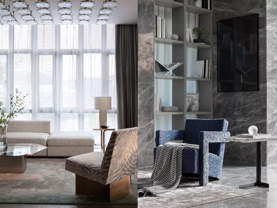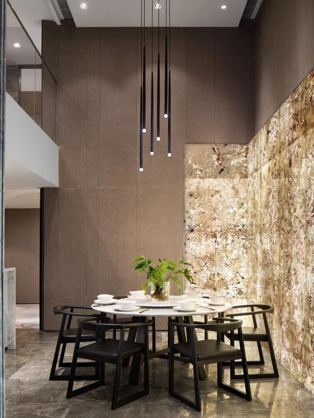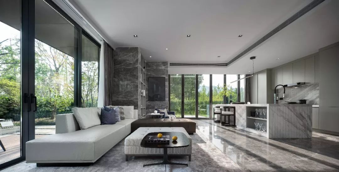 大象山舍·上叠&下叠 项目地址| 苏州 项目名称 | 万科·大象山舍 室内设计 | LSD interior design 空间摄影 | 聿摄影 在这个项目中,由于“叠拼”的建筑特性,当“实验”完成后,美成为了一种拥有具体形态的两类气质,作用于空间之内。上叠柔和浪漫,下叠硬朗理性,和而不同,却都是“美”的延伸与外化。 苏州大象山舍上叠 上叠空间包含三至五层,每层依据不同的功能划分呈现出了层层递进的空间逻辑。三层主要设置为客餐厅、厨房及长辈房等区域。 餐厅一侧,我们通过加扩原空间阳台的位置,最大限度地纳入室外的自然之景,与客厅区一并形成了双面采光观景的空间效果。 三层的长辈房,同样在一侧加入了整面的自然采光玻璃墙。自然哑光与手工质感的黑灰色系床品,与温润的木饰面搭配。 四层的主卧及儿童房区域延续了空间对于光的追求,皆以整面墙的落地玻璃设置使每个空间呈现为“对外打开”的状态。 我们以色彩烘托空间氛围,也以色彩构筑空间属性。男孩房以蓝色为空间主色调,我们以蓝色与白色的对比来延续空间的活力。 拾阶而上,进入到顶层空间。这里增设了家政间、亲子阅读空间,及半户外露台等实用功能空间。 傍晚时,由山林之间而来的清风拂面,我们依坐,围靠在此处,静候星辰点亮夜空。 苏州大象山舍下叠 下叠空间包含负一层至二层平面区域。由一面金属网纹的立面墙体自上而下贯穿而成。 两面巨大的落地窗,将室外花园庭院的光色与景致引入内部,俯仰之间,皆是满目的绿意与自然的朗阔之貌。 主卧延续了简约的设计调性,但却不是一览无余的毫无修饰,而是“大处着眼,小处着手”的设计之道。 蓝绿色的点缀,成为了男孩房脱颖而出一个亮点。黑白灰的主色调之中,蓝色画作、绿色靠枕,于沉稳之中凸显年轻一代的俏皮与活力。 餐厅被置于负一层与夹层空间半围合的区域处,透光石与扪布饰面的拼贴,呈现出了一个中式围餐的就餐氛围。 在以“幽暗”见长的地下空间,光的营造变得至关重要。我们将原建筑北面及西北面的两个采光井打通,将自然光引入负一层健身房及夹层茶室等区域,微微一束,却也是生活的诗意。
