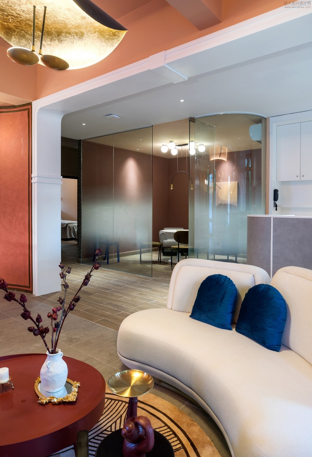 经过白色走廊的过度,洽谈室是绛红色和灰粉搭配,对比强烈,特别定制的装饰画与空间的色彩一致。天花的圆球灯组合,造型呼应的前台的壁灯。纤细的拱形吊灯,线条和logo不谋而合。