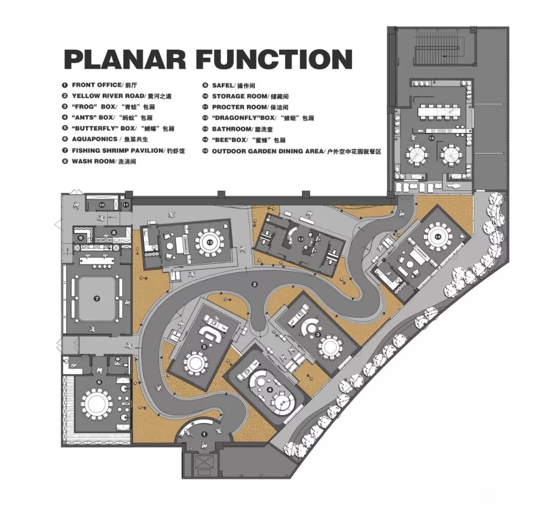 黄河的两岸是麦田,昆虫们在麦田里生活着,享受着黄河的母爱。这是我们对于这个餐厅的文化文化表达。The boundless wheat field are located in the valley of yellow river, where many insects live and enjoy the maternal love of the yellow river.The above details explain thoroughly how we have planned to implement the design concept.