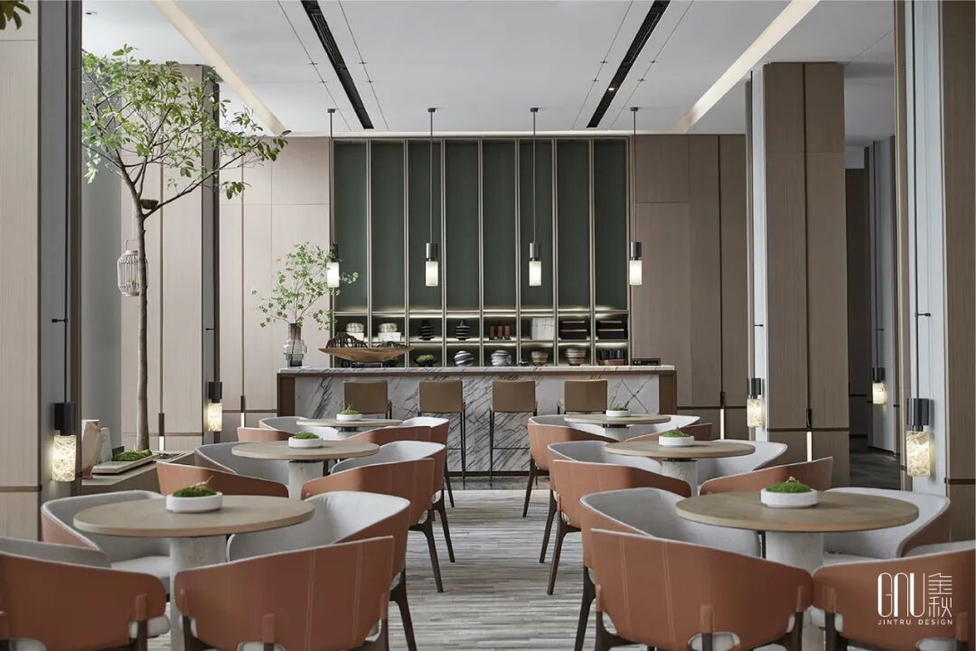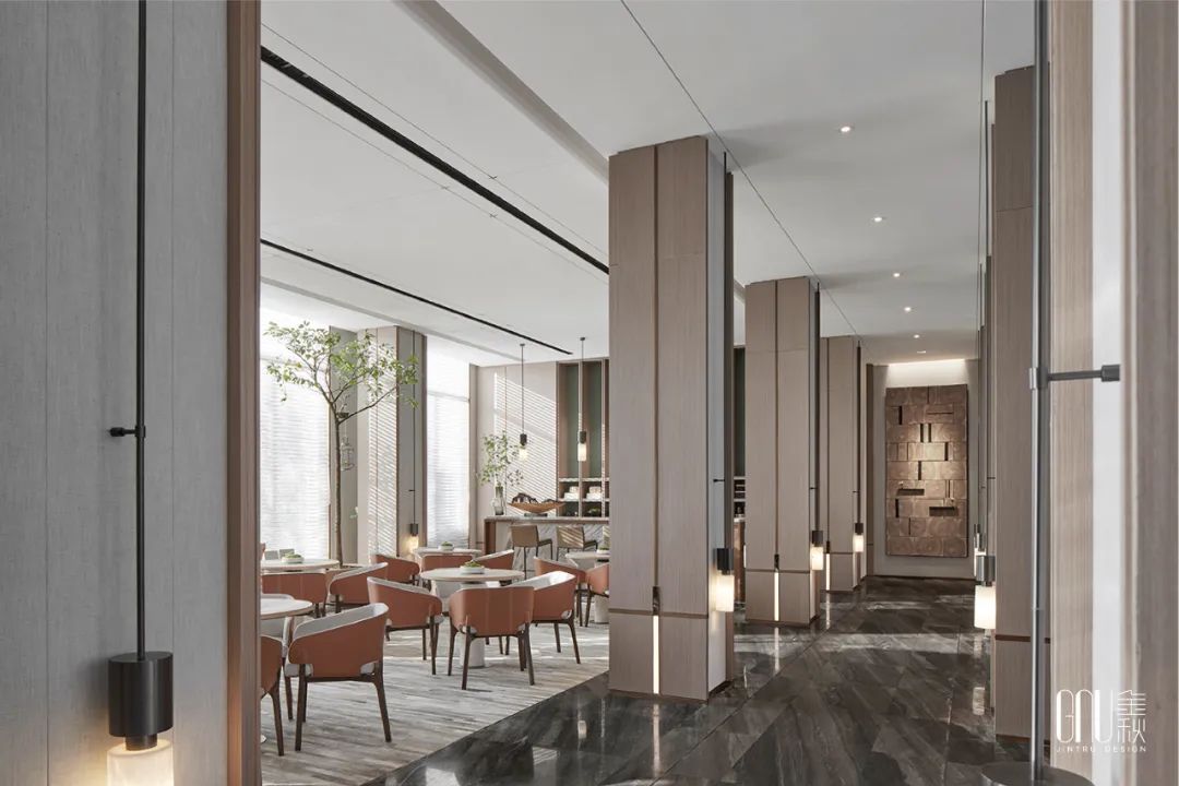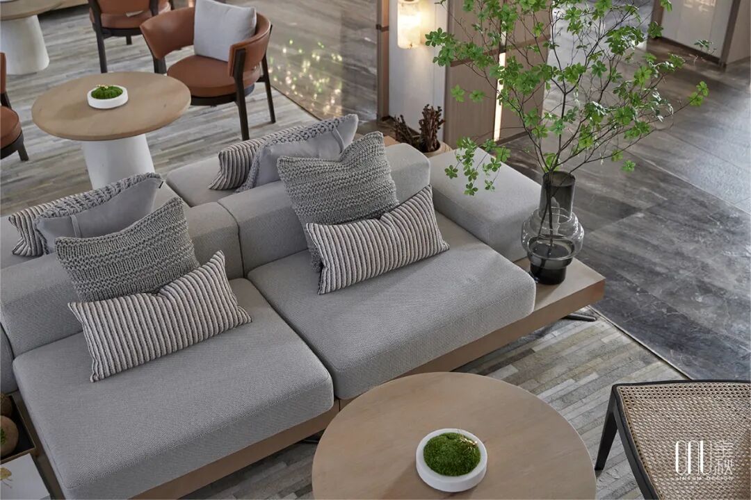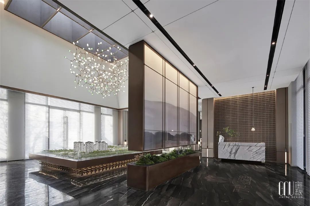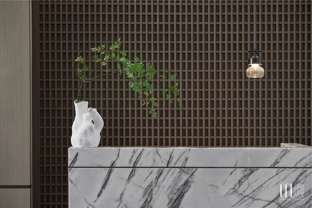 签约区的灯光以暖色为主,映照大理石折射出朦胧如梦的诗意感,整个空间呈现淡雅闲适的氛围,让人产生一种“偷得浮生半日闲”的梦幻体验。