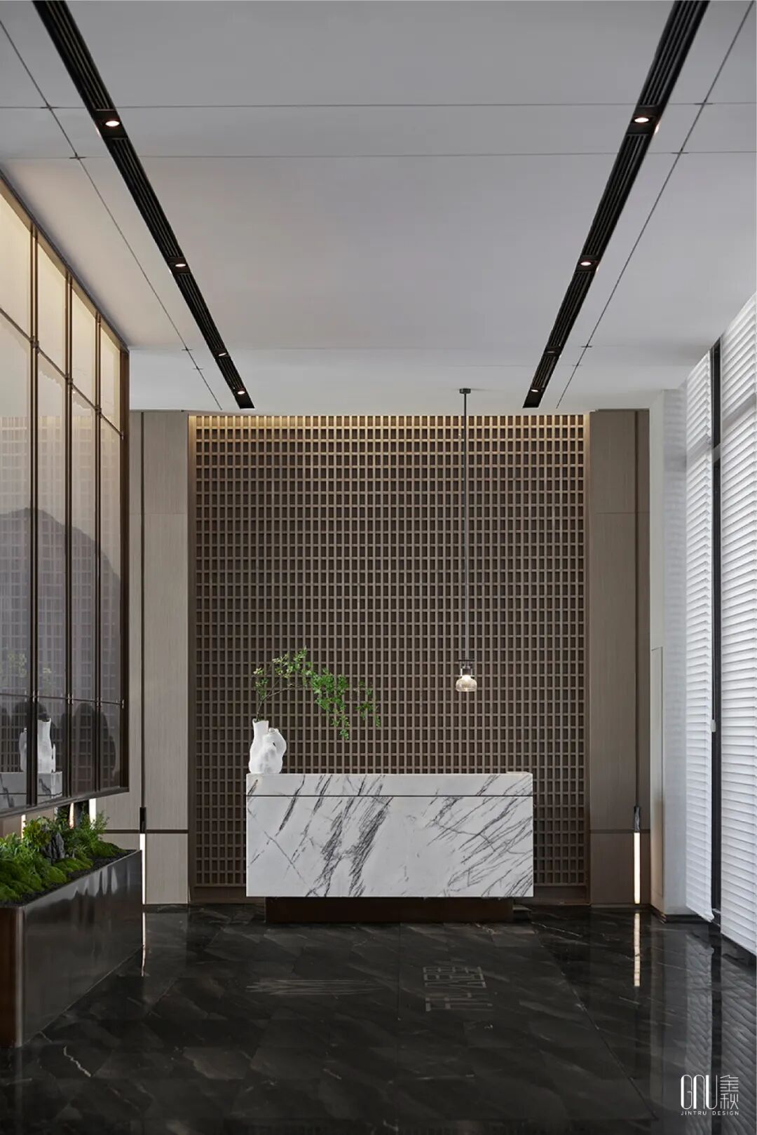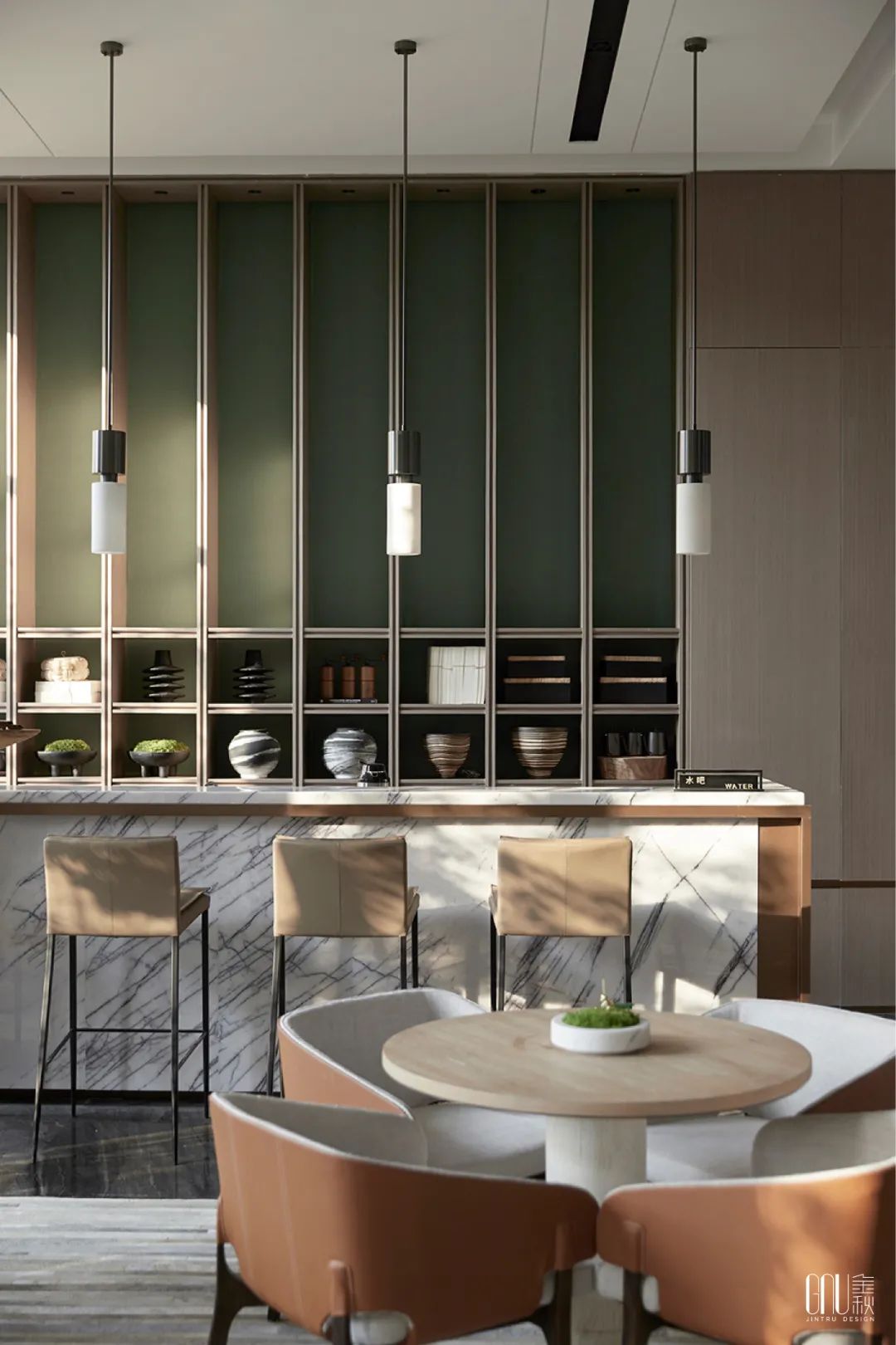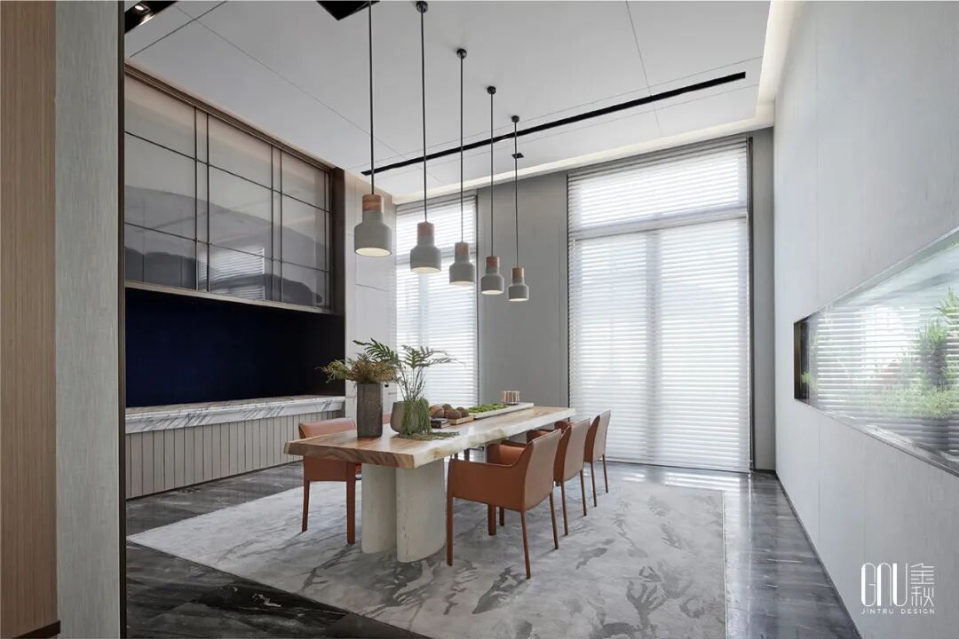 签约区的灯光以暖色为主,映照大理石折射出朦胧如梦的诗意感,整个空间呈现淡雅闲适的氛围,让人产生一种“偷得浮生半日闲”的梦幻体验。