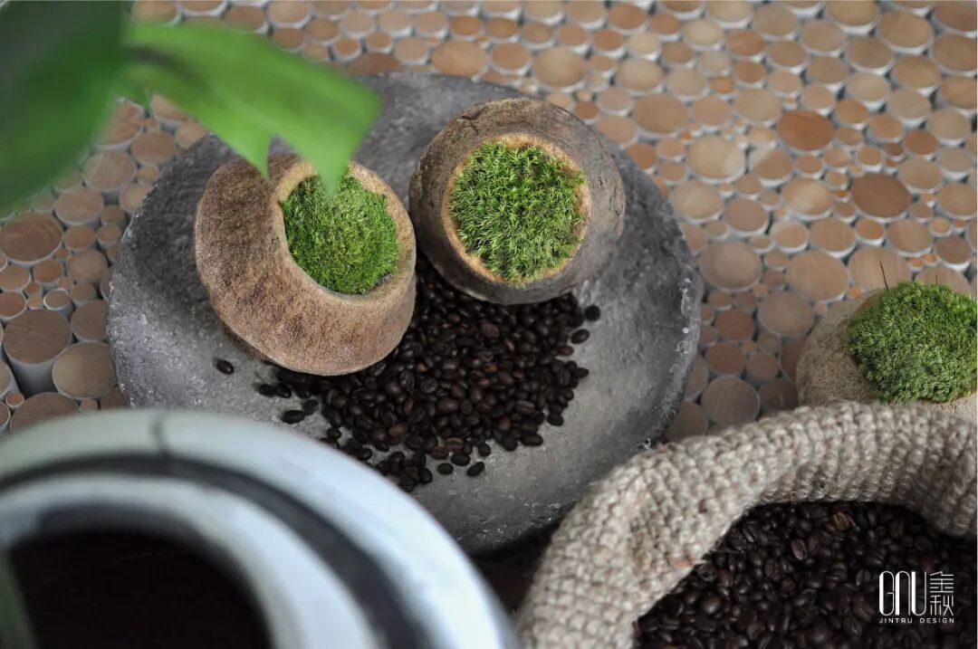 VIP室,通过旧物与自然构建起来的空间氛围,贯穿在空间的绿色植物和苔藓以及木作的茶几,将自然生长的状态表现出不同层级的肌理,让人感到一种历久的美感。