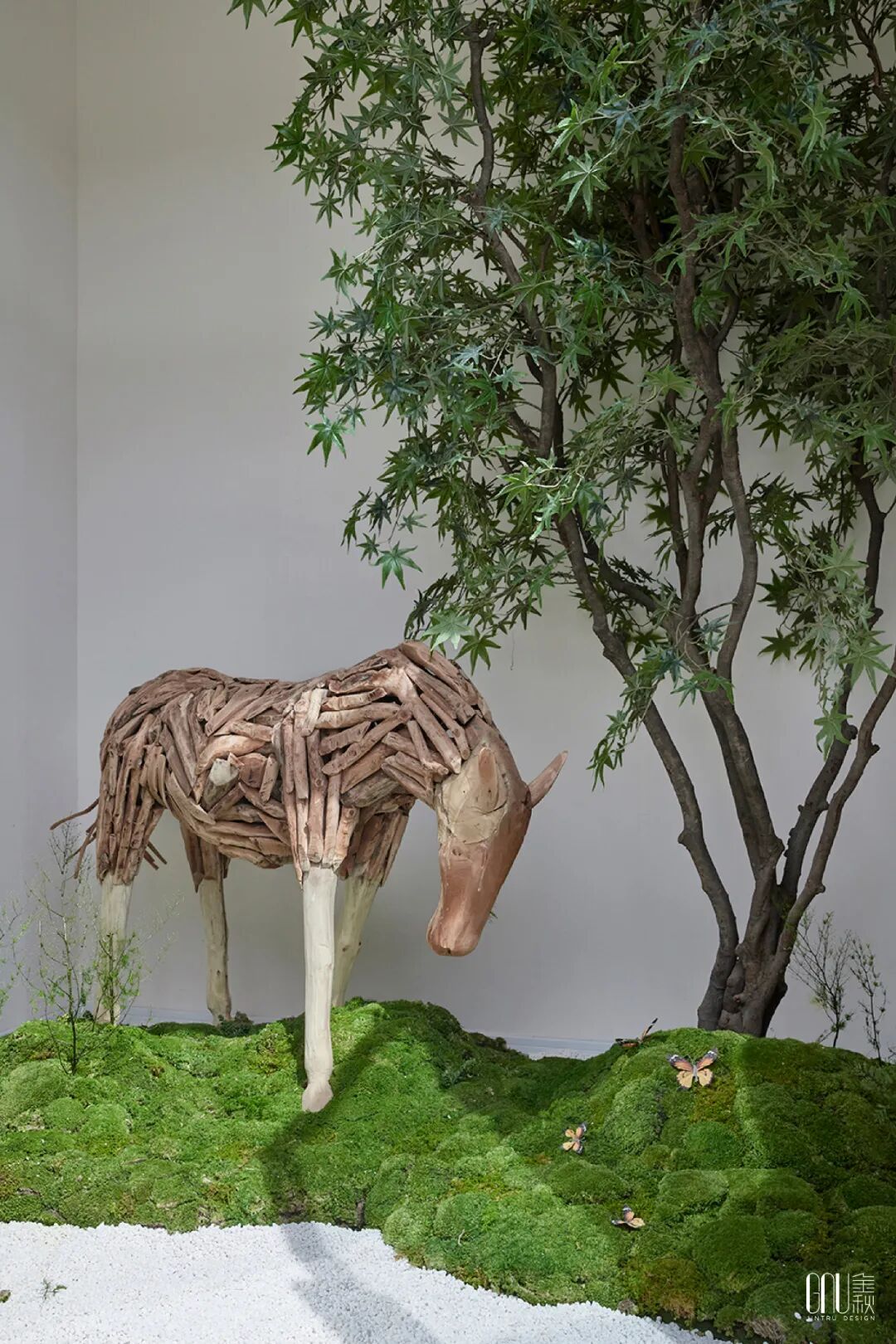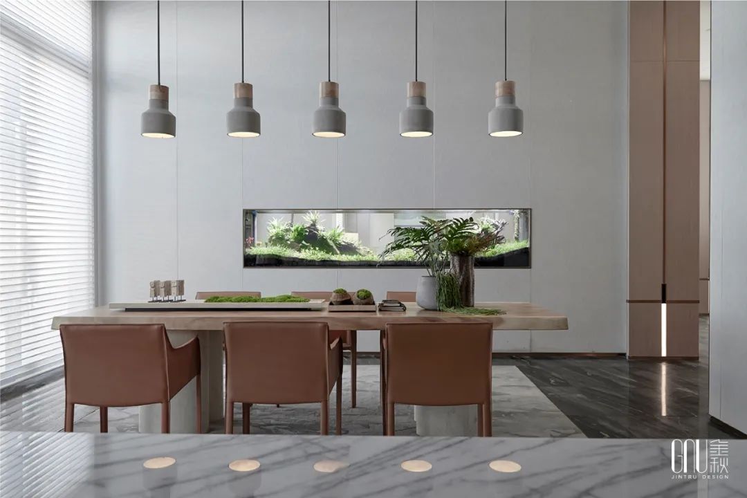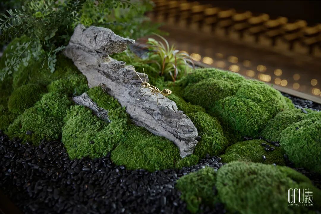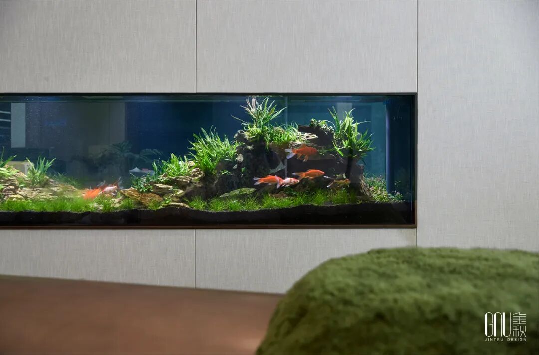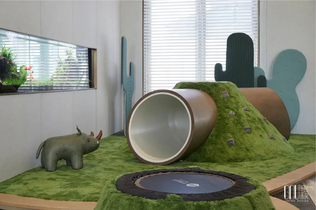 无论是青苔、树木,墙上的点缀画亦或儿童区的大片草坪,所到之处留下的,是悠柔的宁静,和童真的纯朴。室内的鱼缸十分引人注目,水草和着碧波游荡,金鱼穿梭自由,时间仿佛在此刻静止,留给人深沉的静谧享受。