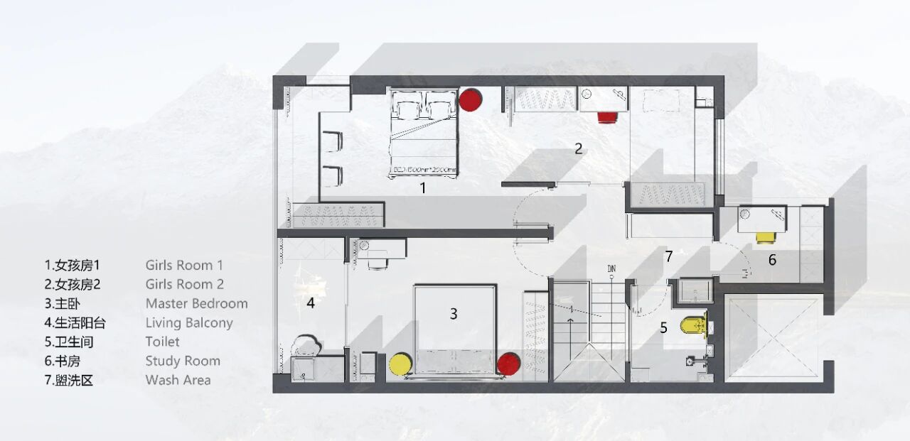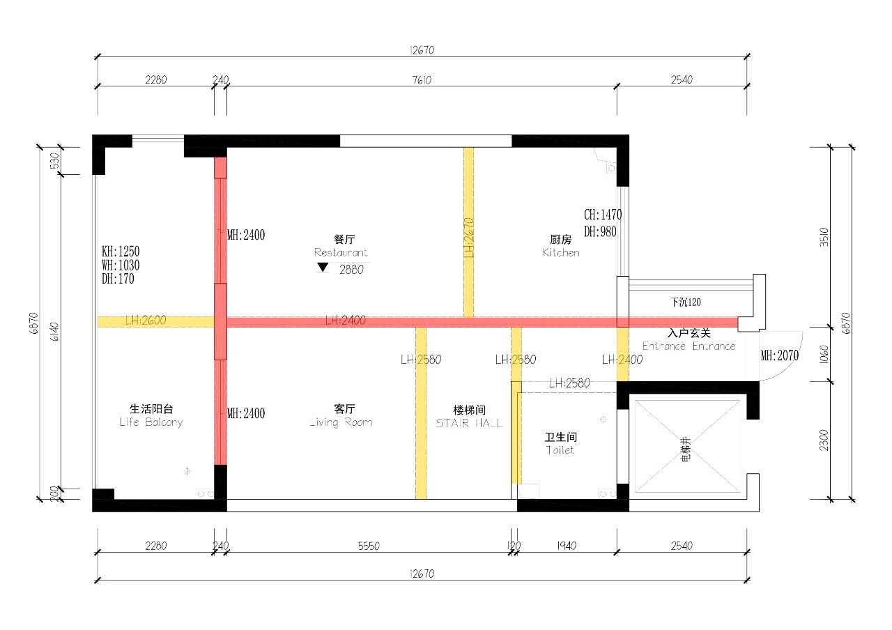一层原始结构图原结构虽然没有隔墙,看去非常敞开但是从原结构布局来看餐厅和客厅空间是偏小的,生活阳台偏大一层楼板很多的梁(红黄色标示处)特别是红色的2根主梁完成后高度只有2350 解决上面2个问题是本案的难点如果处理不好就会很散、很不好用