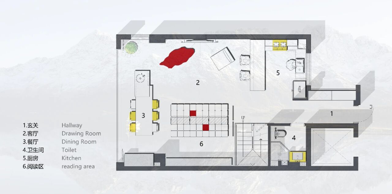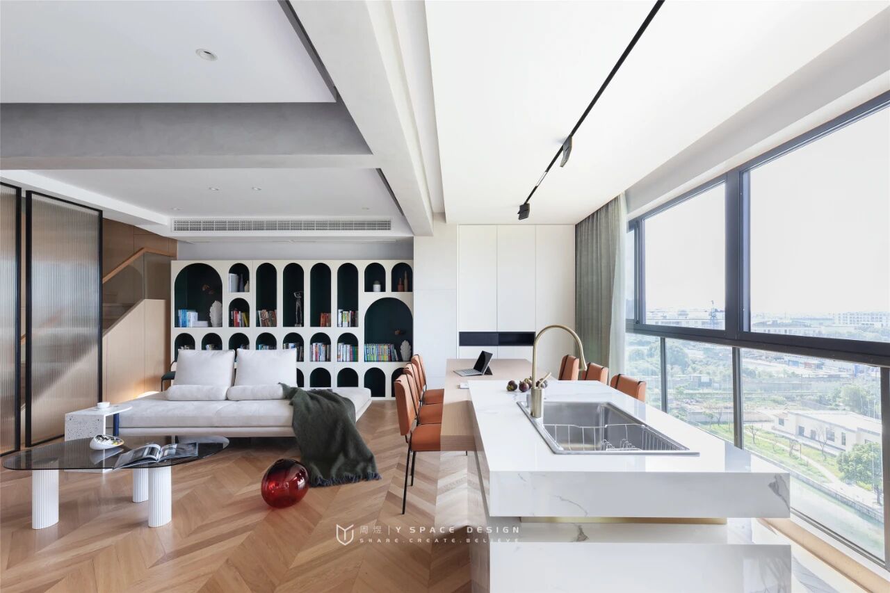 一层空间定义为动区我们打破原结构的思维局限将客餐厅区域转换成客厅和阅读区采用背靠背沙发进行连结原结构阳台区域改为阳光餐厅+中岛空间保持全敞开的同时也将每一寸空间都完全发挥了出来P. 03