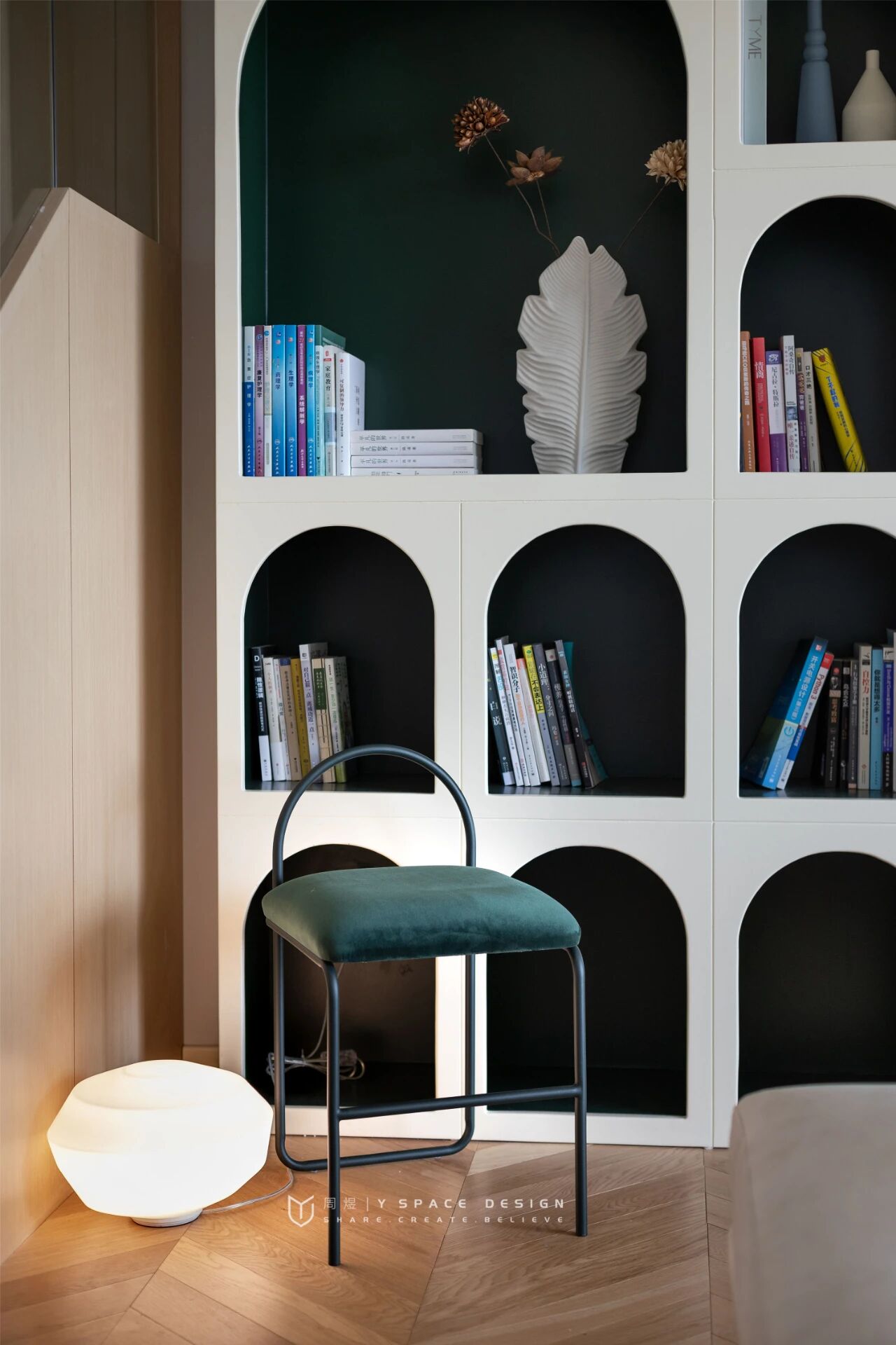 楼梯用成品科定木饰面包裹 扶手采用了整块通透白玻 让楼梯空间尽可能的敞亮 极具设计感的小椅子搭配一个落地灯 营造出惬意舒适阅读空间