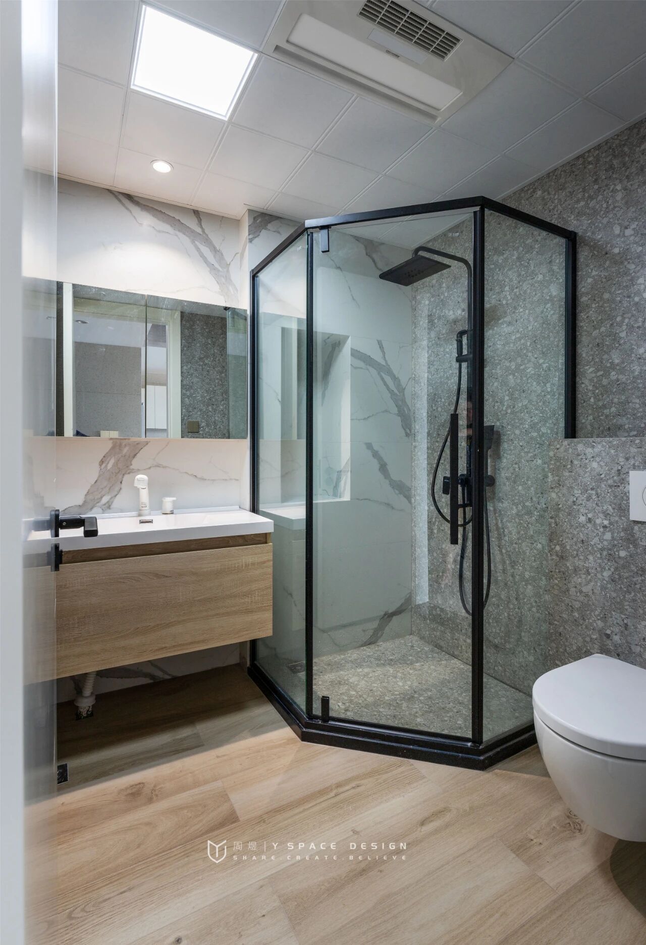 一层公共卫生间:因为卫生间没用窗户所以整体色调用的比较 希望打造一个没有任何人会抗拒的空间鱼肚白仿大理石砖+水磨石砖+仿地板砖结合