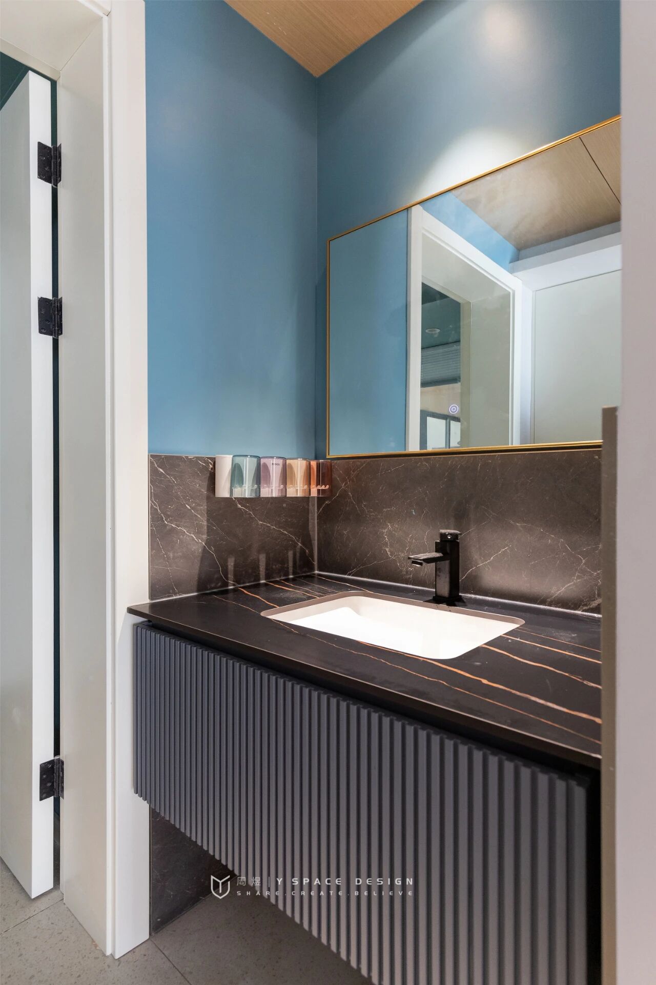二楼盥洗区:客户对这块深色系砖情有独钟 因此在盥洗区采用了半高的墙砖 瓷砖上墙面部分用蓝色艺术涂料 吊顶用了浅木色木饰面 中和了深色的台盆柜和墙砖 我们希望每一套案子都是为我们的客户所量身定制的 因此,为什么选蓝色艺术涂料作为空间的点缀色 肯定是有另一层寓意的 因为男主人名字中有个“波”字
