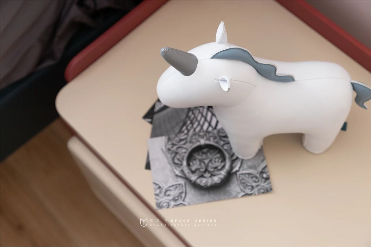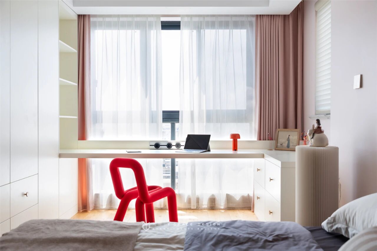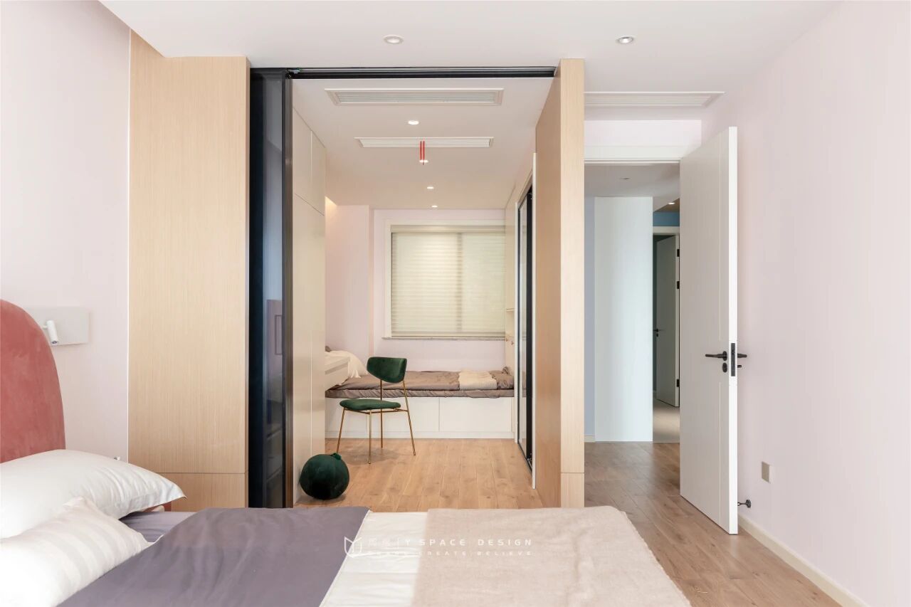 这套装修的使用计划是10年 从客户实际需求及房子使用寿命出发 设计了一稿较前卫且实用的平面方案 女儿房一和女孩房二之间的隔墙 采用三轨联动窄边框玻璃移门+纱帘结合 空间可开可合 大幅度提升了女孩房二的采光
