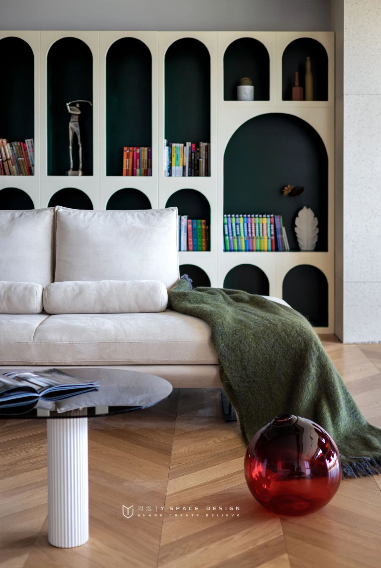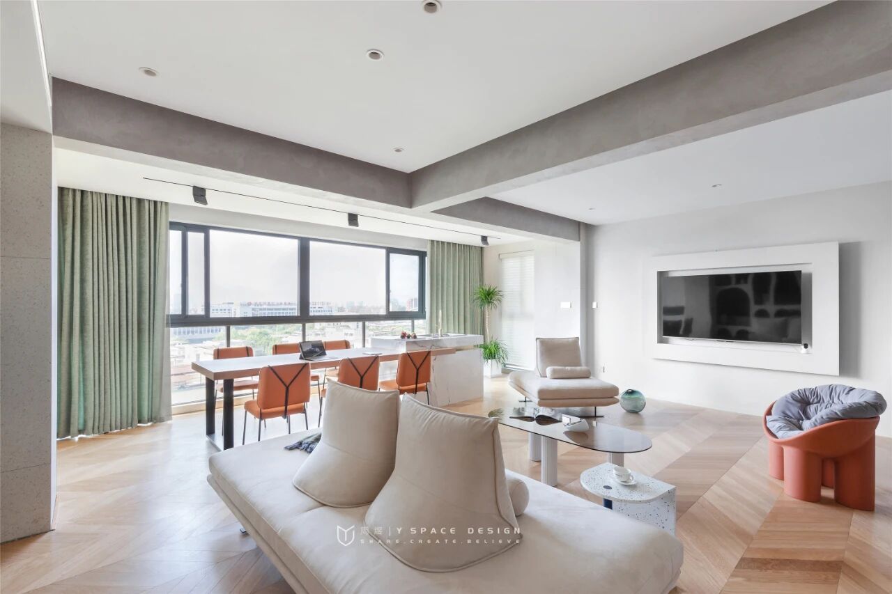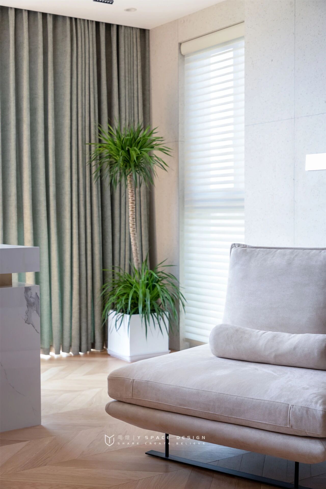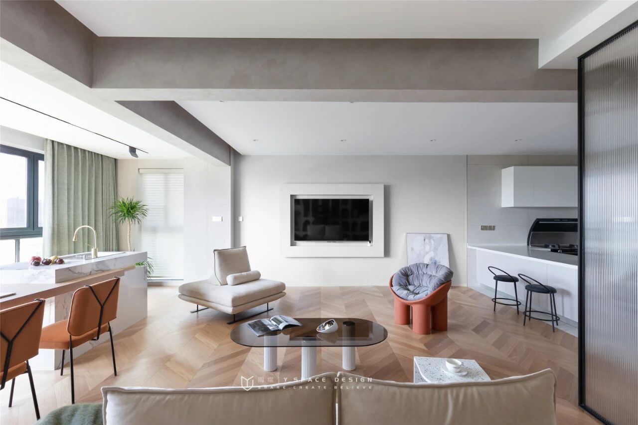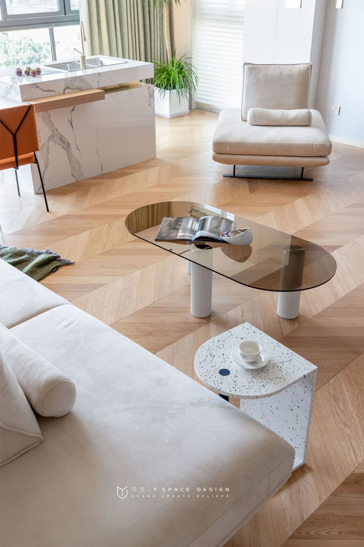 客厅区域假如放一块素色地毯 效果会更加好看,但从实际客户需求出发 这个地毯在后期生活中,并非必不可少 我们非常尊重客户的意见 也不断在践行形随机能的原则 尽可能让空间中每一件事物都有它独有的价值