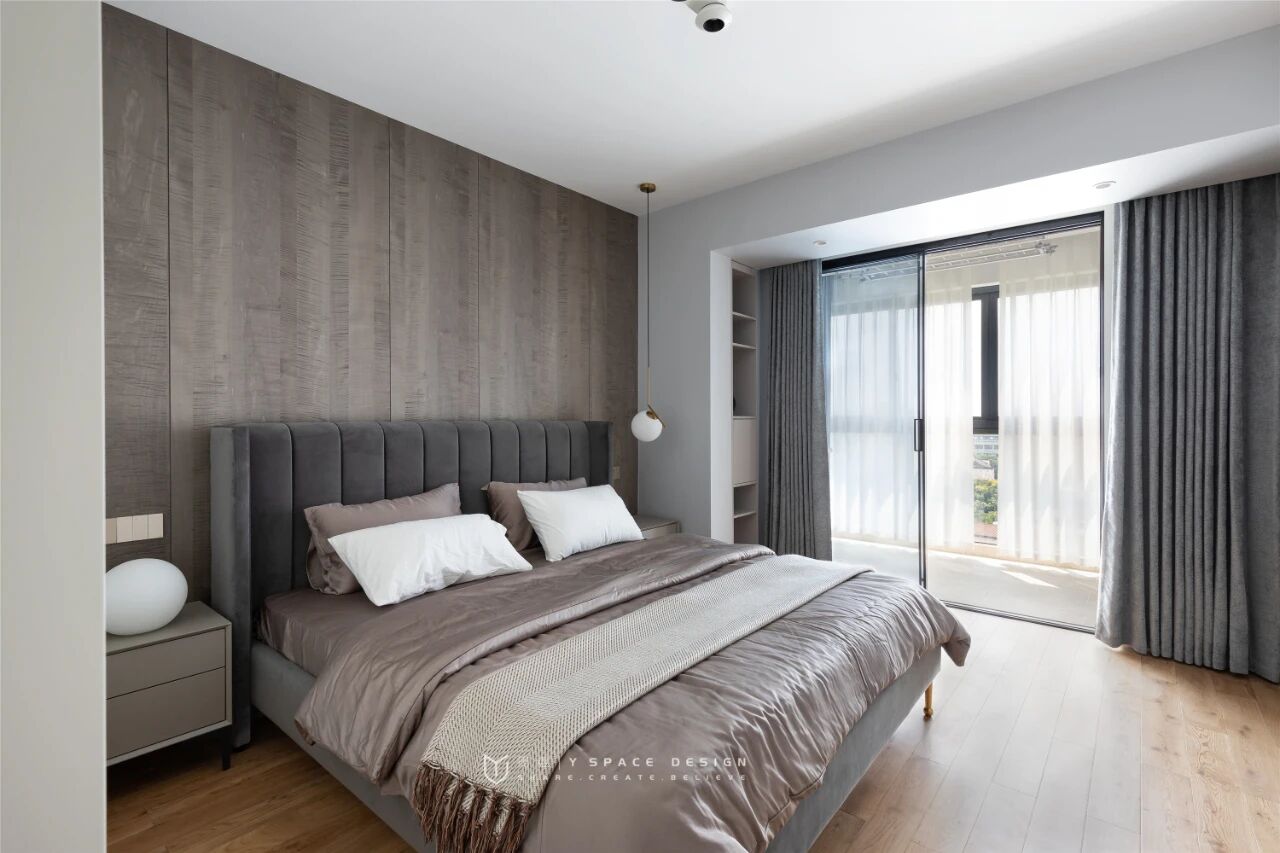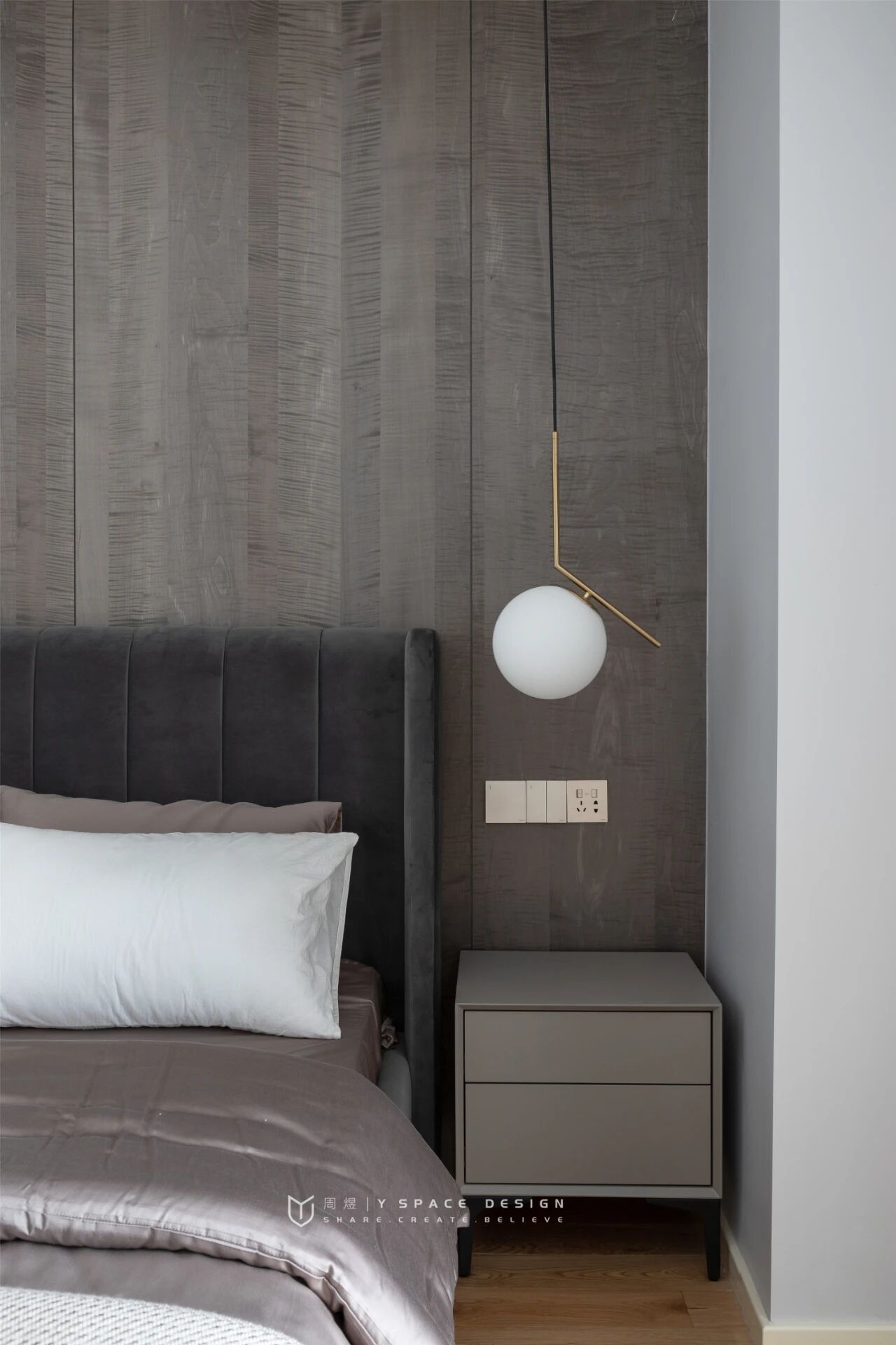主卧室:主卧继承了淋浴房的沉稳色系搭配 为了保证最大层高 主卧吊顶只下吊了3公分做隔音处理 灯具采用双头明装射灯 简约、别致