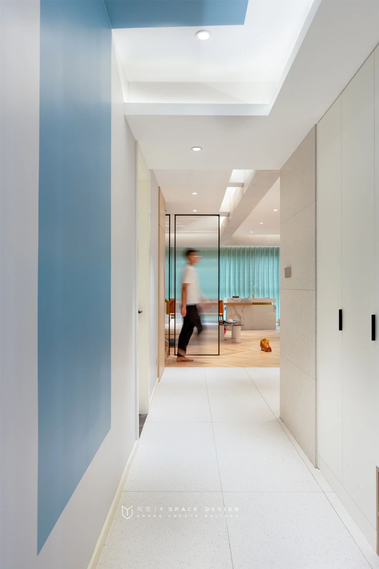 入户左边做了蓝色艺术涂料旨在营造入户仪式感, 当然仪式感有很多表现形式这里采用这种处理方式是有更深层的寓意男主人名字中有L,所以做了从墙到顶的L造型采用蓝色是因为男主人名字中有一个“波”字前方两根主梁组合成T字 正是女主人姓的首字母是TL与T彼此紧密结合共同打造了这个温馨的家庭