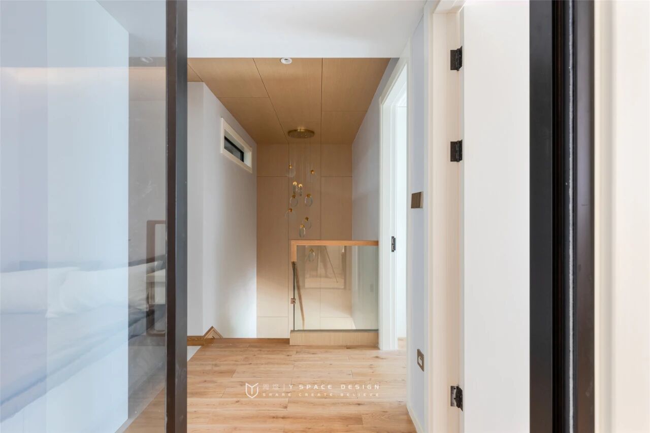 楼梯间 楼梯间科定木饰面从墙面延伸到顶面 有一种行云流水的感觉 同时也给相对较暗的楼梯间营造的更加温馨、明亮 左侧墙面开了一个高窗 目的是为了给卫生间增加采光