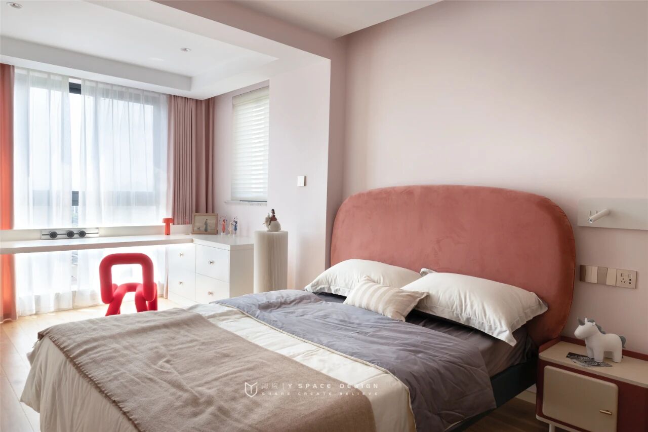 大女孩卧室 墙面和窗帘是浅粉 柜体和吊顶是纯白色 将床和书椅作为整个空间的主体 床头设计了简约的阅读灯 特别适合小孩子夜晚看漫画