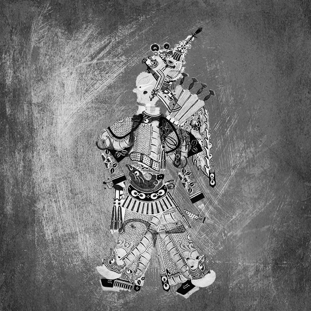 △归荣彪,《古影似梦》,布面油画,2200mm×2200mm,2020 以渭南华县皮影为载体,融入怀旧、古朴的色彩,写意似梦似幻的渭南古建筑,斑驳迷离地展示一种传统古文化的特殊魅力。新时代油画语言的介入,重新演绎、解构这一古老文化,赋予新的角度和理念。这种看似和典雅端庄相对立的俏皮美学,予人在安详中愉悦的特殊体验。
