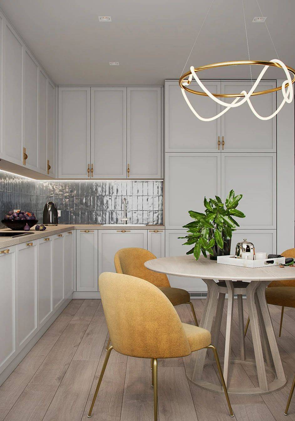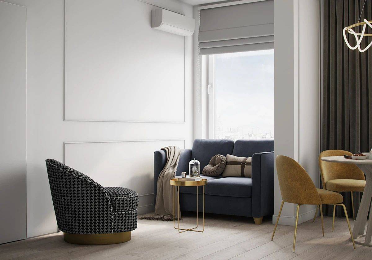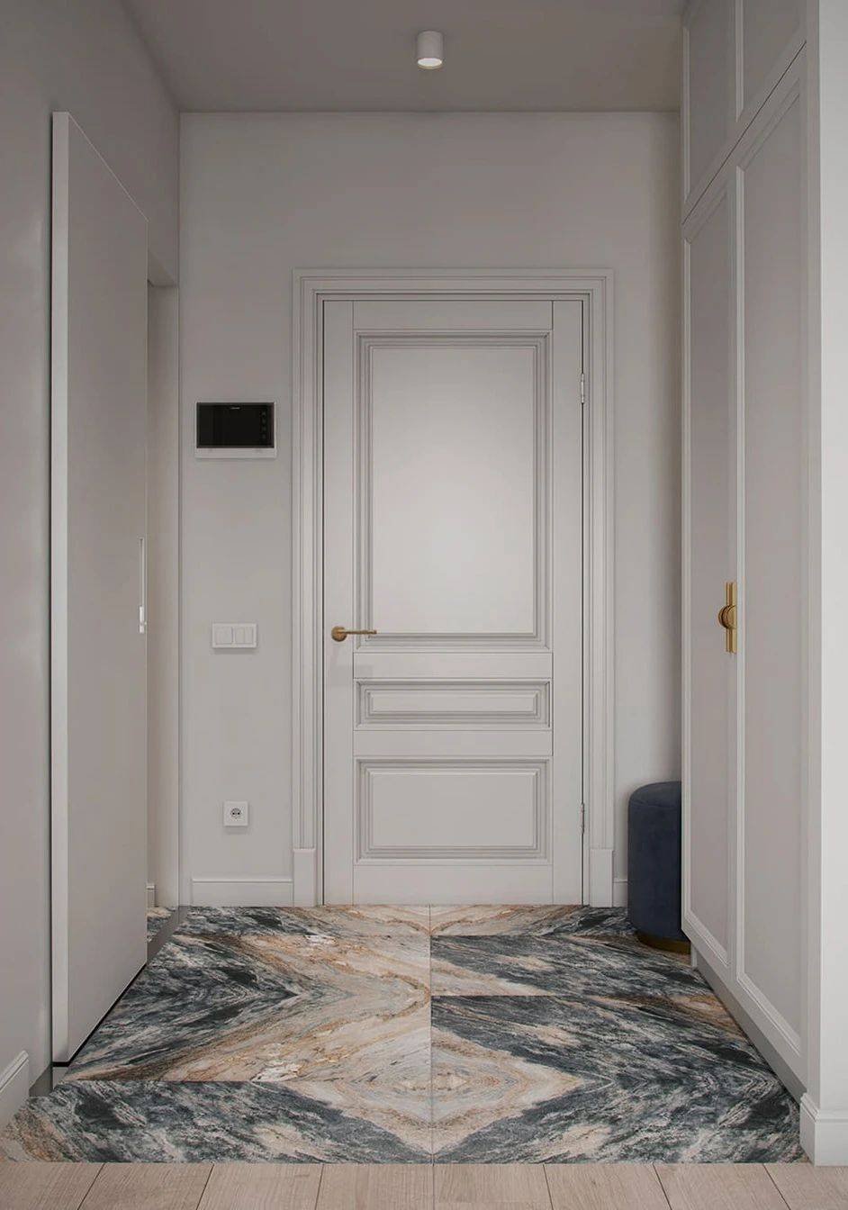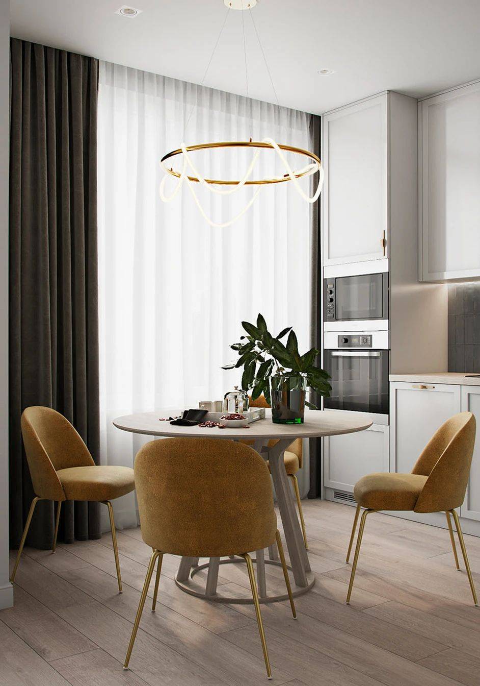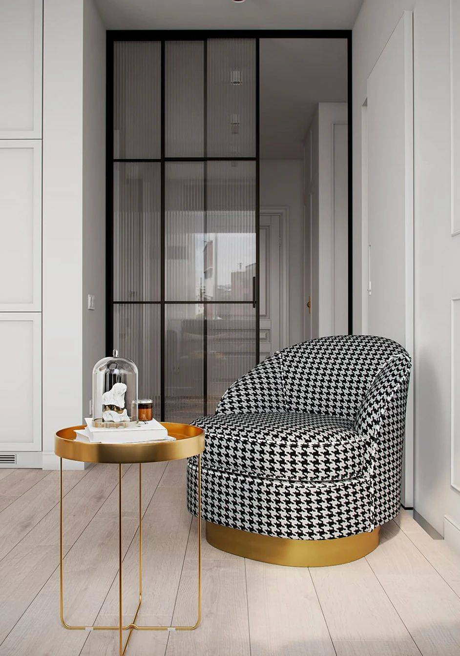 BODES Studio设计新作,面积90㎡的私人住宅位于莫斯科,空间素净简约的色调,高档细腻的材质激发非凡大气的视觉触感,黄铜色金属与部分色彩局部告别平静气氛,倾注一份轻快灵动的美感。 客厅灰色的布艺沙发,黄铜色的茶几,曲线形状的艺术吊灯,不同材质释放的灵魂在空间之中糅杂成景,透过材质本身传达温润、温暖的空间感受。 餐厨一体,厨房配有内置电器,橱柜的表面尽可能与墙面融合,黄色的餐椅和黄铜色相呼应,流动的美态本身就具有让人离不开视线的艺术张力。 餐厅旁边设计师利用窗前的位置设计成一个休闲空间,光线充足,看着视觉上还是让人感觉挺放松,享受生活的平淡温馨的小幸福。 玄关素雅的色调简洁大方,深色的石头地板与客厅的木地板形成鲜明对比,一旁是内置的镜子和收纳柜,配以深蓝色换鞋凳,自然大方,看着舒服。 卫生间整体以浅灰色磁砖为主,黑色的金属搭配,干湿分离,时尚质感的灯光渲染,让整个空间更有艺术感。 主卧采用蓝白色调为主,蕴含着舒适与慵懒,丝毫没有违和感,渐渐安抚了一天的浮躁,终于能静下神来,感受其中的静谧和光明。 卧室进门位置设计师利用床头的背景设计一个简易衣帽间,可以存放小物品,纺织饰品的装饰,营造出最舒适宜人的氛围。 主卫通过规划分割,完美实现功能与美感的结合,盎然有趣。