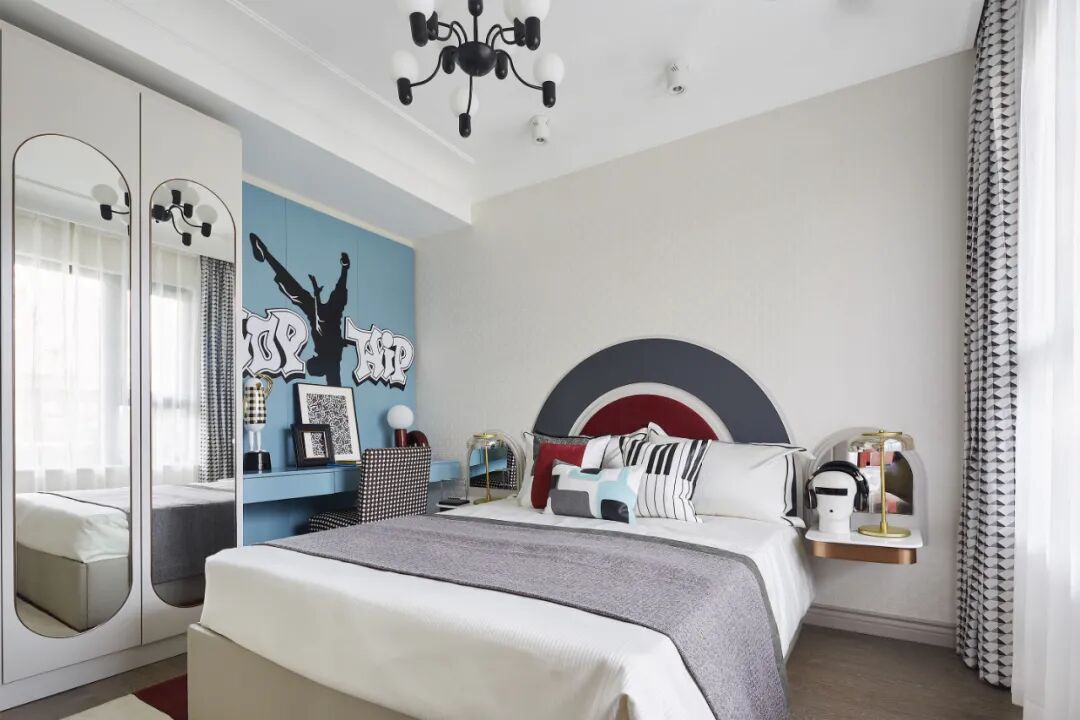 儿童房 KIDS BEDROOM 男孩房则采用红色与蓝色进行色彩碰撞:街头涂鸦艺术画带来跳跃的活力与动感超越固有的思维态势,表达了自由选择的艺术个性。