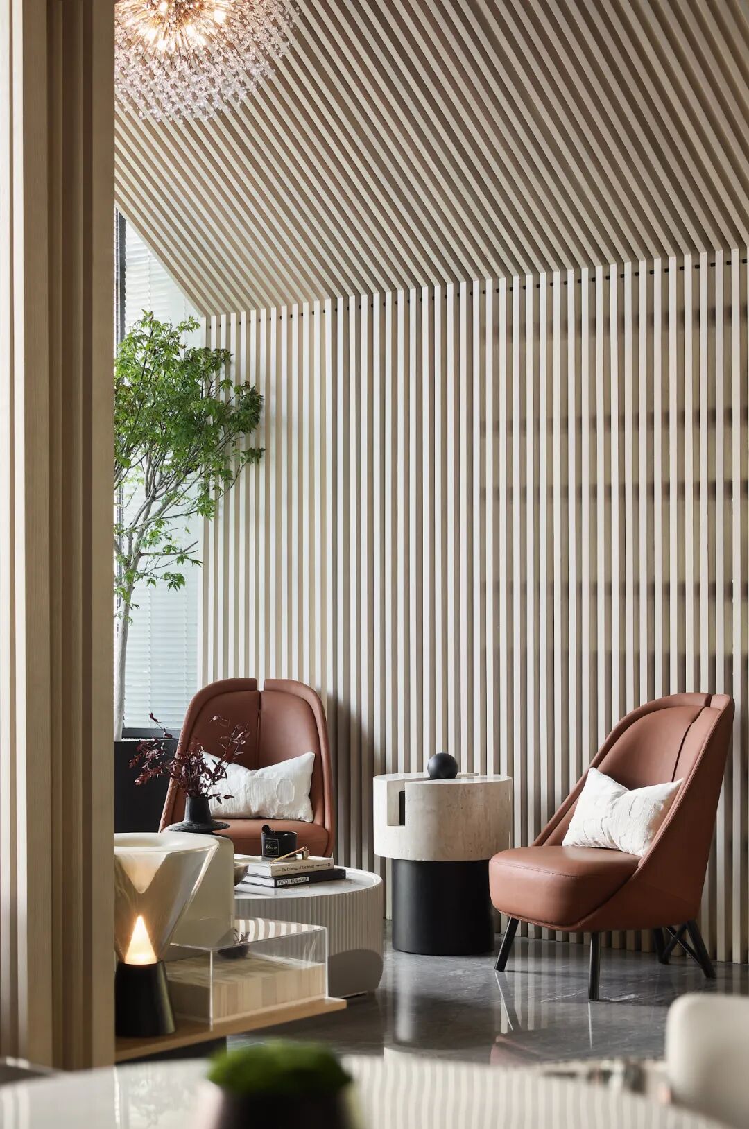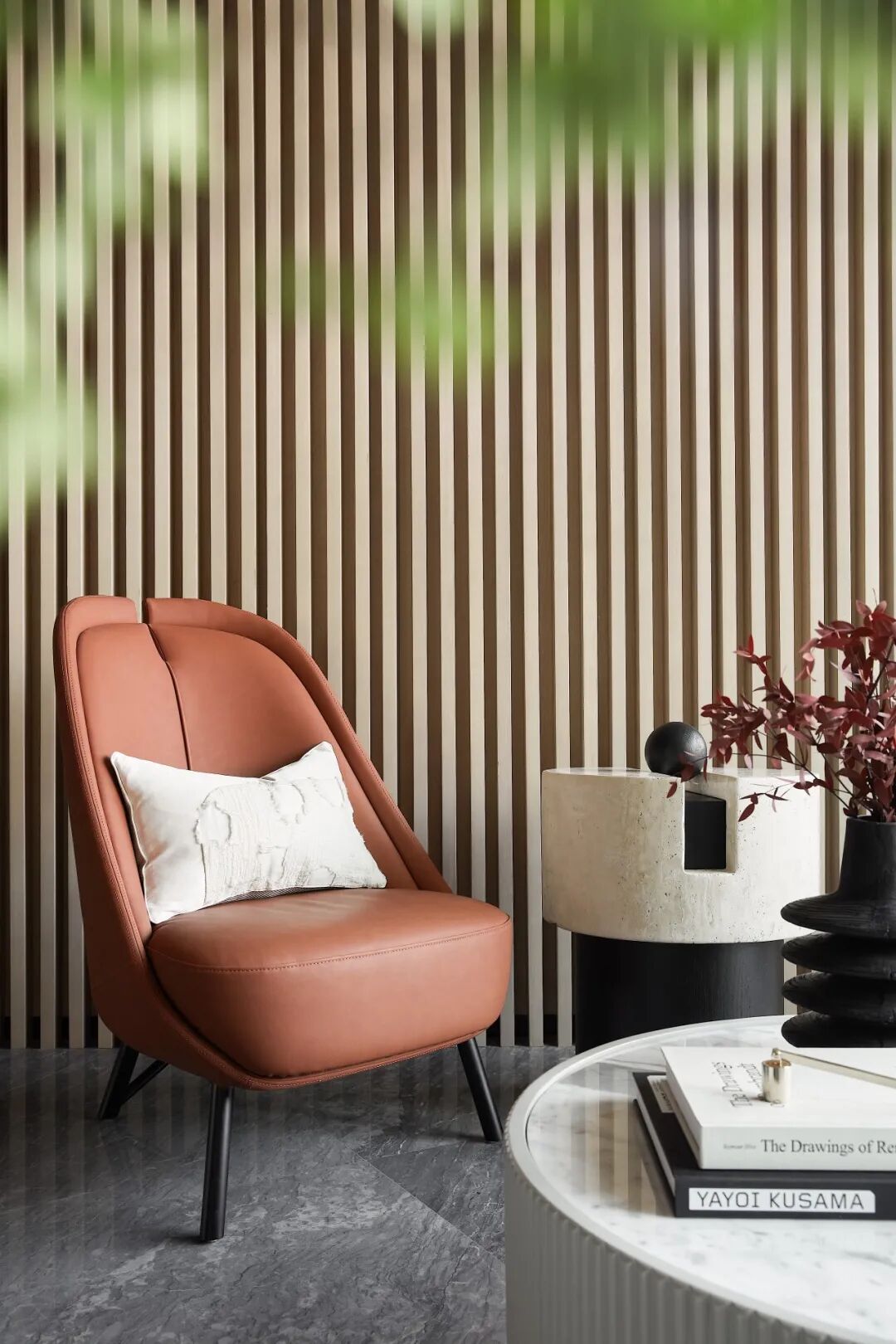 而VIP区则摒弃过于复杂的结构,用密集排列的竖纹肌理打造成原木小屋的造型,区分出单独的交流空间;上方悬挂一盏蒲公英形状的球灯,呈现含蓄内敛之美;橘红色的皮质座椅如秋叶般点缀其中,每一处都散发其闲适自如的气息。