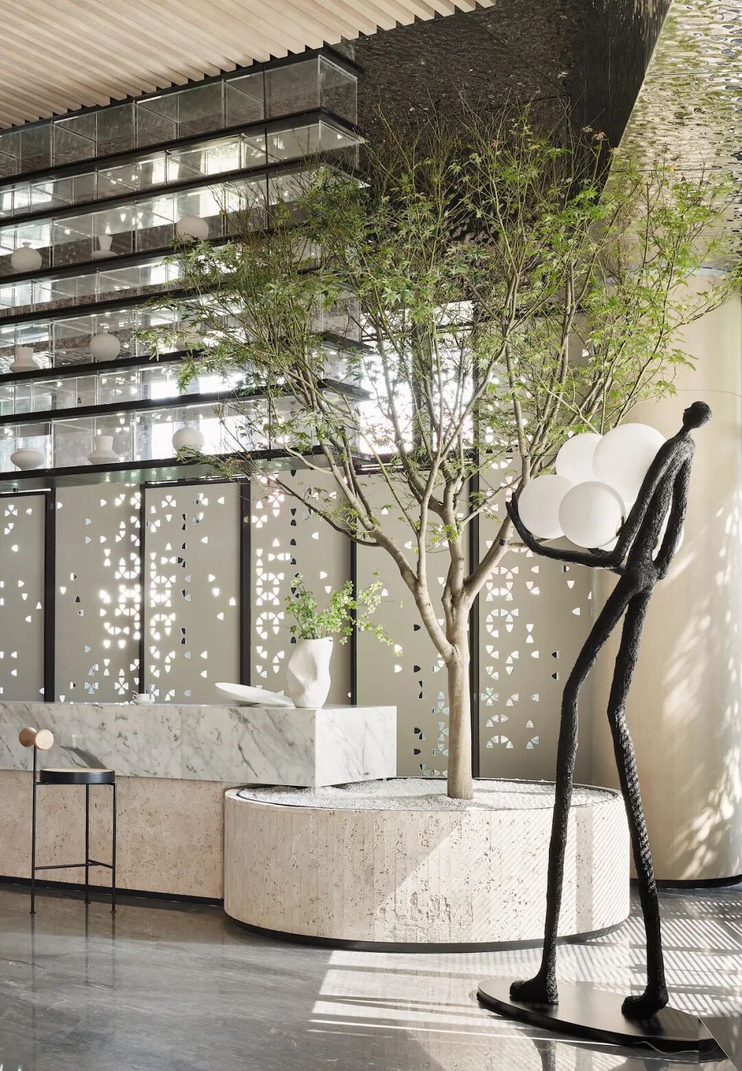 大面积镂空屏风作为一道独特透亮的的背景墙,既阻挡了大面积强光的直入,又能让室内的光线更加通透;光影透过屏风与树叶、陶瓷艺术品不期而遇,呈现出一种和谐与宁静之美。