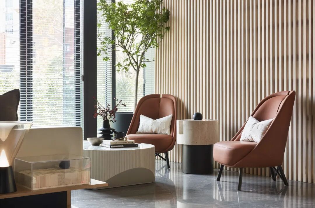 在洽谈区大厅,依然延续着大范围自然柔和的原木色。对于大厅的接待座椅,设计师巧妙采用晶莹的银色不锈钢包裹浅色皮质坐垫,在保持舒适度的同时,也为整个空间增添了一份高贵的光泽质感。
