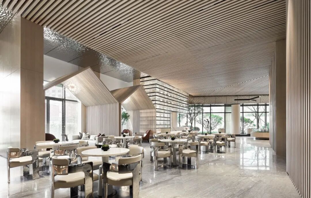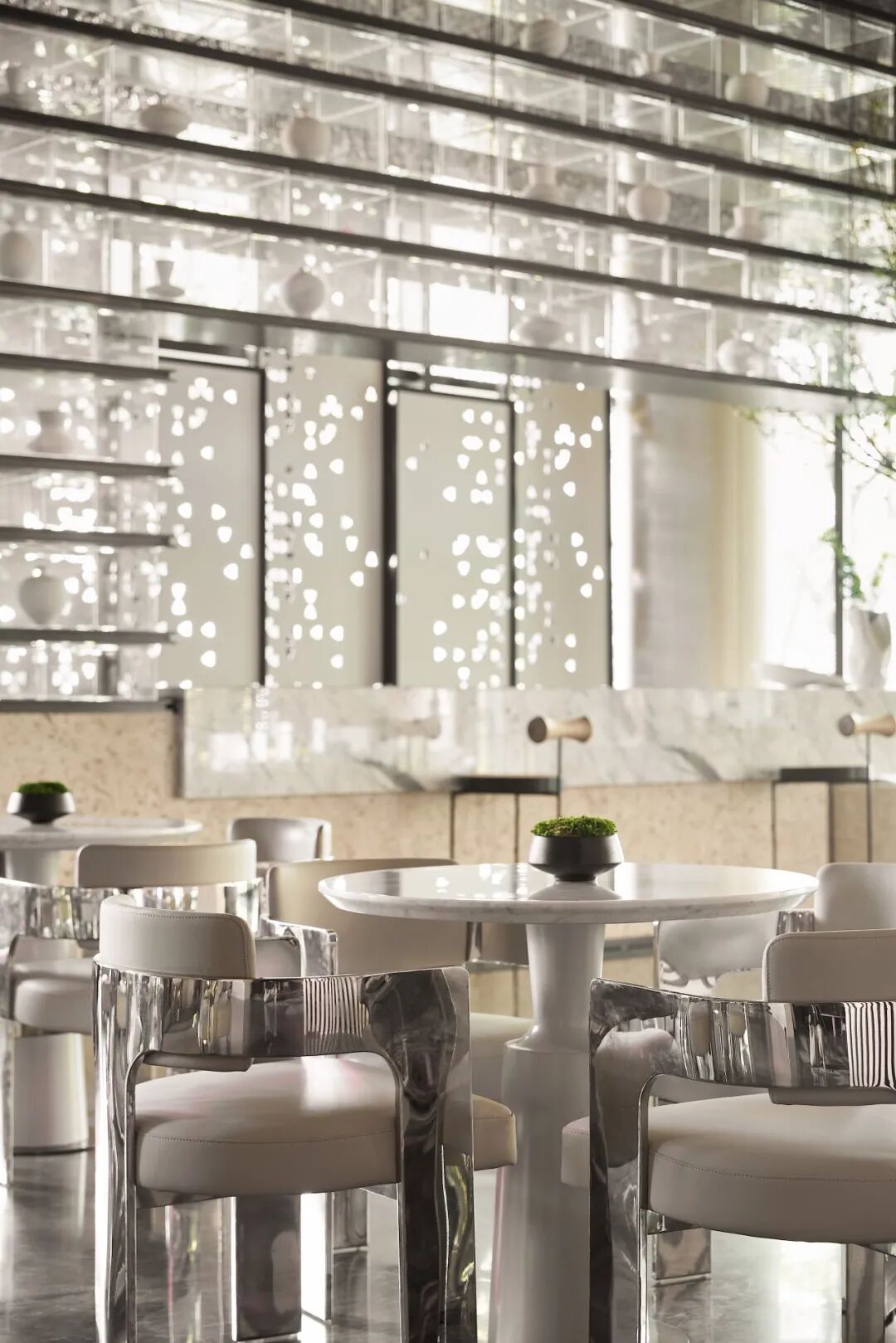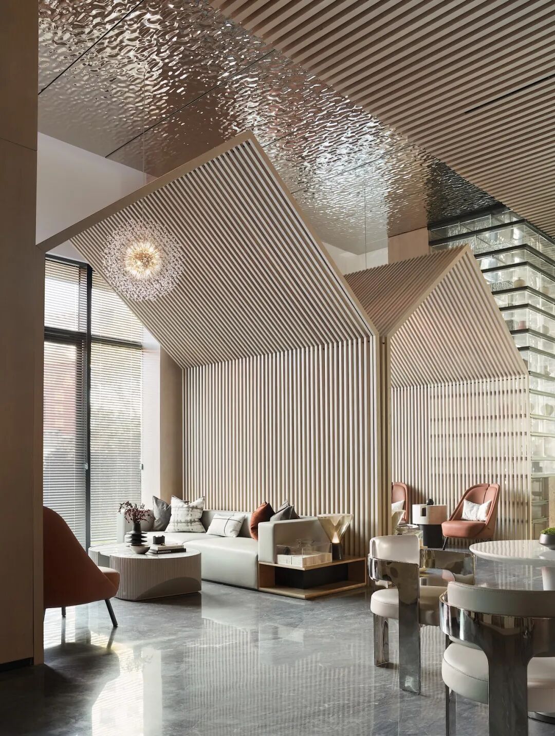 欲坠的水滴状壁挂、斑驳光影的水波浪形纹顶面和装饰,借由大自然处“湖面波光粼粼”为灵感而创作。以金属材质呈现这一来源大自然的精妙现象,表达别样的观触感。
