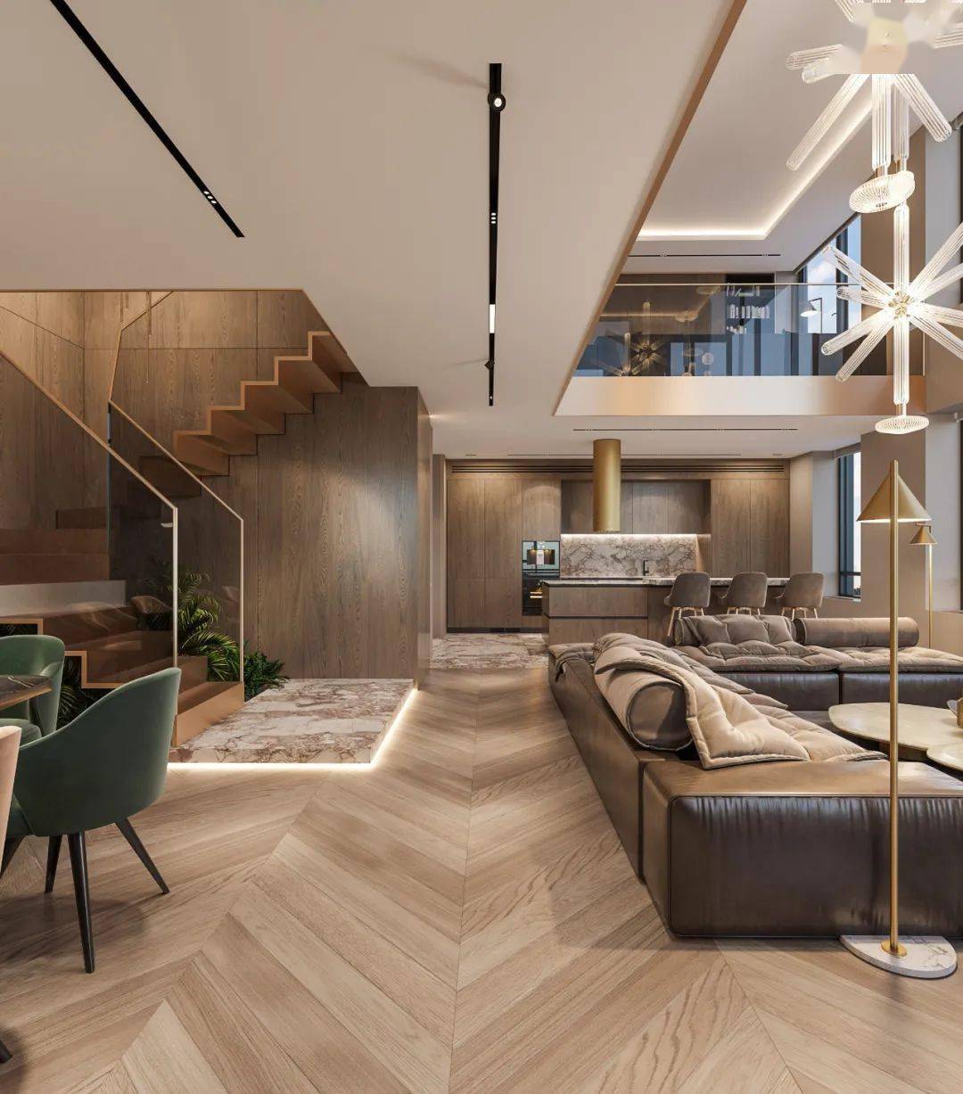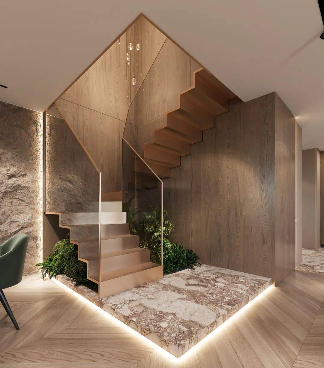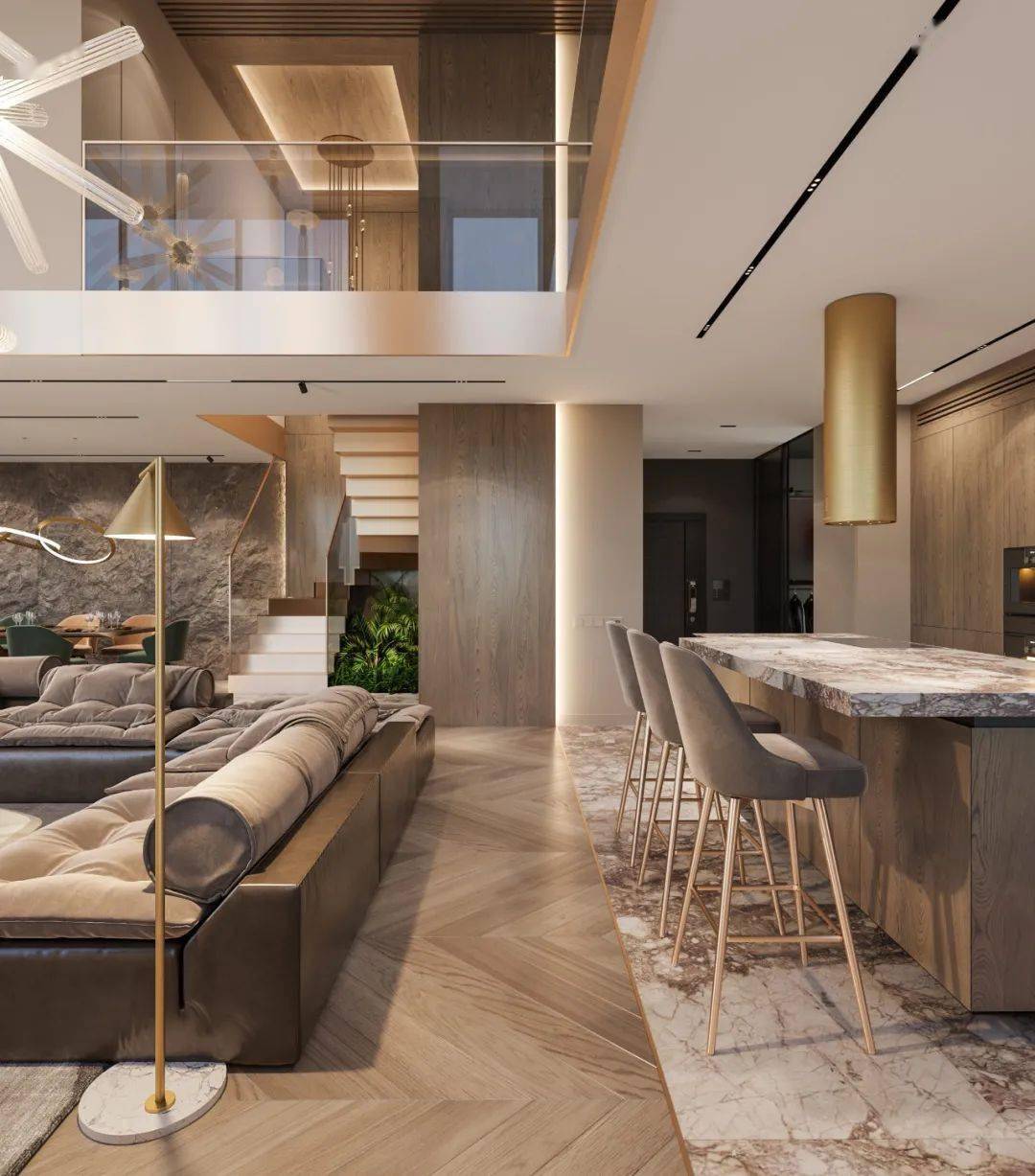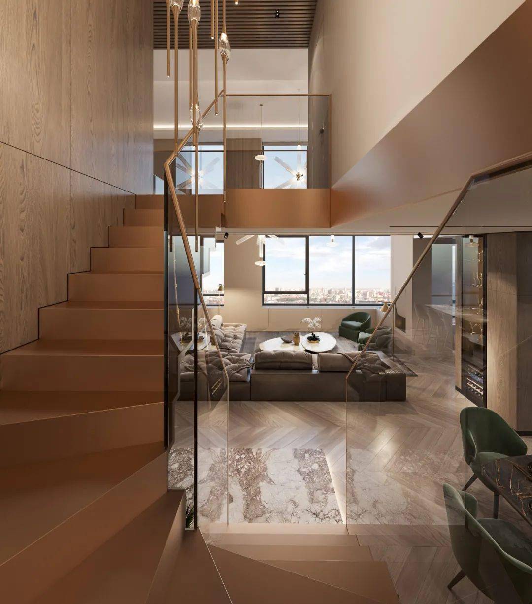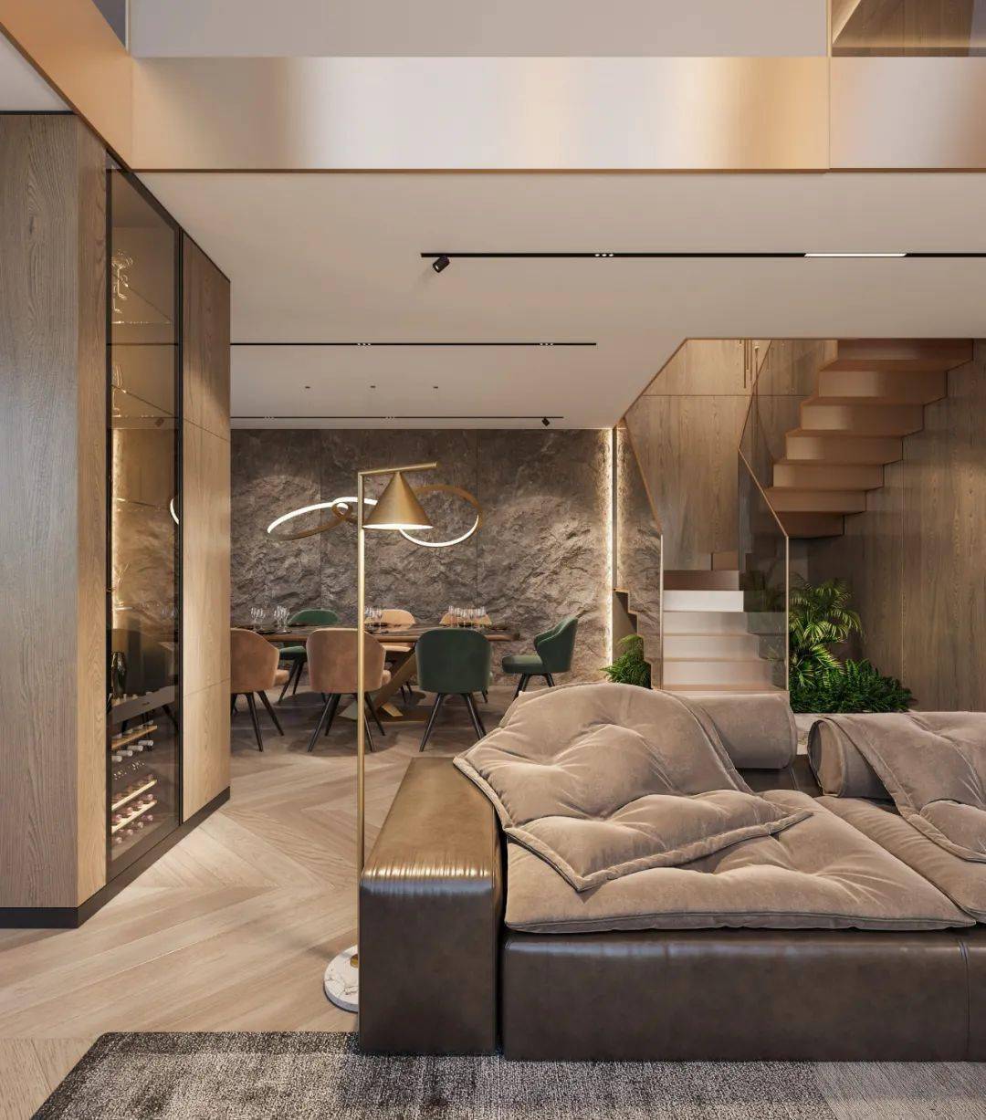 极简的空间里,加以木色渲染,舒缓而闲适,丰富的纹理填充带来流动化的视觉感知,交迭出更为舒适、温雅的空间体验。 △客厅 简致的客厅,展现出舒适的空间氛围,大理石与金属饰面组成的电视背景墙,勾勒出奢美、沉稳的气质 ,置入低矮的沙发,在自然光的铺洒下,铺叙出温馨之感。 △餐厨房 厨房与餐厅相互连通,L型的橱柜系统,以木、岩板、玻璃进行贯穿,无把手的柜体立面,秩序与质感兼具,岩板岛台延伸至木质餐桌,堆叠出温暖静谧的时光。 △衣帽间 简洁的衣帽间,墙柜一体的定制形式,简约又充满个性,格栅与吊柜的嵌入,打破了视觉平面的单调,方便了收纳,也拓展了空间。 △卫生间 卫生间延续整体的基调,温润的纹理与极简的线条排布,将空间带入恬静的氛围之中,圆柱体的洗手台设计,展露出简而具质感的高定原则。 其它案例 ▼ △门厅 门厅处设计了走入式衣帽间,透明的玻璃拉开了低调舒缓的生活节奏,错落分布的收纳区域,满足日常收纳需求。 △客厅 开放式的客厅,简中带奢,将优雅、精致完全释放,低矮的大理石茶几,个性的吊灯,升华了轻奢的格调,营造出一个有品质的休憩空间。 △厨房 橱柜系统以木铺地,有序的线条切割,舒适的饰面,简致又彰显大气,温润的木饰面与大理石在岛台进一步延伸,呈现沉稳高级的视觉。 △餐厅 餐厅空间以鱼骨拼接地板为基底,岩石墙面做装饰,嵌入岩板餐桌、双色餐椅为视觉调和,内敛中彰显优雅本性。 △楼梯 玻璃与金属板堆叠出简约且精致的楼梯空间,木饰面作护墙,艺术吊灯垂坠而下,赋予了空间艺术之美,彰显通透、摩登。 △休息区 轻简的电视墙柜,以极简的木饰面呈现,赋予了空间更平静、更舒适的视觉体验,镂空设计,大理石的融入,抓取视觉焦点,打破沉闷的家装设计。