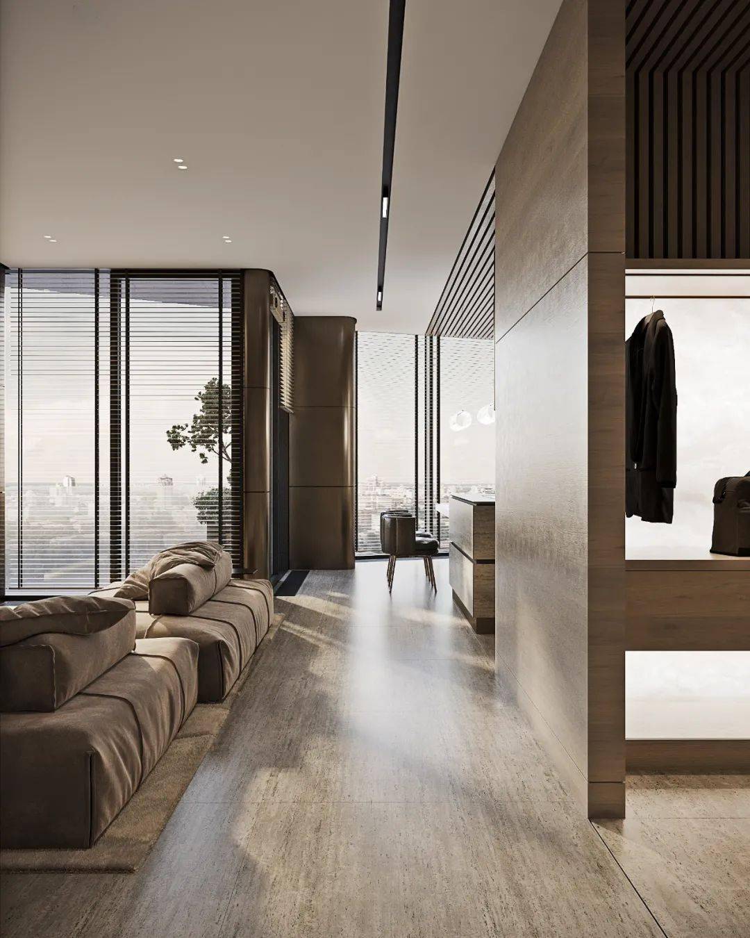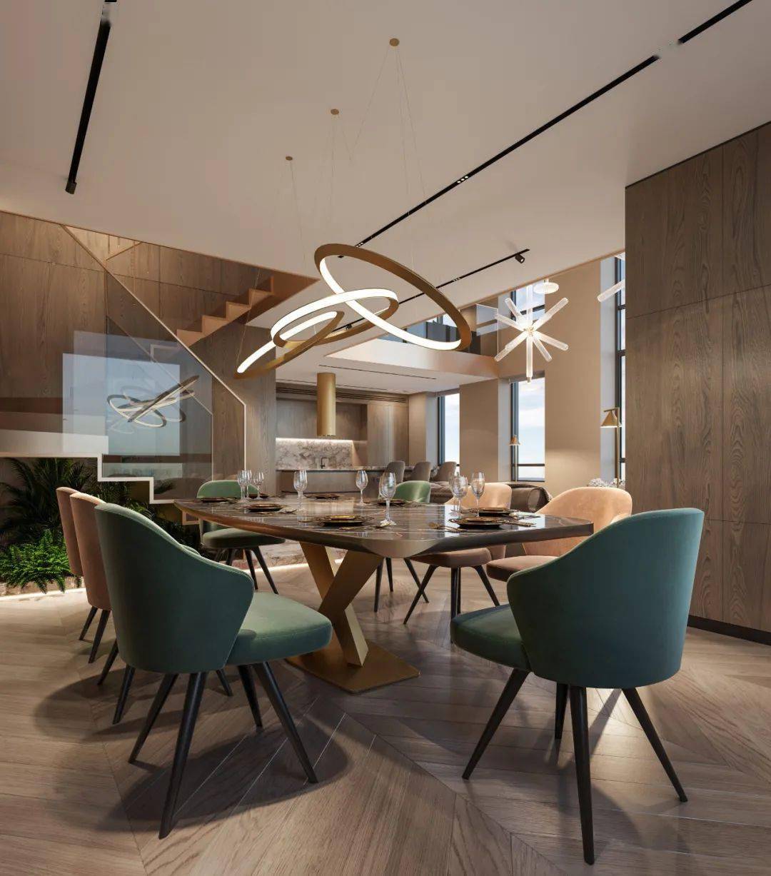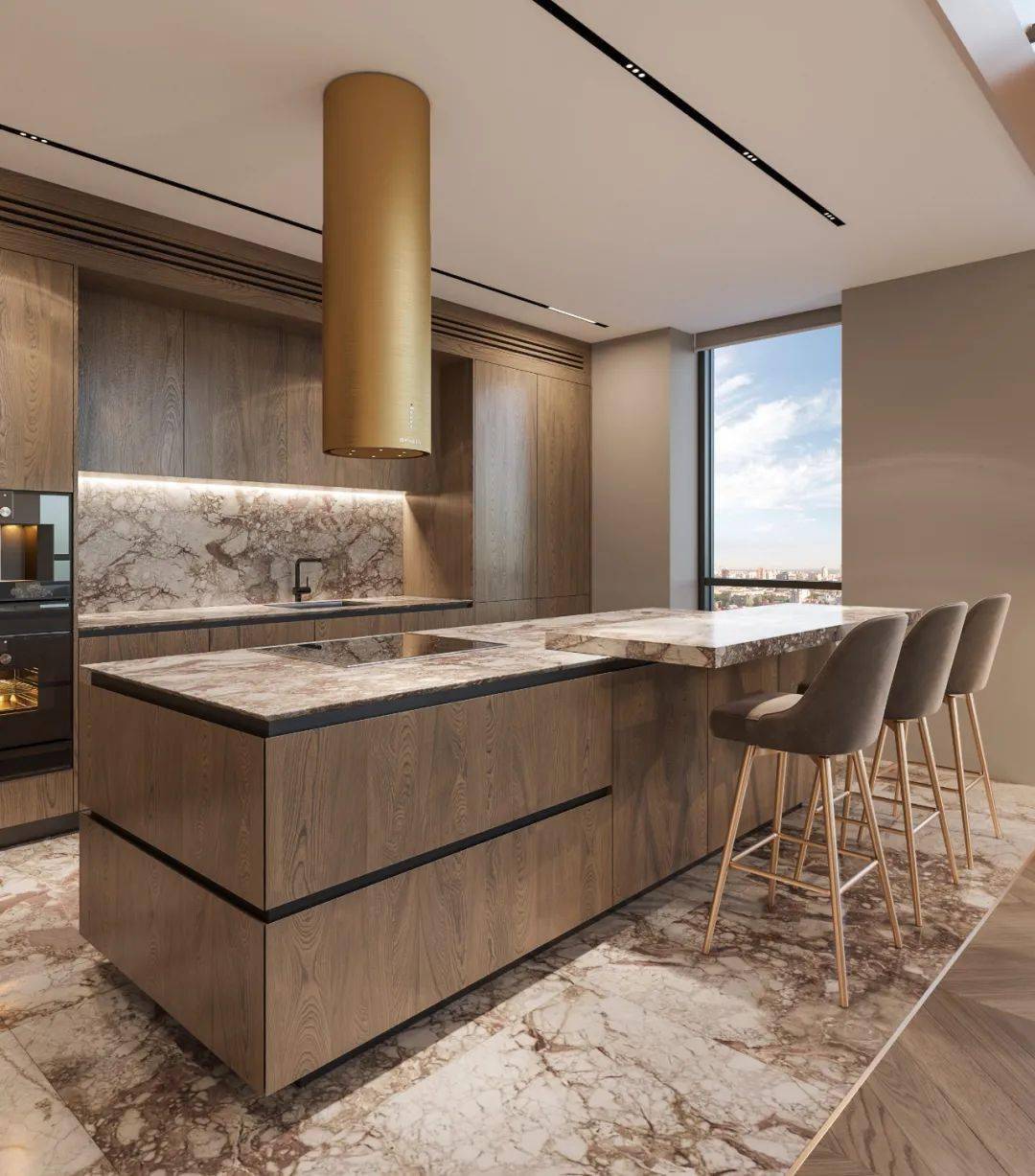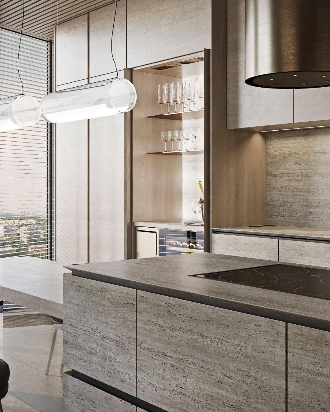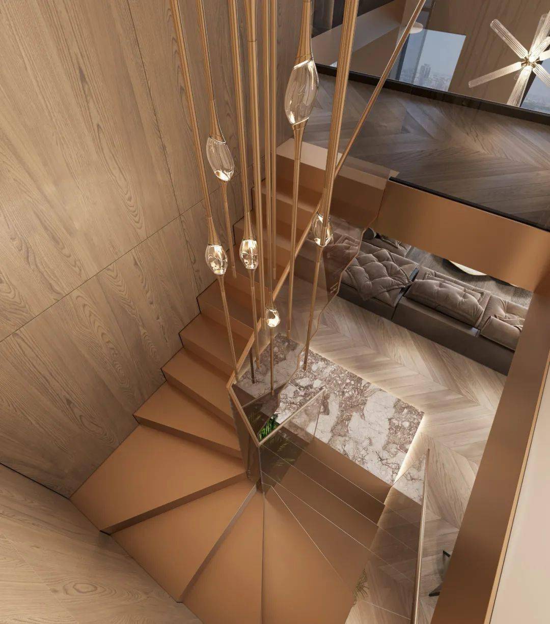 极简的空间里,加以木色渲染,舒缓而闲适,丰富的纹理填充带来流动化的视觉感知,交迭出更为舒适、温雅的空间体验。 △客厅 简致的客厅,展现出舒适的空间氛围,大理石与金属饰面组成的电视背景墙,勾勒出奢美、沉稳的气质 ,置入低矮的沙发,在自然光的铺洒下,铺叙出温馨之感。 △餐厨房 厨房与餐厅相互连通,L型的橱柜系统,以木、岩板、玻璃进行贯穿,无把手的柜体立面,秩序与质感兼具,岩板岛台延伸至木质餐桌,堆叠出温暖静谧的时光。 △衣帽间 简洁的衣帽间,墙柜一体的定制形式,简约又充满个性,格栅与吊柜的嵌入,打破了视觉平面的单调,方便了收纳,也拓展了空间。 △卫生间 卫生间延续整体的基调,温润的纹理与极简的线条排布,将空间带入恬静的氛围之中,圆柱体的洗手台设计,展露出简而具质感的高定原则。 其它案例 ▼ △门厅 门厅处设计了走入式衣帽间,透明的玻璃拉开了低调舒缓的生活节奏,错落分布的收纳区域,满足日常收纳需求。 △客厅 开放式的客厅,简中带奢,将优雅、精致完全释放,低矮的大理石茶几,个性的吊灯,升华了轻奢的格调,营造出一个有品质的休憩空间。 △厨房 橱柜系统以木铺地,有序的线条切割,舒适的饰面,简致又彰显大气,温润的木饰面与大理石在岛台进一步延伸,呈现沉稳高级的视觉。 △餐厅 餐厅空间以鱼骨拼接地板为基底,岩石墙面做装饰,嵌入岩板餐桌、双色餐椅为视觉调和,内敛中彰显优雅本性。 △楼梯 玻璃与金属板堆叠出简约且精致的楼梯空间,木饰面作护墙,艺术吊灯垂坠而下,赋予了空间艺术之美,彰显通透、摩登。 △休息区 轻简的电视墙柜,以极简的木饰面呈现,赋予了空间更平静、更舒适的视觉体验,镂空设计,大理石的融入,抓取视觉焦点,打破沉闷的家装设计。