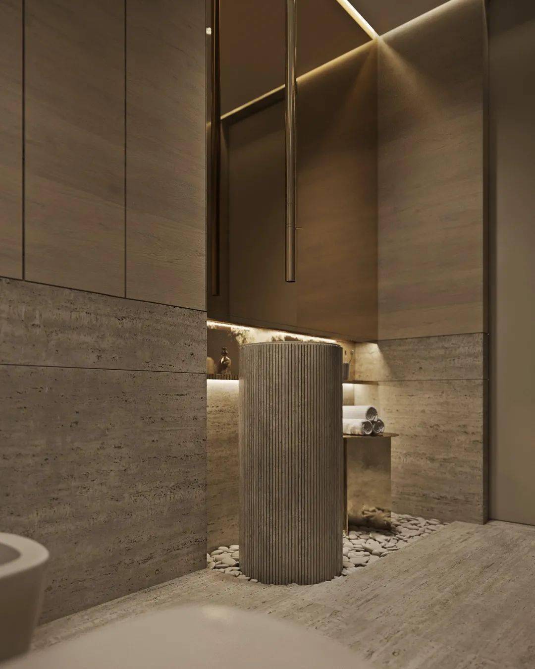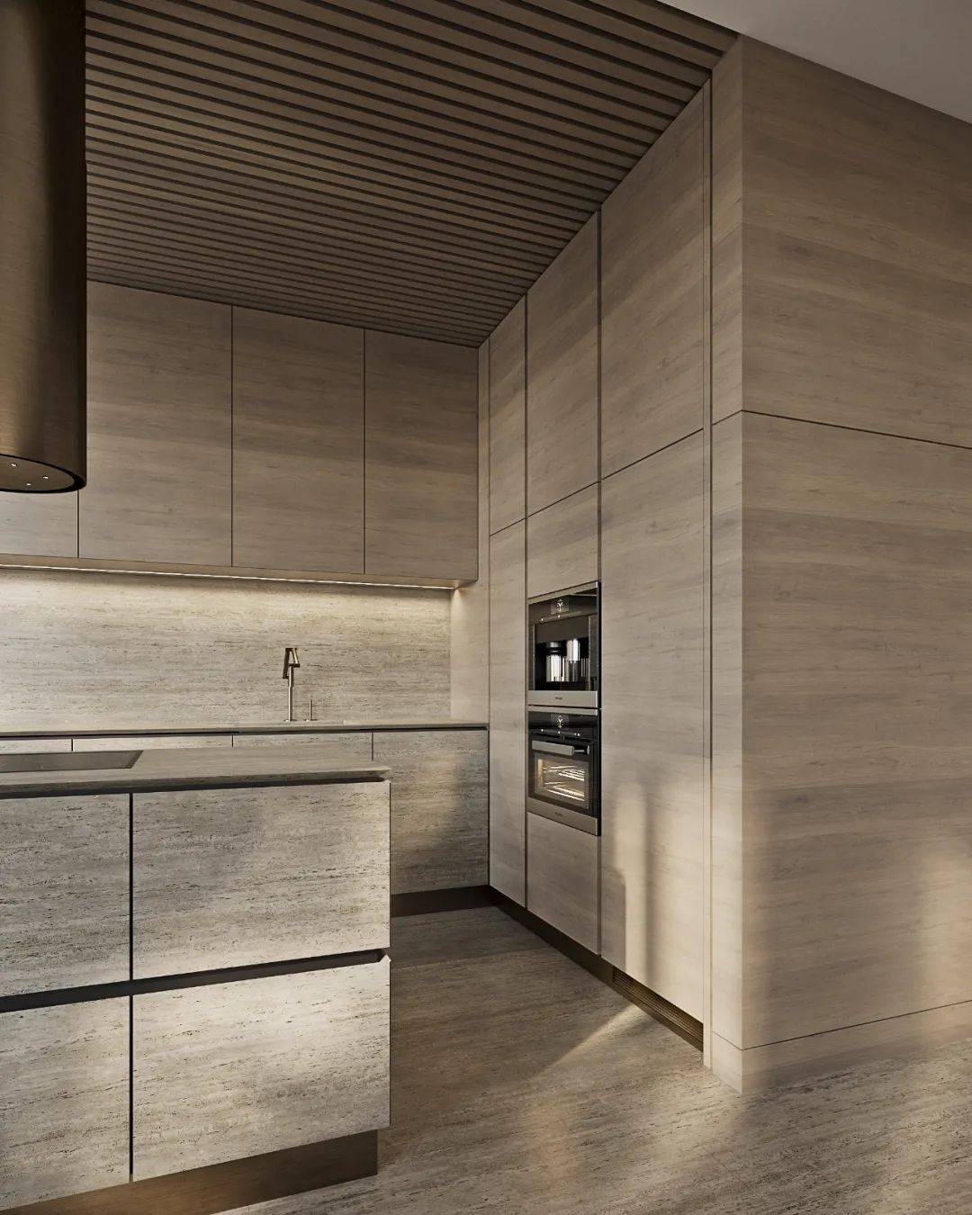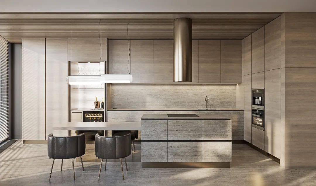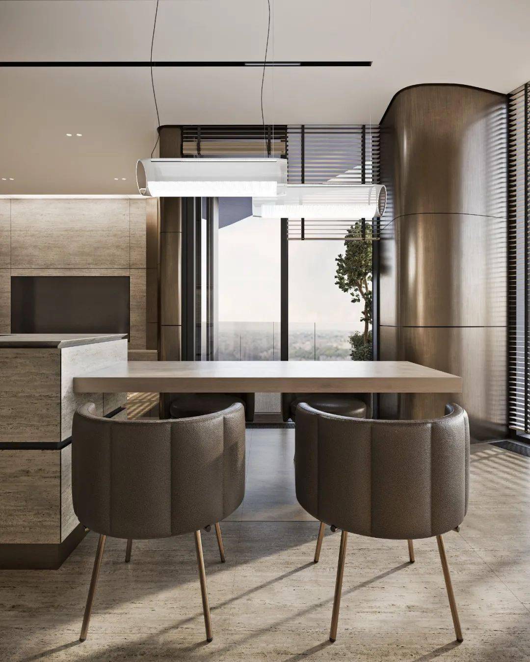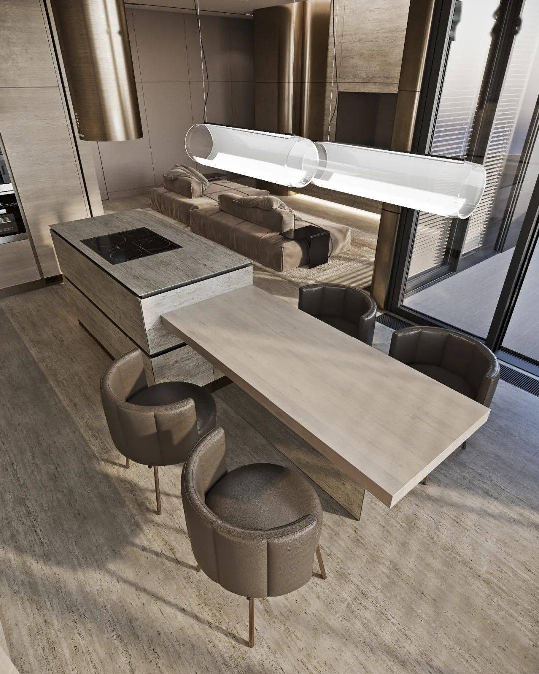 极简的空间里,加以木色渲染,舒缓而闲适,丰富的纹理填充带来流动化的视觉感知,交迭出更为舒适、温雅的空间体验。 △客厅 简致的客厅,展现出舒适的空间氛围,大理石与金属饰面组成的电视背景墙,勾勒出奢美、沉稳的气质 ,置入低矮的沙发,在自然光的铺洒下,铺叙出温馨之感。 △餐厨房 厨房与餐厅相互连通,L型的橱柜系统,以木、岩板、玻璃进行贯穿,无把手的柜体立面,秩序与质感兼具,岩板岛台延伸至木质餐桌,堆叠出温暖静谧的时光。 △衣帽间 简洁的衣帽间,墙柜一体的定制形式,简约又充满个性,格栅与吊柜的嵌入,打破了视觉平面的单调,方便了收纳,也拓展了空间。 △卫生间 卫生间延续整体的基调,温润的纹理与极简的线条排布,将空间带入恬静的氛围之中,圆柱体的洗手台设计,展露出简而具质感的高定原则。 其它案例 ▼ △门厅 门厅处设计了走入式衣帽间,透明的玻璃拉开了低调舒缓的生活节奏,错落分布的收纳区域,满足日常收纳需求。 △客厅 开放式的客厅,简中带奢,将优雅、精致完全释放,低矮的大理石茶几,个性的吊灯,升华了轻奢的格调,营造出一个有品质的休憩空间。 △厨房 橱柜系统以木铺地,有序的线条切割,舒适的饰面,简致又彰显大气,温润的木饰面与大理石在岛台进一步延伸,呈现沉稳高级的视觉。 △餐厅 餐厅空间以鱼骨拼接地板为基底,岩石墙面做装饰,嵌入岩板餐桌、双色餐椅为视觉调和,内敛中彰显优雅本性。 △楼梯 玻璃与金属板堆叠出简约且精致的楼梯空间,木饰面作护墙,艺术吊灯垂坠而下,赋予了空间艺术之美,彰显通透、摩登。 △休息区 轻简的电视墙柜,以极简的木饰面呈现,赋予了空间更平静、更舒适的视觉体验,镂空设计,大理石的融入,抓取视觉焦点,打破沉闷的家装设计。