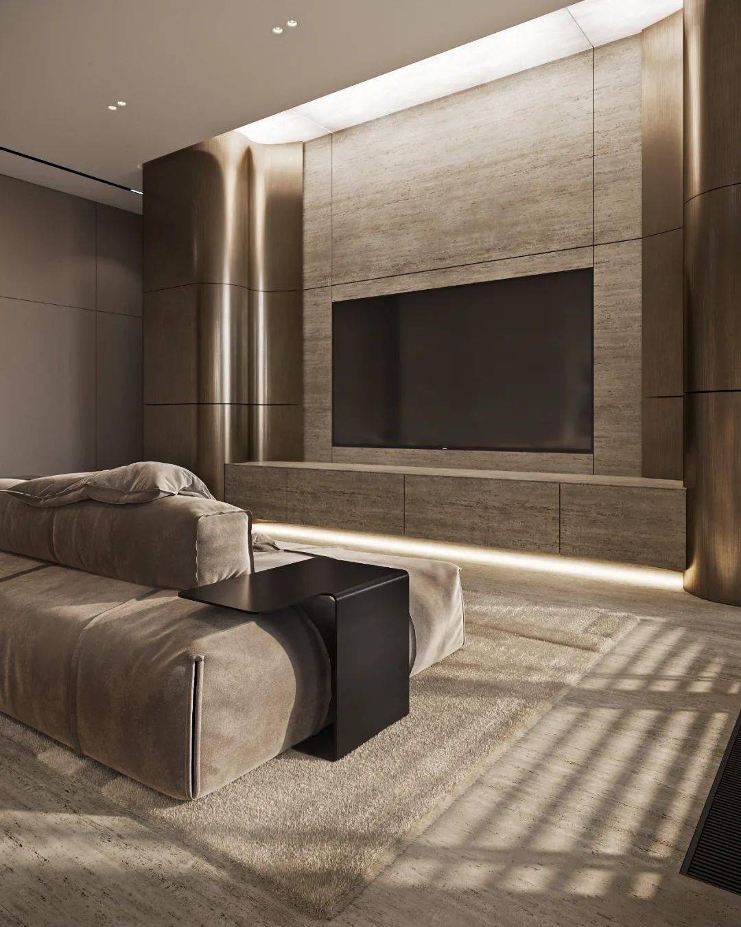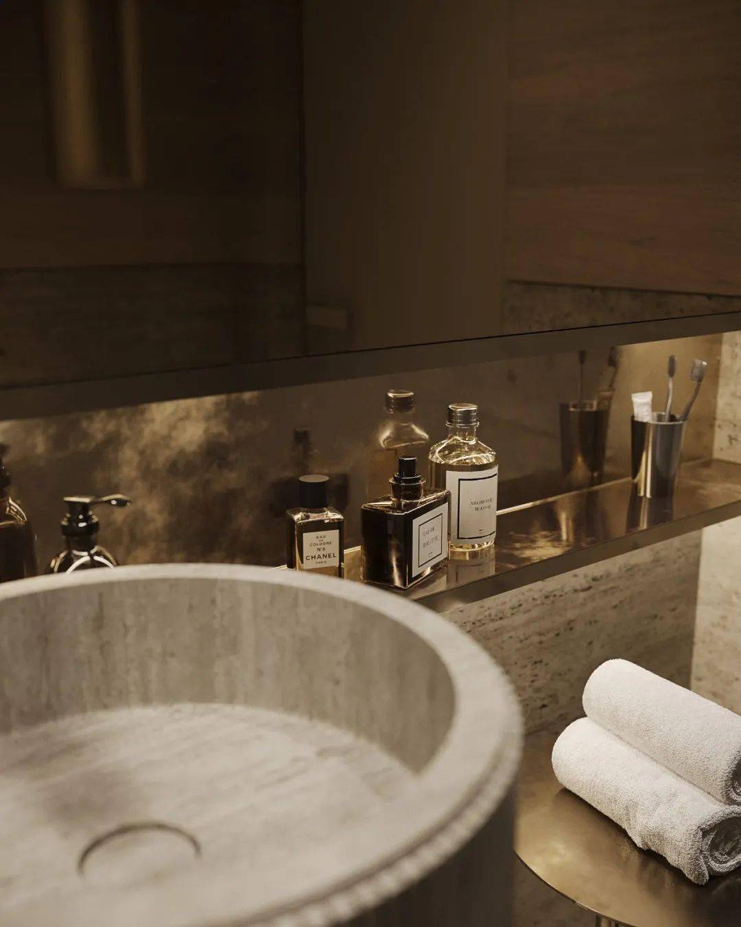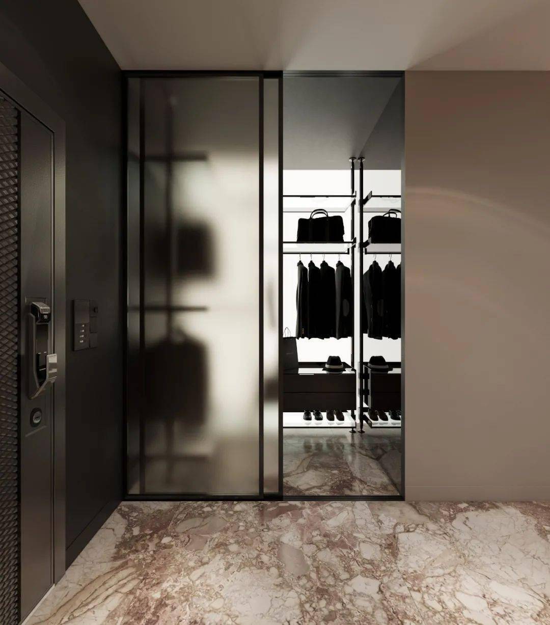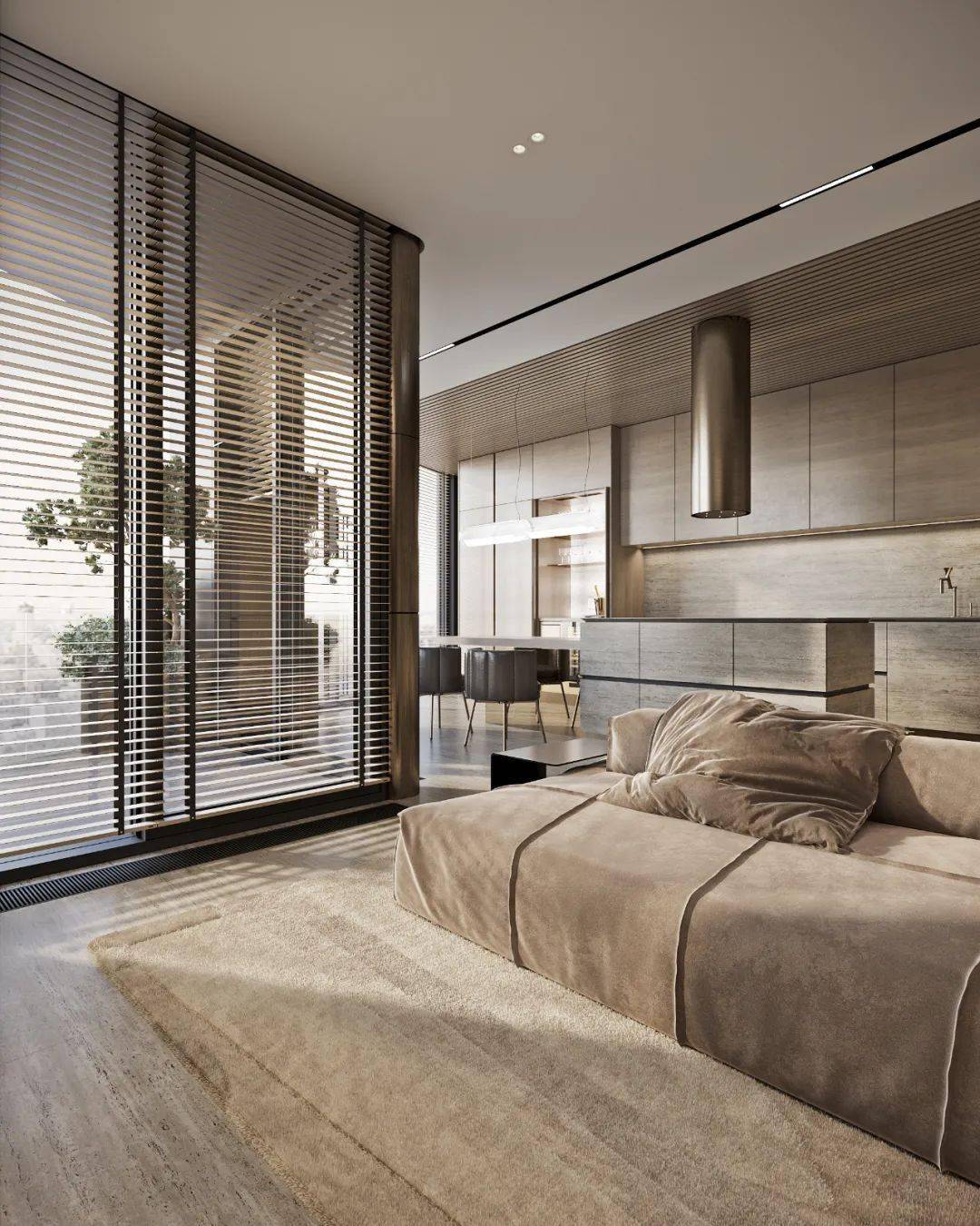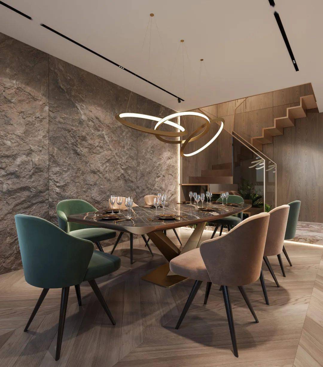 极简的空间里,加以木色渲染,舒缓而闲适,丰富的纹理填充带来流动化的视觉感知,交迭出更为舒适、温雅的空间体验。 △客厅 简致的客厅,展现出舒适的空间氛围,大理石与金属饰面组成的电视背景墙,勾勒出奢美、沉稳的气质 ,置入低矮的沙发,在自然光的铺洒下,铺叙出温馨之感。 △餐厨房 厨房与餐厅相互连通,L型的橱柜系统,以木、岩板、玻璃进行贯穿,无把手的柜体立面,秩序与质感兼具,岩板岛台延伸至木质餐桌,堆叠出温暖静谧的时光。 △衣帽间 简洁的衣帽间,墙柜一体的定制形式,简约又充满个性,格栅与吊柜的嵌入,打破了视觉平面的单调,方便了收纳,也拓展了空间。 △卫生间 卫生间延续整体的基调,温润的纹理与极简的线条排布,将空间带入恬静的氛围之中,圆柱体的洗手台设计,展露出简而具质感的高定原则。 其它案例 ▼ △门厅 门厅处设计了走入式衣帽间,透明的玻璃拉开了低调舒缓的生活节奏,错落分布的收纳区域,满足日常收纳需求。 △客厅 开放式的客厅,简中带奢,将优雅、精致完全释放,低矮的大理石茶几,个性的吊灯,升华了轻奢的格调,营造出一个有品质的休憩空间。 △厨房 橱柜系统以木铺地,有序的线条切割,舒适的饰面,简致又彰显大气,温润的木饰面与大理石在岛台进一步延伸,呈现沉稳高级的视觉。 △餐厅 餐厅空间以鱼骨拼接地板为基底,岩石墙面做装饰,嵌入岩板餐桌、双色餐椅为视觉调和,内敛中彰显优雅本性。 △楼梯 玻璃与金属板堆叠出简约且精致的楼梯空间,木饰面作护墙,艺术吊灯垂坠而下,赋予了空间艺术之美,彰显通透、摩登。 △休息区 轻简的电视墙柜,以极简的木饰面呈现,赋予了空间更平静、更舒适的视觉体验,镂空设计,大理石的融入,抓取视觉焦点,打破沉闷的家装设计。