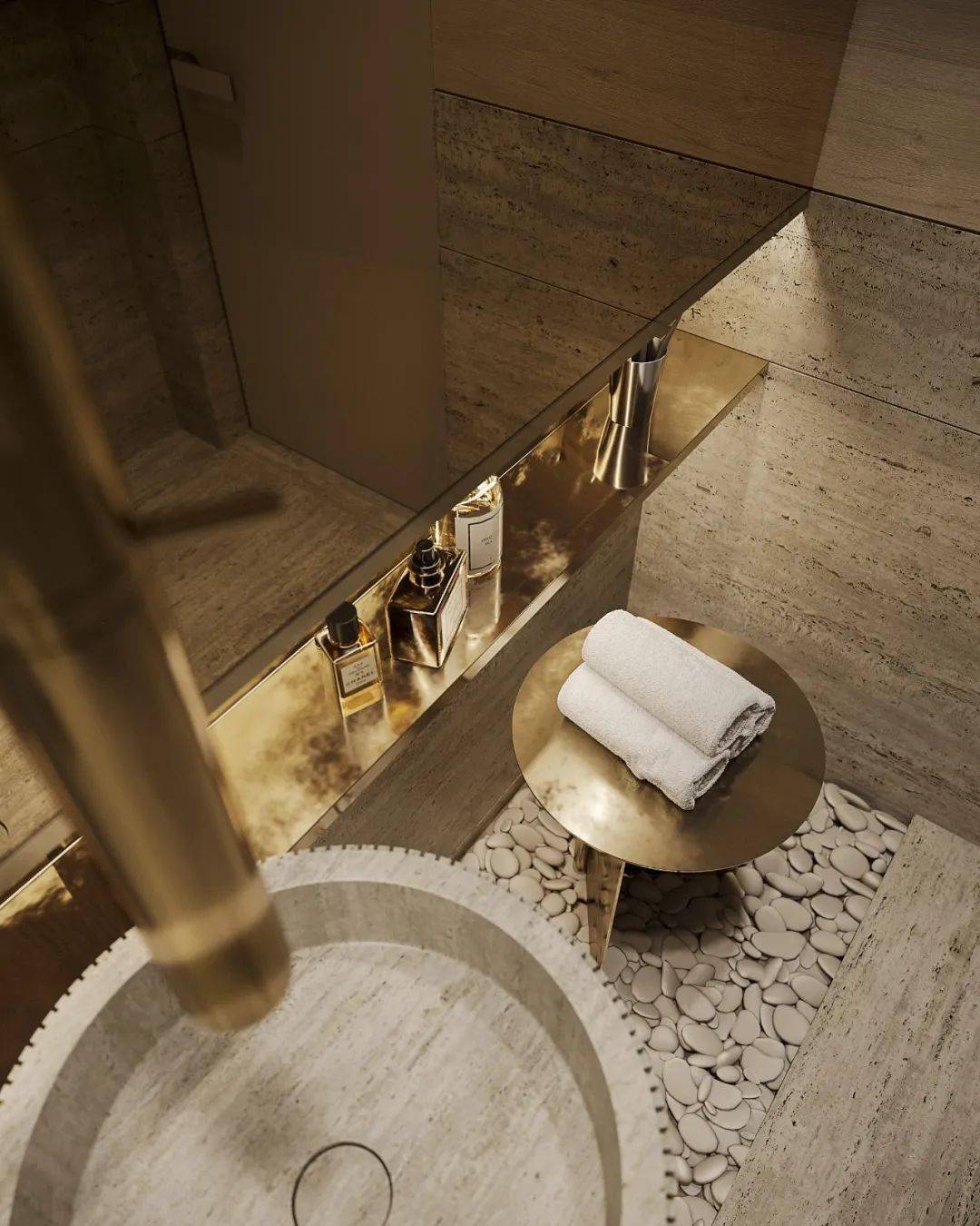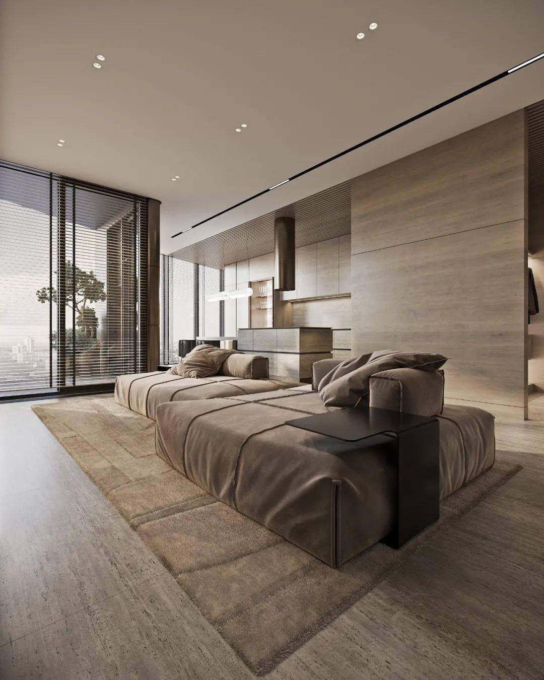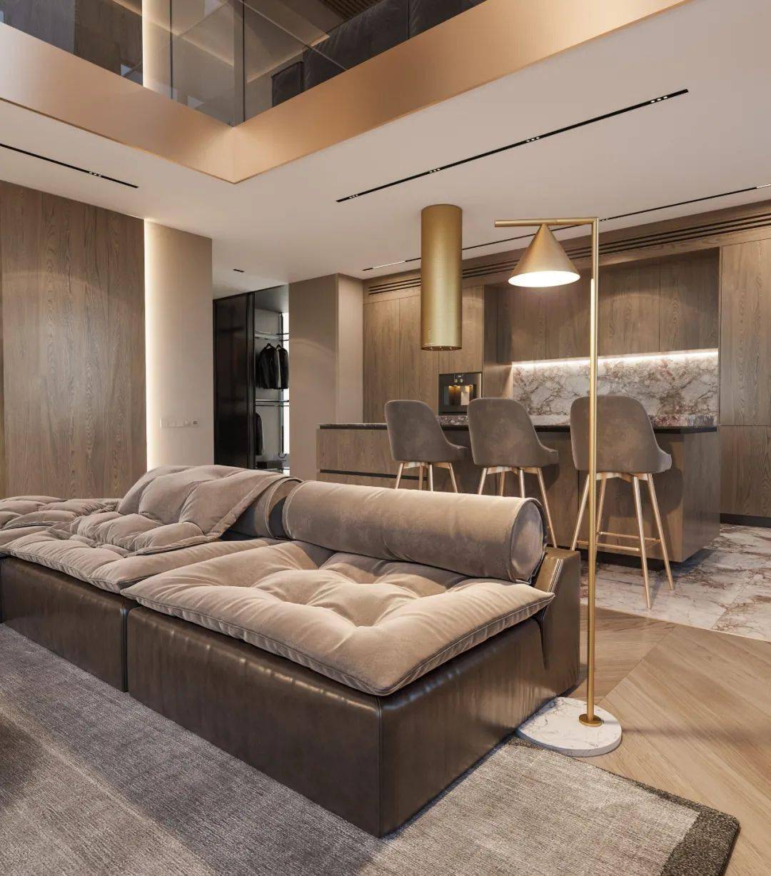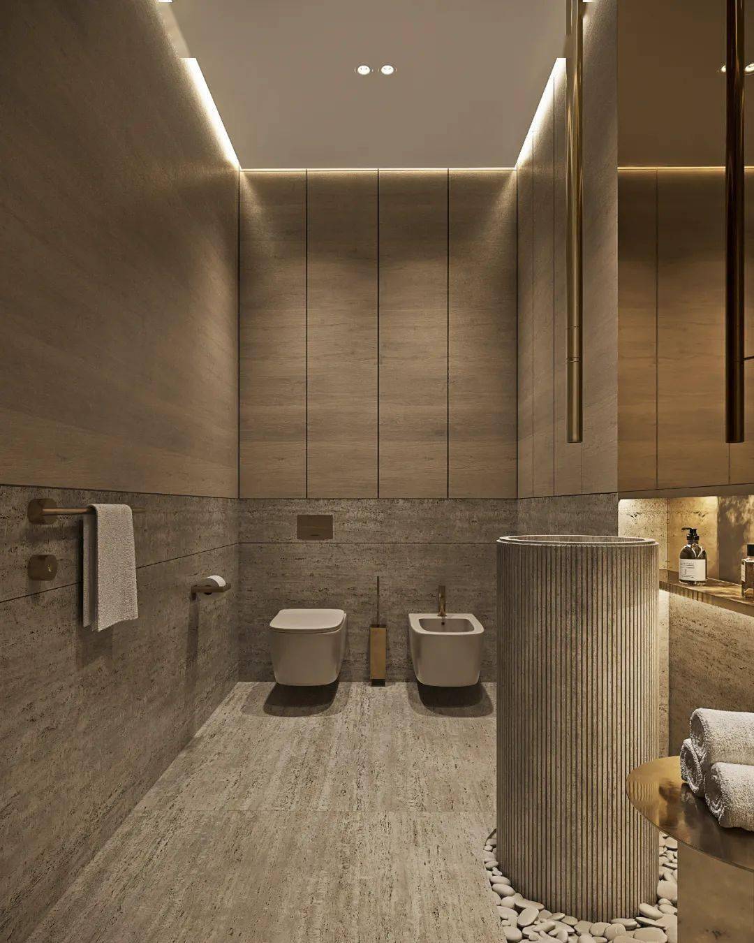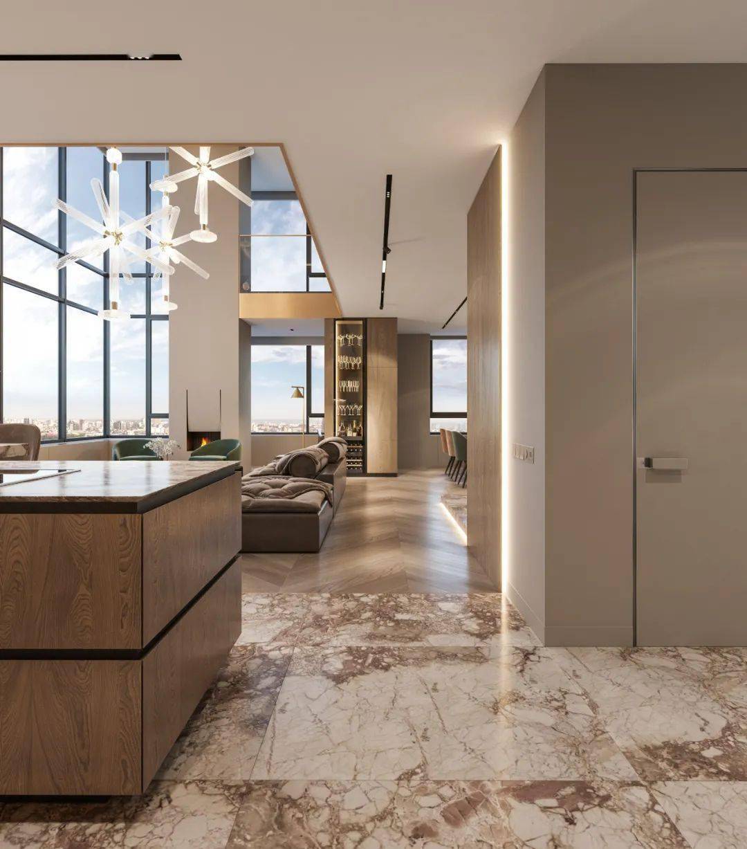 极简的空间里,加以木色渲染,舒缓而闲适,丰富的纹理填充带来流动化的视觉感知,交迭出更为舒适、温雅的空间体验。 △客厅 简致的客厅,展现出舒适的空间氛围,大理石与金属饰面组成的电视背景墙,勾勒出奢美、沉稳的气质 ,置入低矮的沙发,在自然光的铺洒下,铺叙出温馨之感。 △餐厨房 厨房与餐厅相互连通,L型的橱柜系统,以木、岩板、玻璃进行贯穿,无把手的柜体立面,秩序与质感兼具,岩板岛台延伸至木质餐桌,堆叠出温暖静谧的时光。 △衣帽间 简洁的衣帽间,墙柜一体的定制形式,简约又充满个性,格栅与吊柜的嵌入,打破了视觉平面的单调,方便了收纳,也拓展了空间。 △卫生间 卫生间延续整体的基调,温润的纹理与极简的线条排布,将空间带入恬静的氛围之中,圆柱体的洗手台设计,展露出简而具质感的高定原则。 其它案例 ▼ △门厅 门厅处设计了走入式衣帽间,透明的玻璃拉开了低调舒缓的生活节奏,错落分布的收纳区域,满足日常收纳需求。 △客厅 开放式的客厅,简中带奢,将优雅、精致完全释放,低矮的大理石茶几,个性的吊灯,升华了轻奢的格调,营造出一个有品质的休憩空间。 △厨房 橱柜系统以木铺地,有序的线条切割,舒适的饰面,简致又彰显大气,温润的木饰面与大理石在岛台进一步延伸,呈现沉稳高级的视觉。 △餐厅 餐厅空间以鱼骨拼接地板为基底,岩石墙面做装饰,嵌入岩板餐桌、双色餐椅为视觉调和,内敛中彰显优雅本性。 △楼梯 玻璃与金属板堆叠出简约且精致的楼梯空间,木饰面作护墙,艺术吊灯垂坠而下,赋予了空间艺术之美,彰显通透、摩登。 △休息区 轻简的电视墙柜,以极简的木饰面呈现,赋予了空间更平静、更舒适的视觉体验,镂空设计,大理石的融入,抓取视觉焦点,打破沉闷的家装设计。