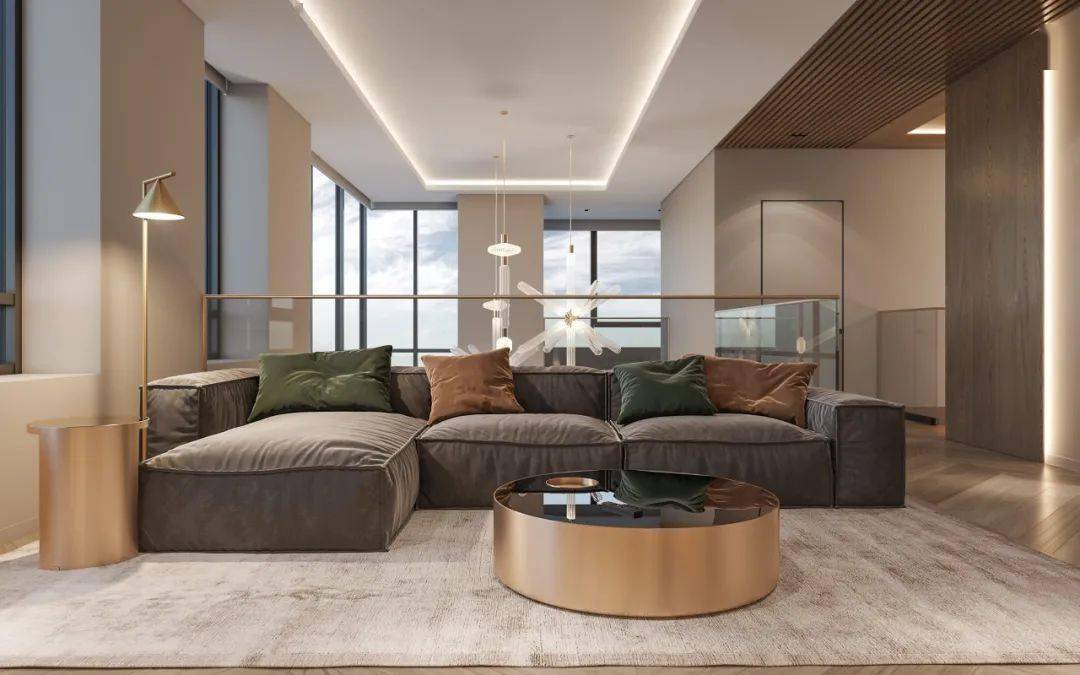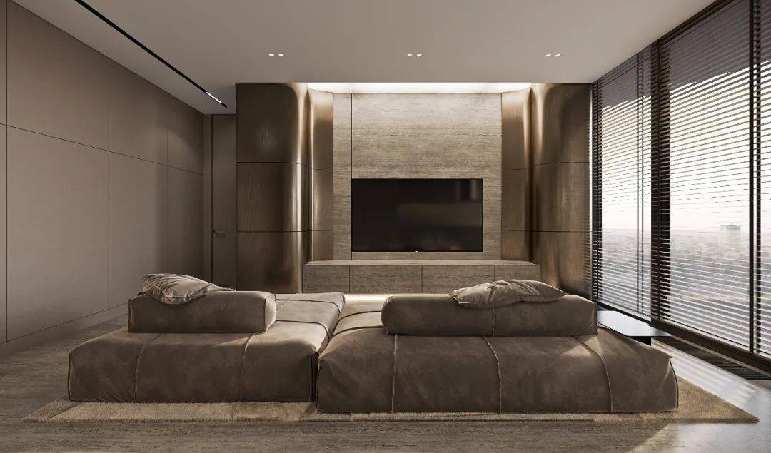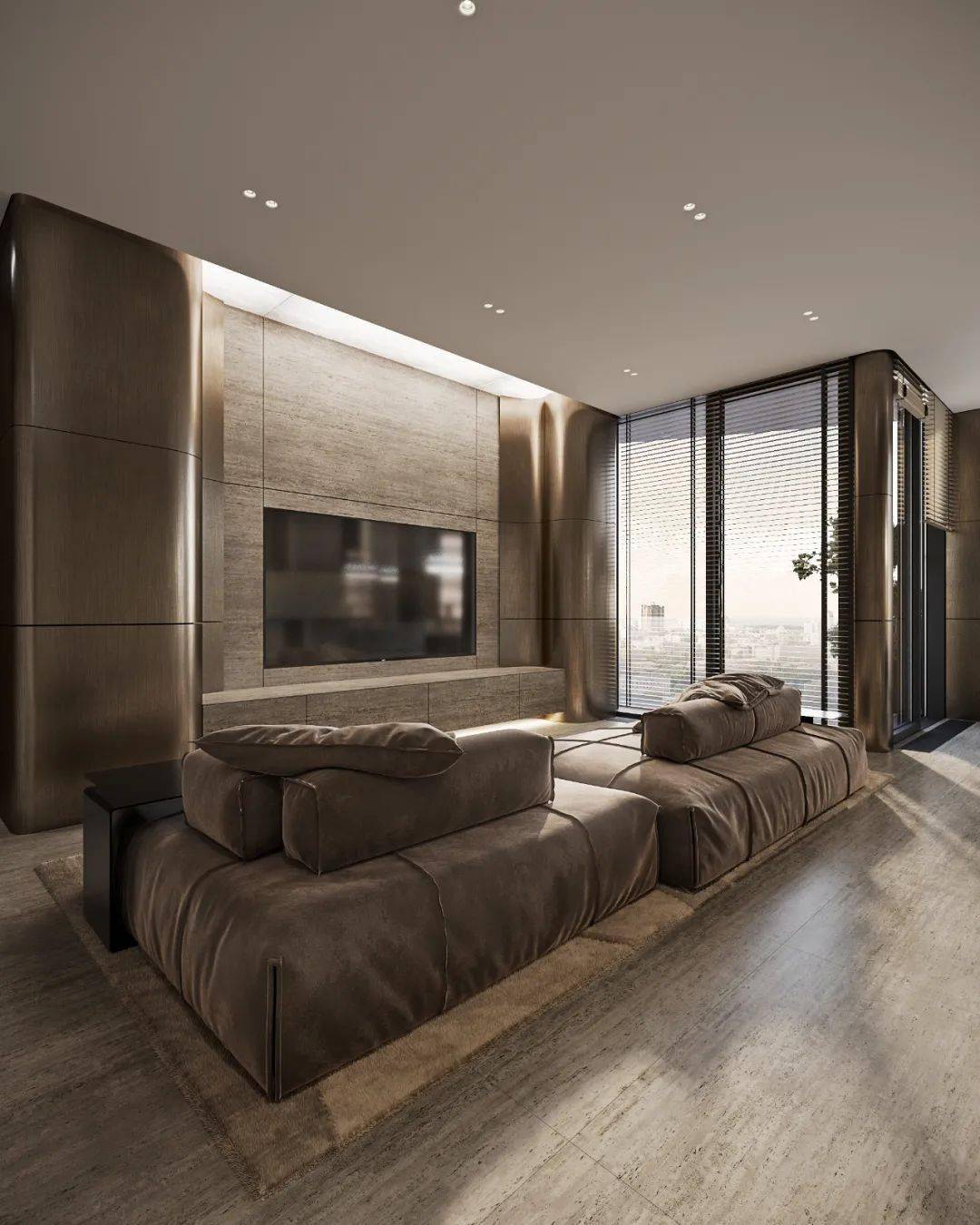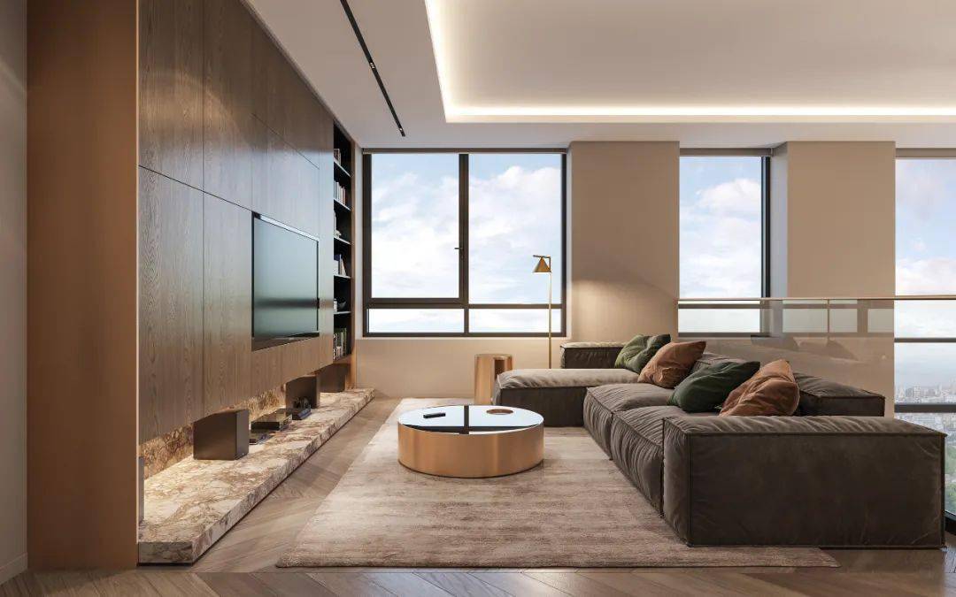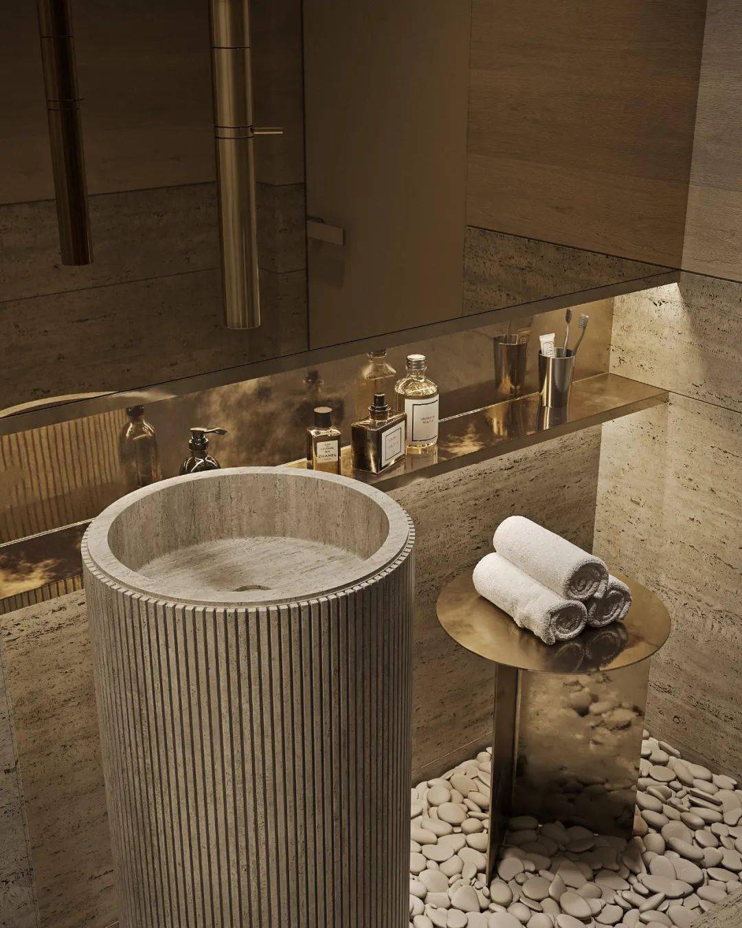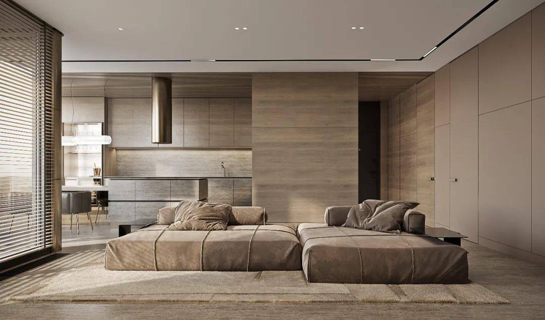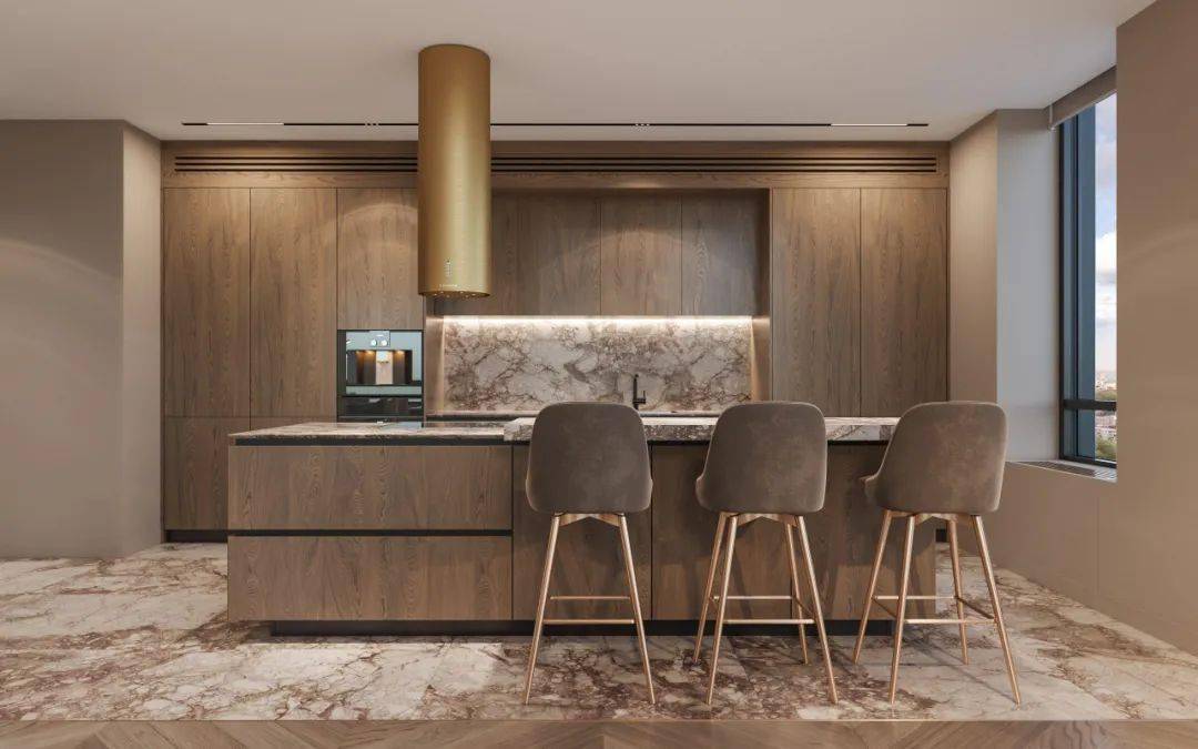 极简的空间里,加以木色渲染,舒缓而闲适,丰富的纹理填充带来流动化的视觉感知,交迭出更为舒适、温雅的空间体验。 △客厅 简致的客厅,展现出舒适的空间氛围,大理石与金属饰面组成的电视背景墙,勾勒出奢美、沉稳的气质 ,置入低矮的沙发,在自然光的铺洒下,铺叙出温馨之感。 △餐厨房 厨房与餐厅相互连通,L型的橱柜系统,以木、岩板、玻璃进行贯穿,无把手的柜体立面,秩序与质感兼具,岩板岛台延伸至木质餐桌,堆叠出温暖静谧的时光。 △衣帽间 简洁的衣帽间,墙柜一体的定制形式,简约又充满个性,格栅与吊柜的嵌入,打破了视觉平面的单调,方便了收纳,也拓展了空间。 △卫生间 卫生间延续整体的基调,温润的纹理与极简的线条排布,将空间带入恬静的氛围之中,圆柱体的洗手台设计,展露出简而具质感的高定原则。 其它案例 ▼ △门厅 门厅处设计了走入式衣帽间,透明的玻璃拉开了低调舒缓的生活节奏,错落分布的收纳区域,满足日常收纳需求。 △客厅 开放式的客厅,简中带奢,将优雅、精致完全释放,低矮的大理石茶几,个性的吊灯,升华了轻奢的格调,营造出一个有品质的休憩空间。 △厨房 橱柜系统以木铺地,有序的线条切割,舒适的饰面,简致又彰显大气,温润的木饰面与大理石在岛台进一步延伸,呈现沉稳高级的视觉。 △餐厅 餐厅空间以鱼骨拼接地板为基底,岩石墙面做装饰,嵌入岩板餐桌、双色餐椅为视觉调和,内敛中彰显优雅本性。 △楼梯 玻璃与金属板堆叠出简约且精致的楼梯空间,木饰面作护墙,艺术吊灯垂坠而下,赋予了空间艺术之美,彰显通透、摩登。 △休息区 轻简的电视墙柜,以极简的木饰面呈现,赋予了空间更平静、更舒适的视觉体验,镂空设计,大理石的融入,抓取视觉焦点,打破沉闷的家装设计。
